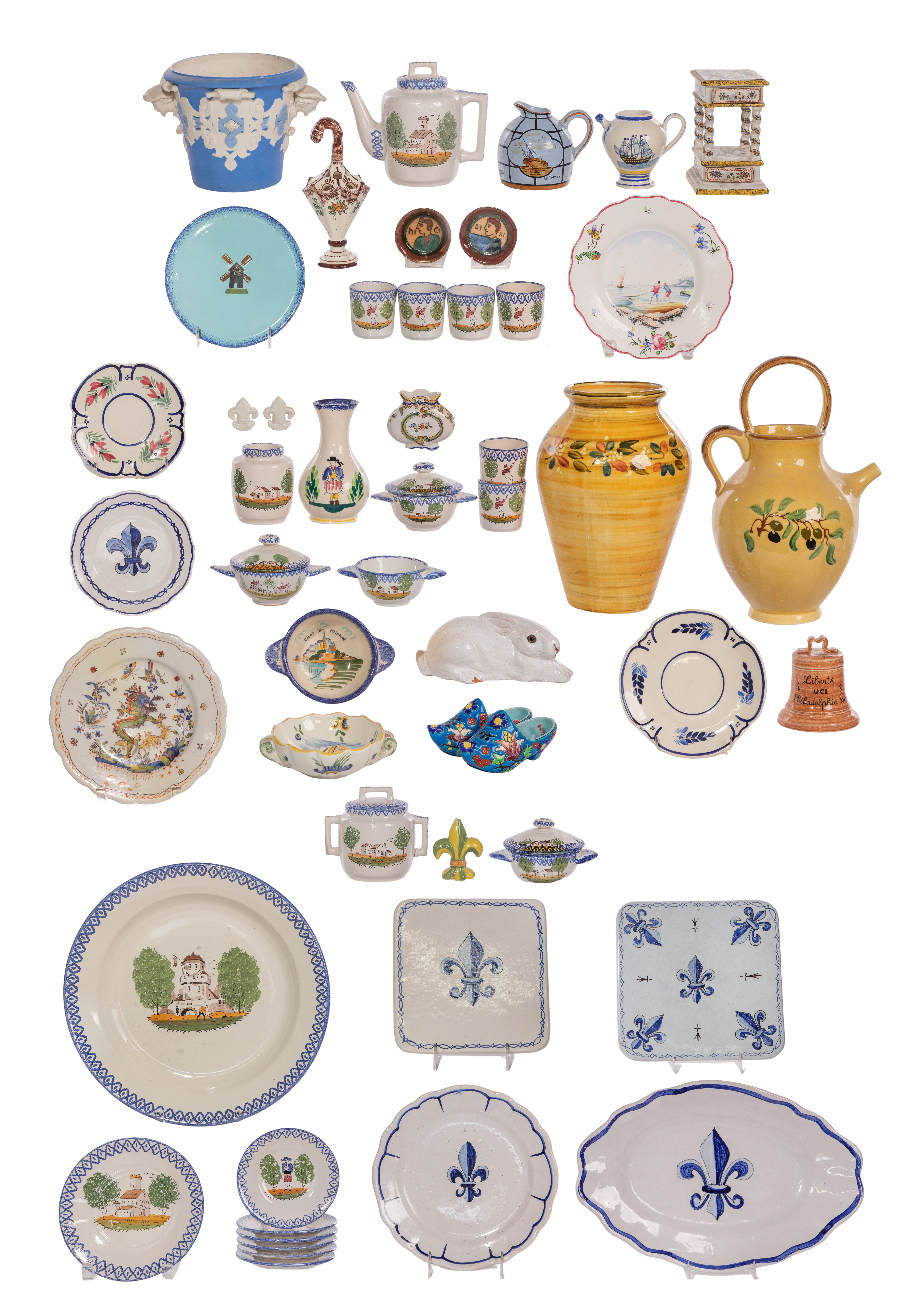 (45) items of various patterns from various makers, including platters, plates, pitchers, covered porringers, a teapot, a creamer, a sugar, a fleur de lis shaped salt, a pepper, an umbrella shaped tulipiere, a rabbit figurine and a pair of wooden shoes, most marked ‘France’ underside