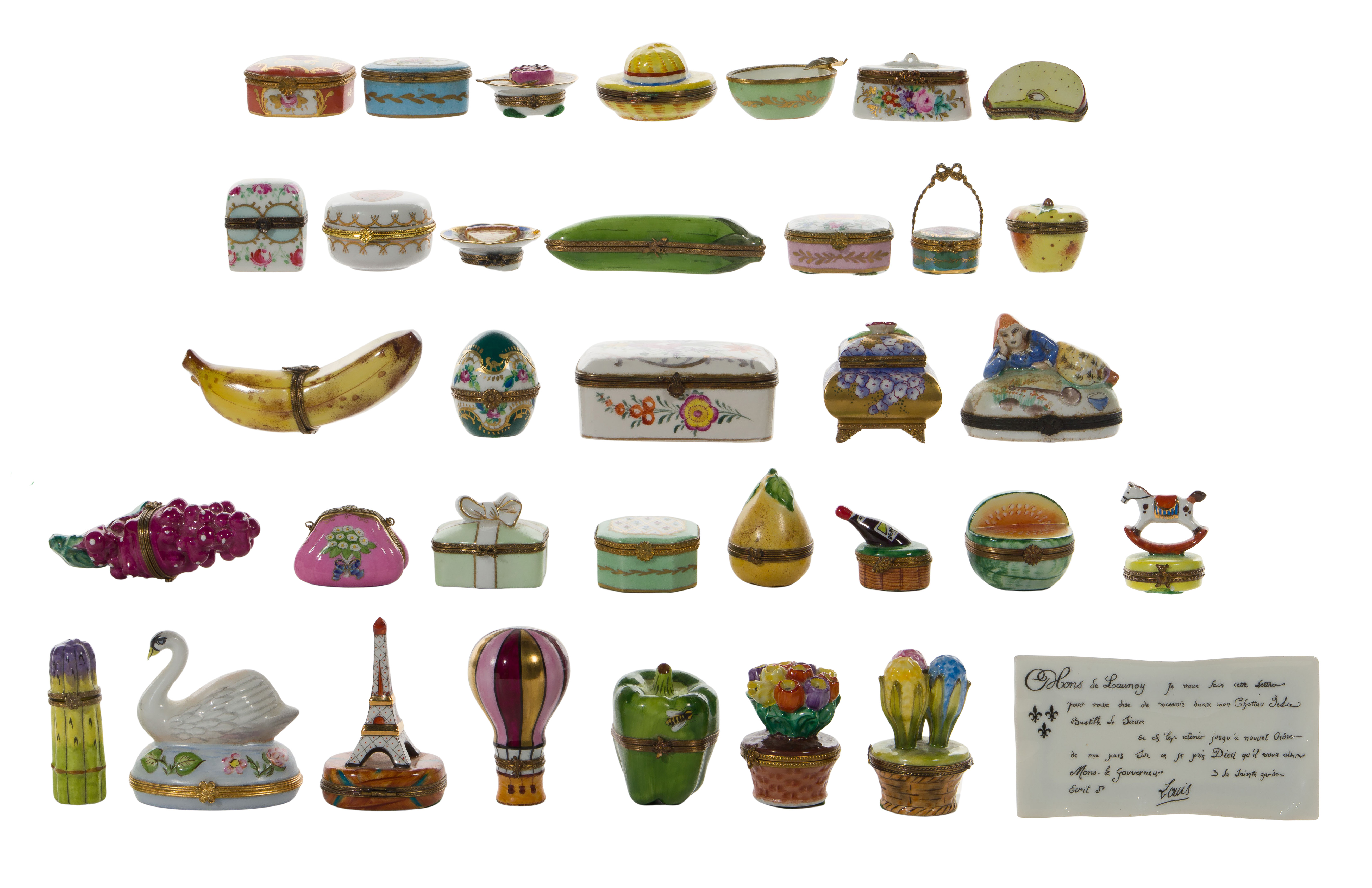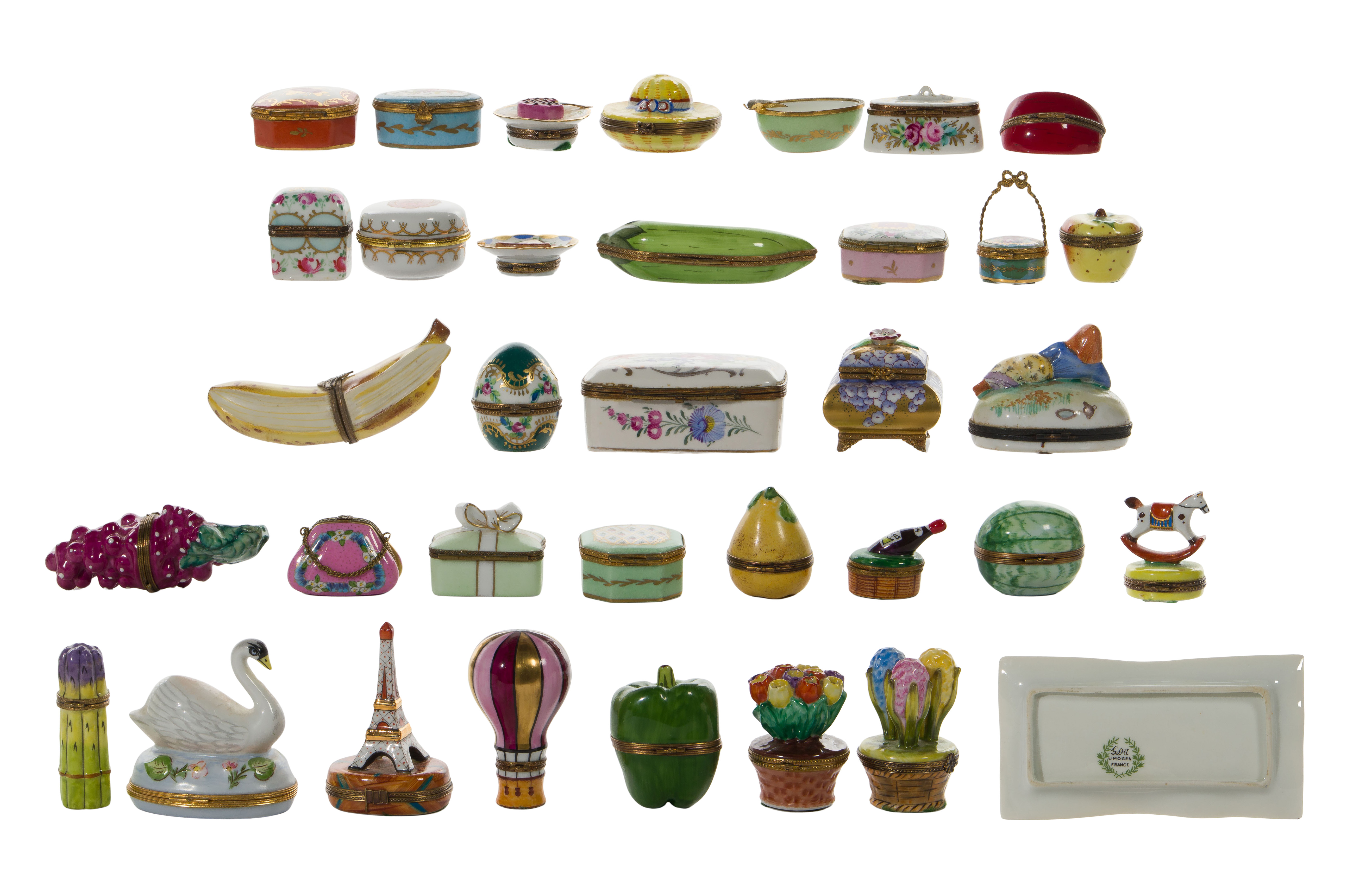 (35) total items including trinket boxes in various motifs and sizes, marked; together with a Limoges tray and a hinged trinket box having rose decoration with a Meissen style crossed swords mark underside