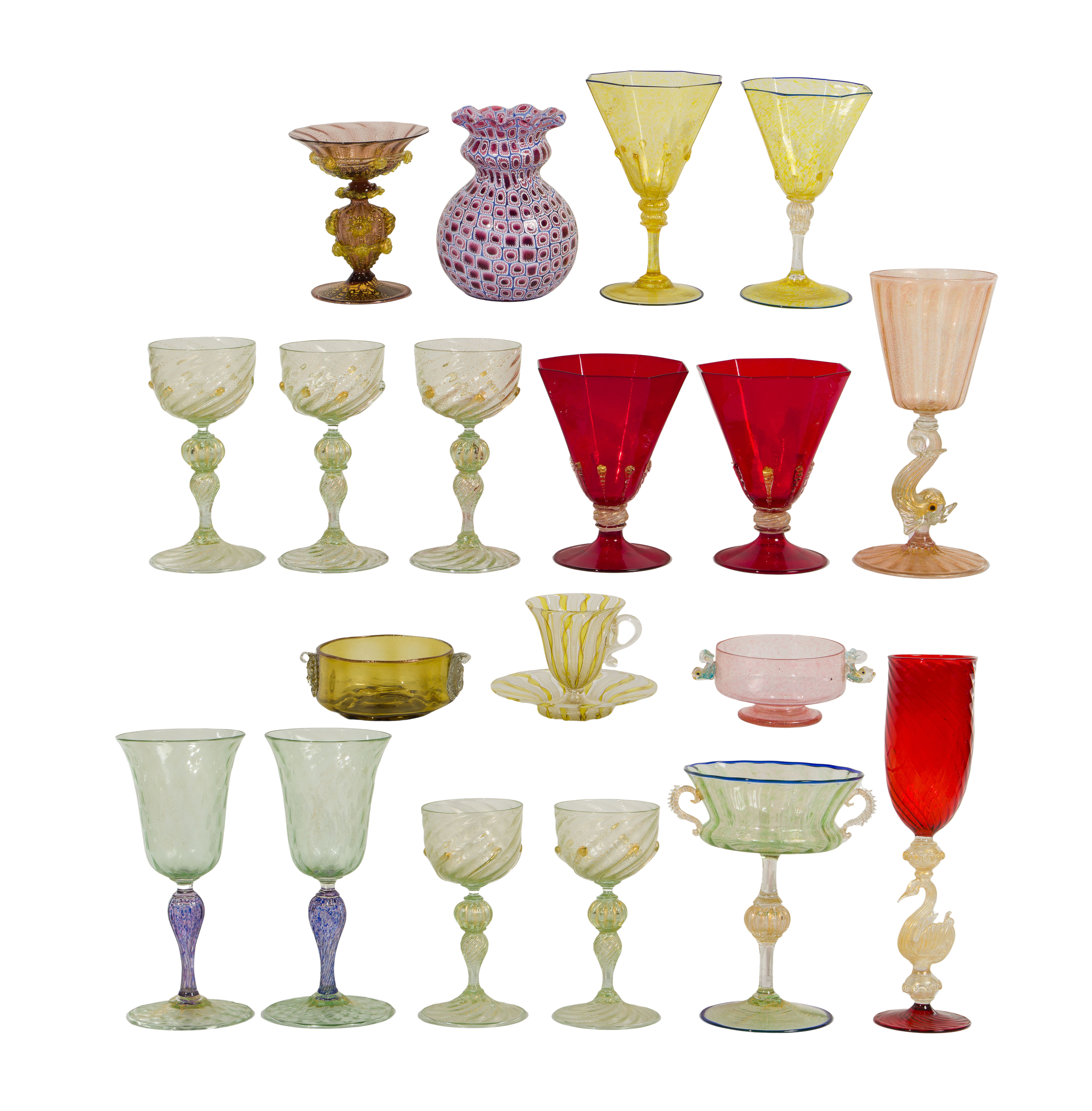 (19) items including a c.1900 latticino footed cup and saucer having a yellow ribbon design, a c.1890 raspberry and gold fleck tazza, (3) pairs of gold flecked wine glasses, a set of (5) clear and gold fleck wine glasses, all attributed to Salviati, a blue and red vase, a pair of red and gold octagonal glasses having an applied foot and a gold flecked orb as well as figural goblets, a tazza and bowls