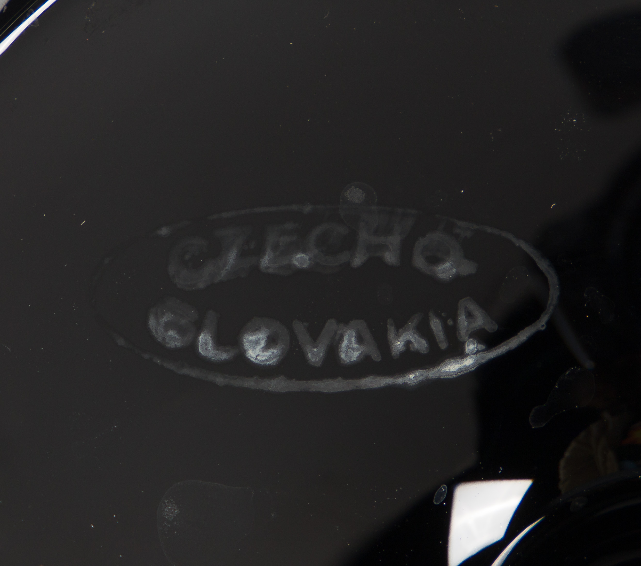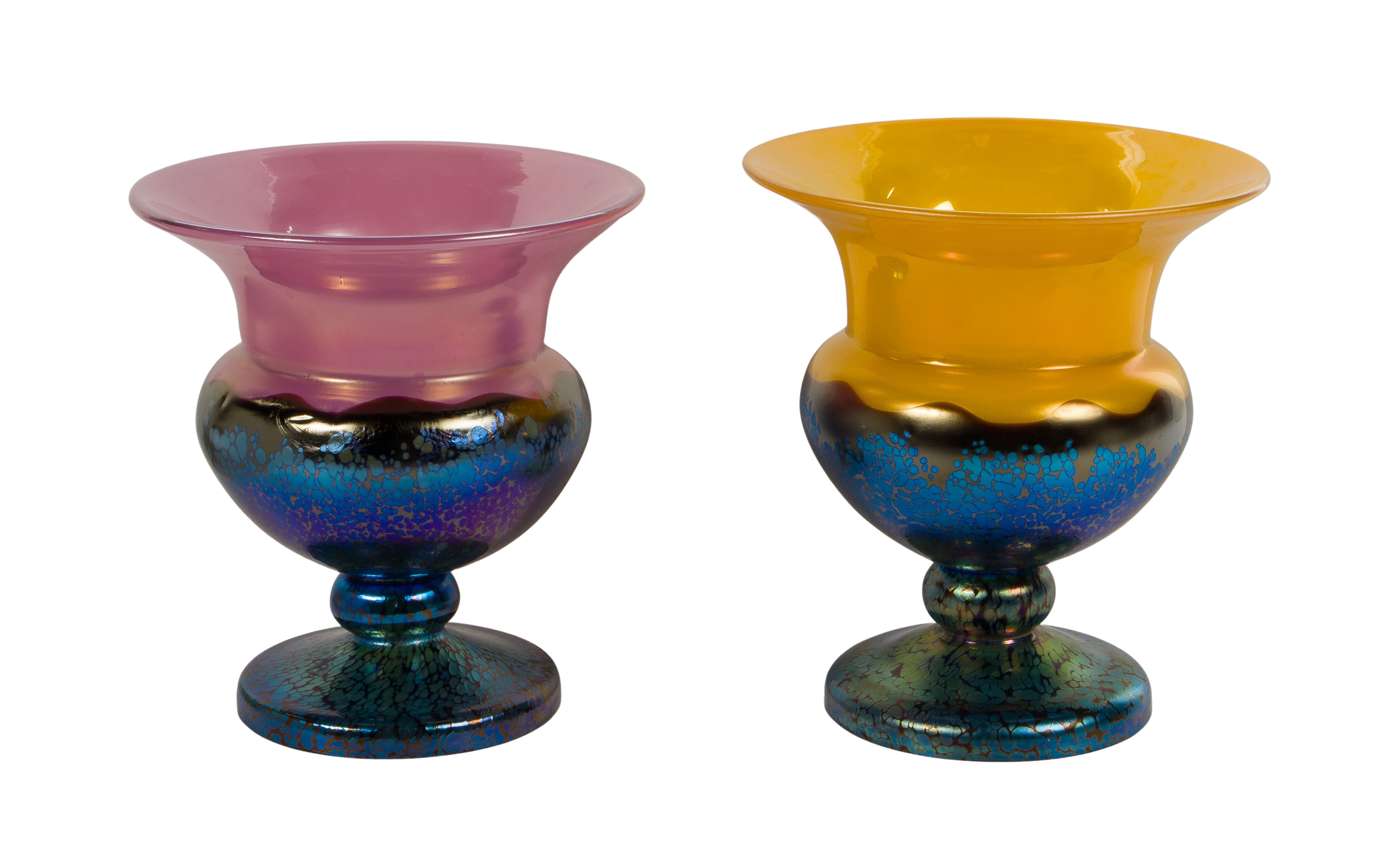 (2) items attributed to Michael Powlony having an opalescent colored glass ground (one purple, the other yellow) and cobalt papillon footed bottoms, acid etch ‘Czech’ oval mark on undersides