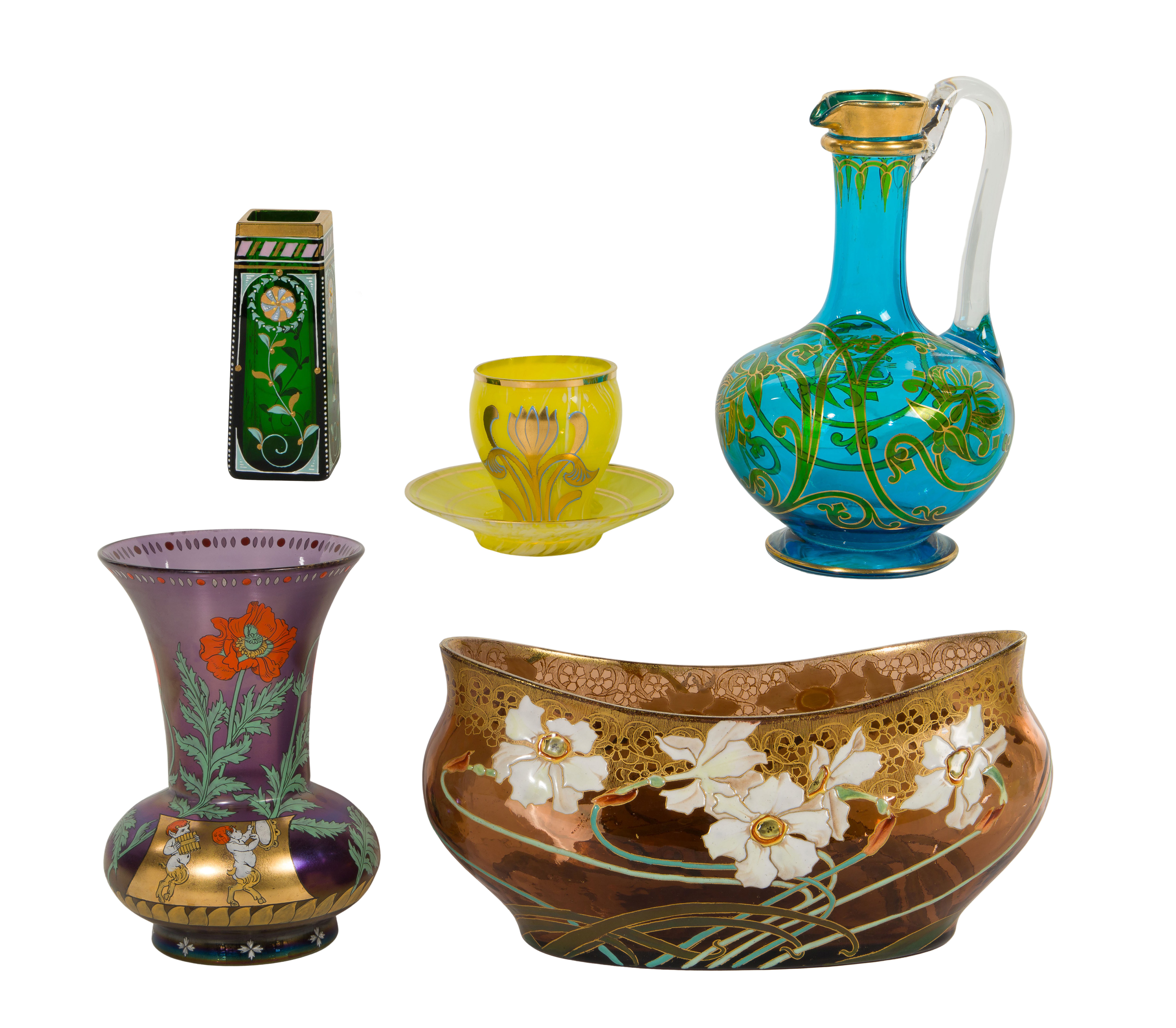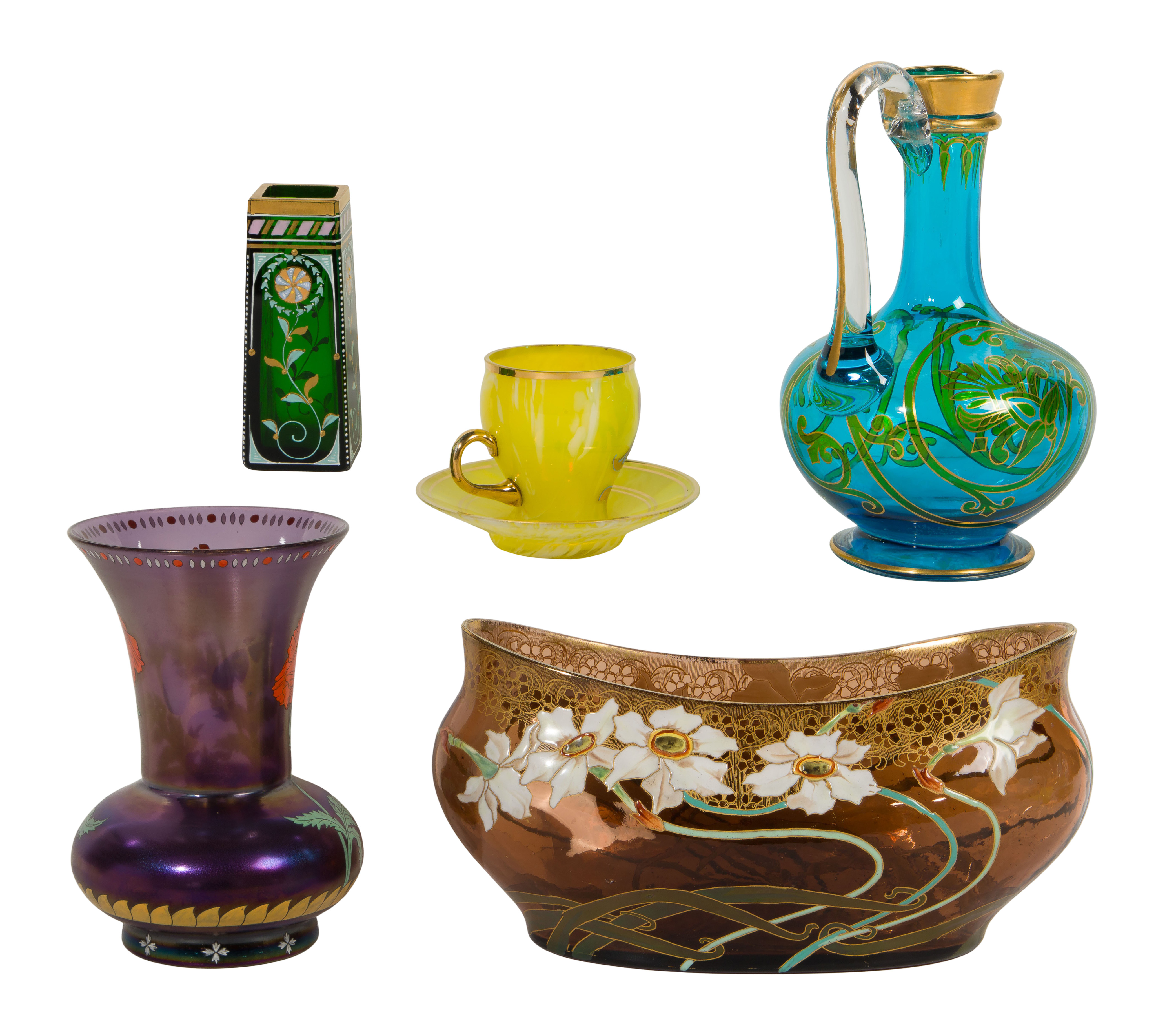 (5) items including a Fritz Heckert iridescent vase having a Max Rade design of orange poppies with gilt accents, an amber color planter having white enamel flowers with gilt accents attributed to Legras Montjoye as well as a teacup and saucer set, an enameled bud vase and a gilt accented ewer, some having illegible signatures