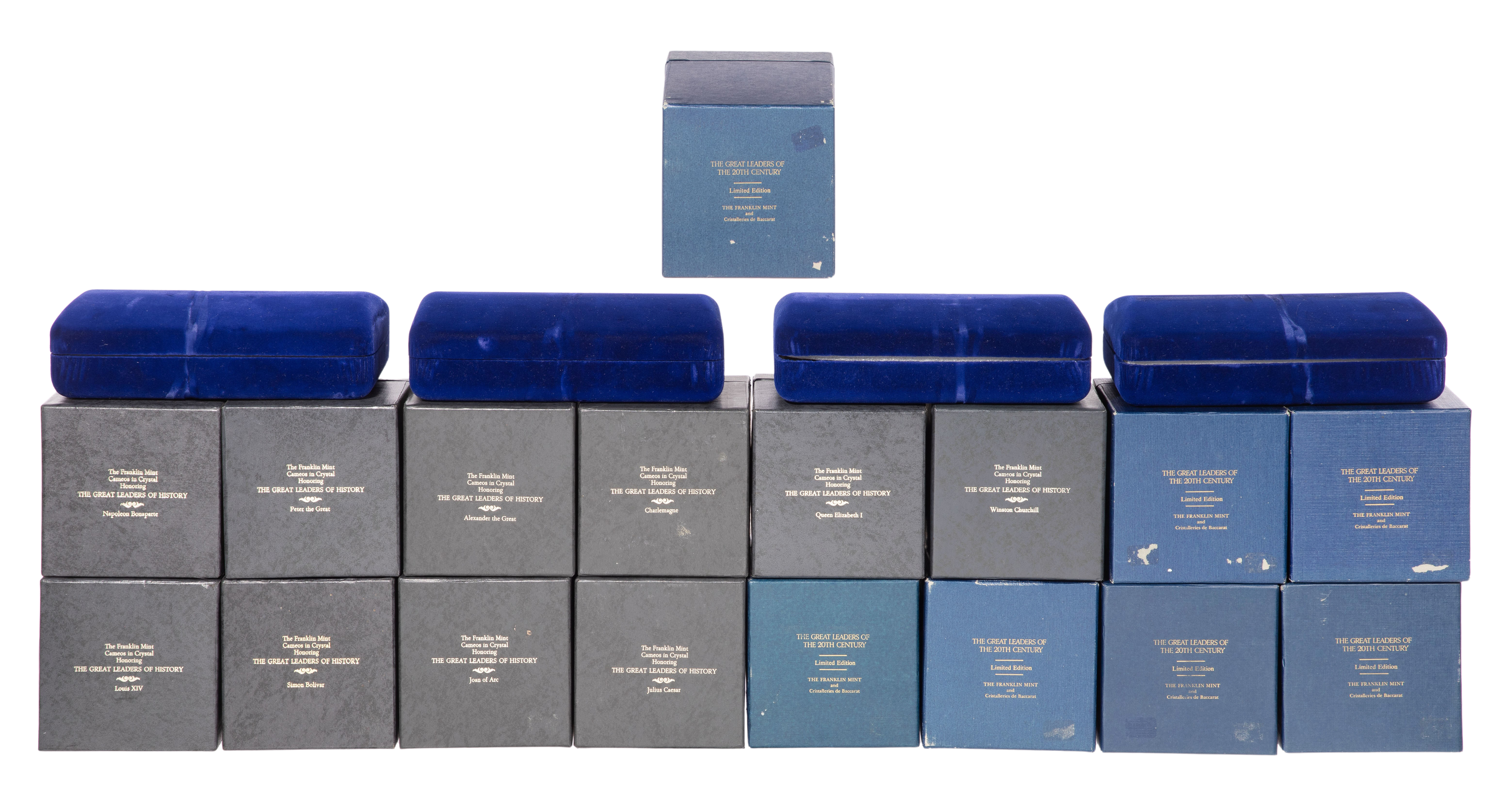 (21) items including (10) boxed ‘Great Leaders of History’ and (7) ‘The Great Leaders of the 20th Century’, all having stands and etched mark; together with (4) boxed pairs of the ‘Bicentennial Collection of Cameos in Crystal’, all etch marked ‘Cristal d’Albret’ on underside