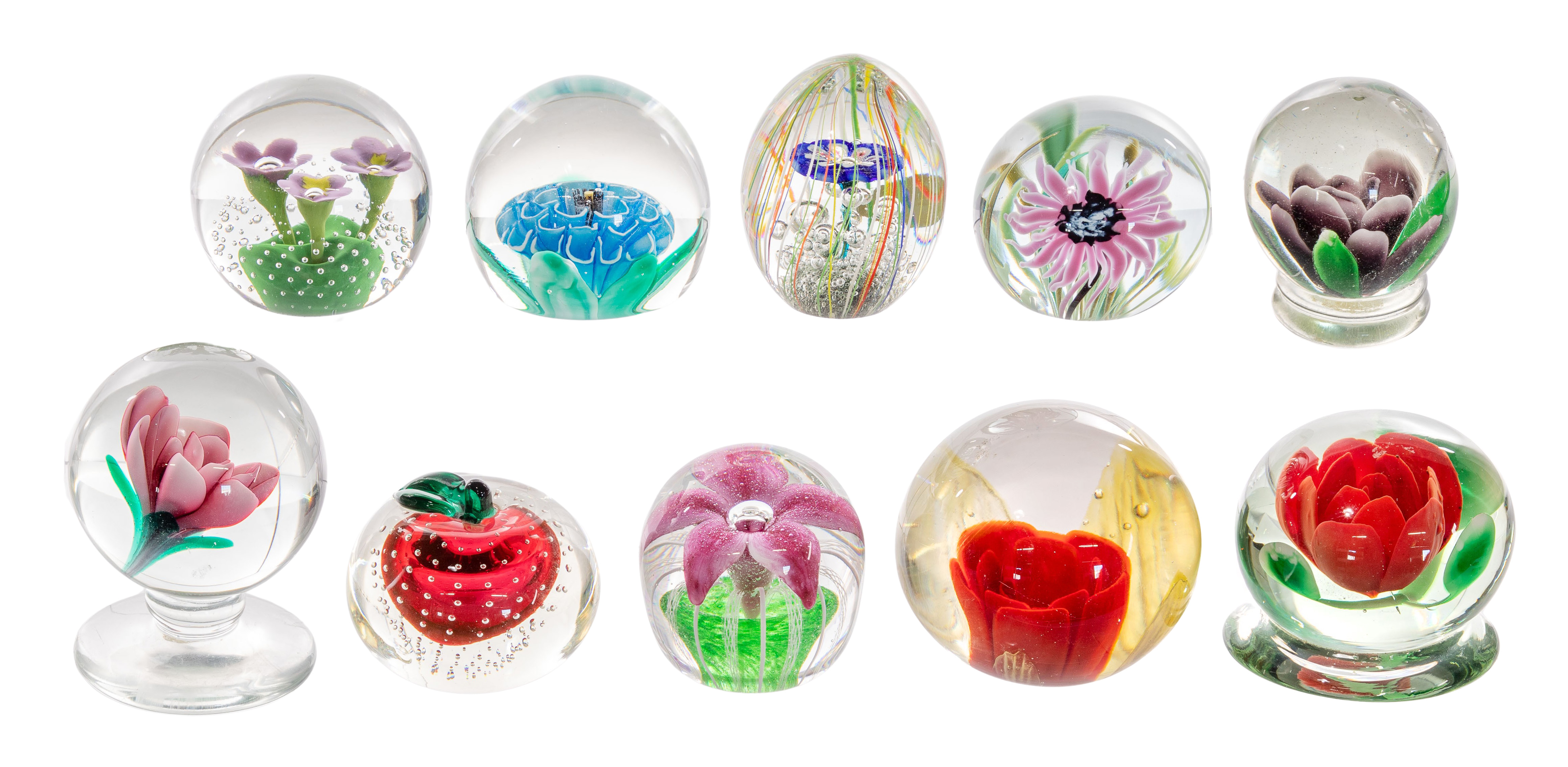 (10) items including (9) floral themed and an apple, including a Roberto Moretti rose motif having engraved signature and a cased strawberry having a label ‘Sommerville c.1930’, all others unsigned