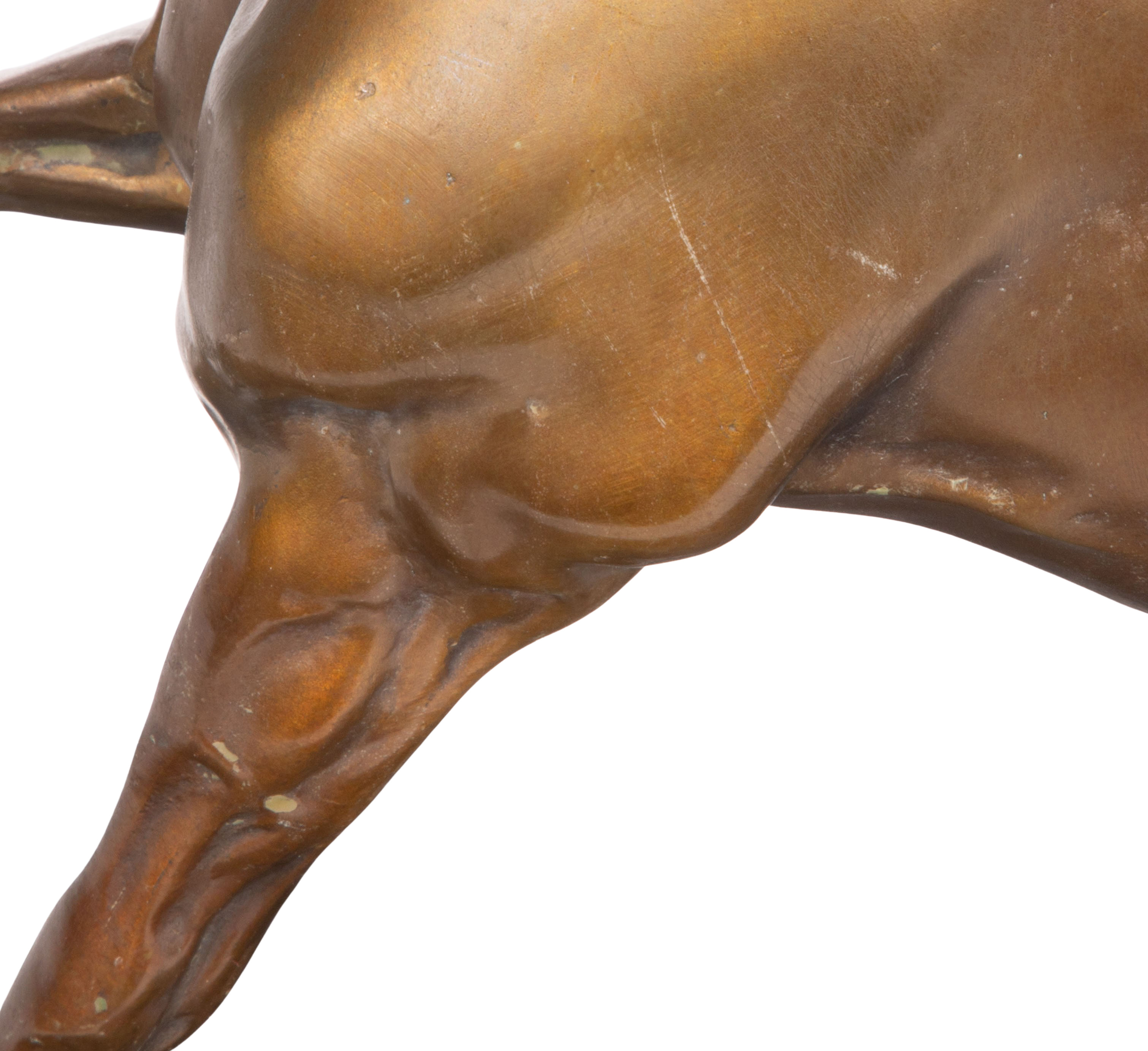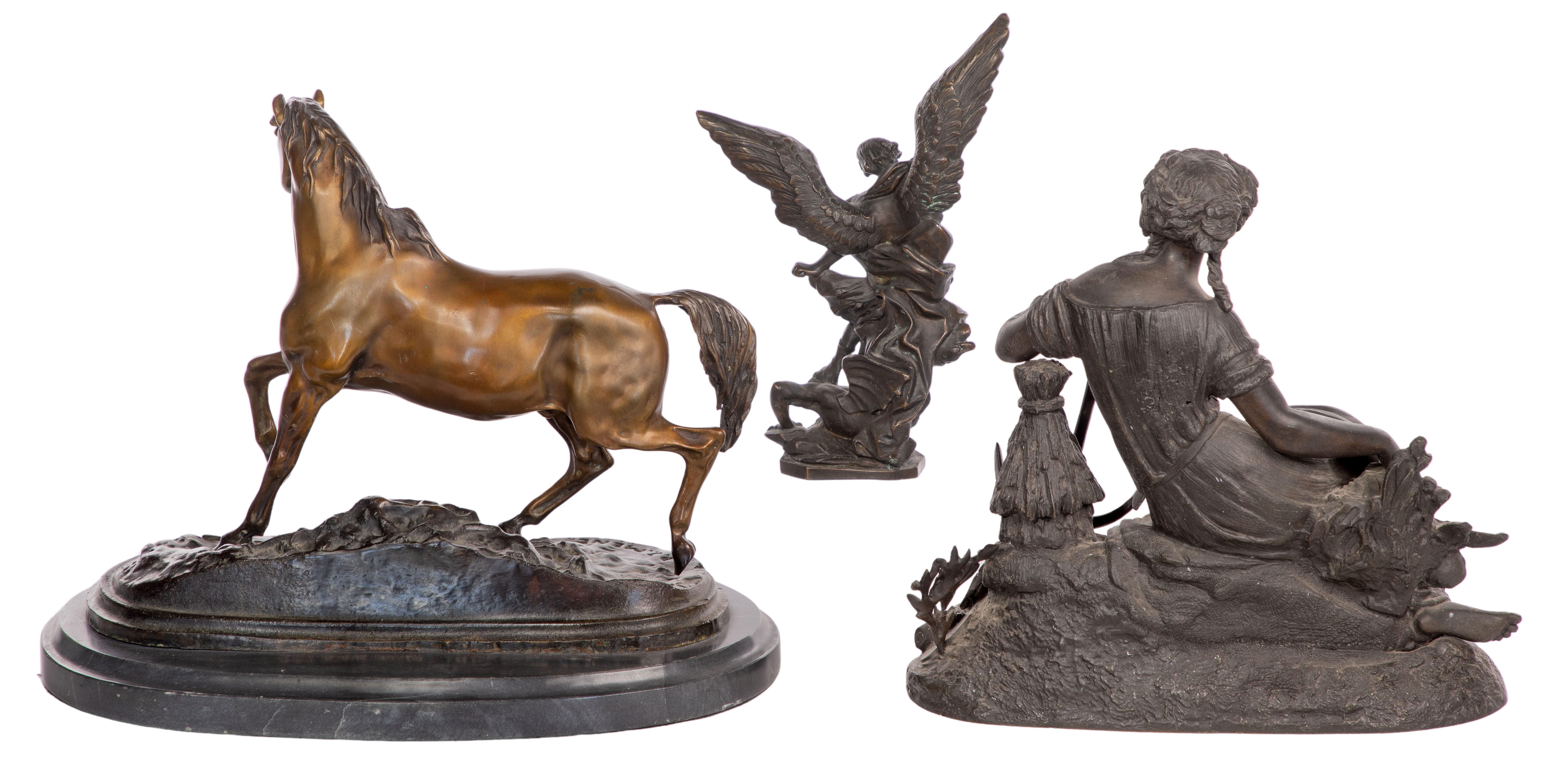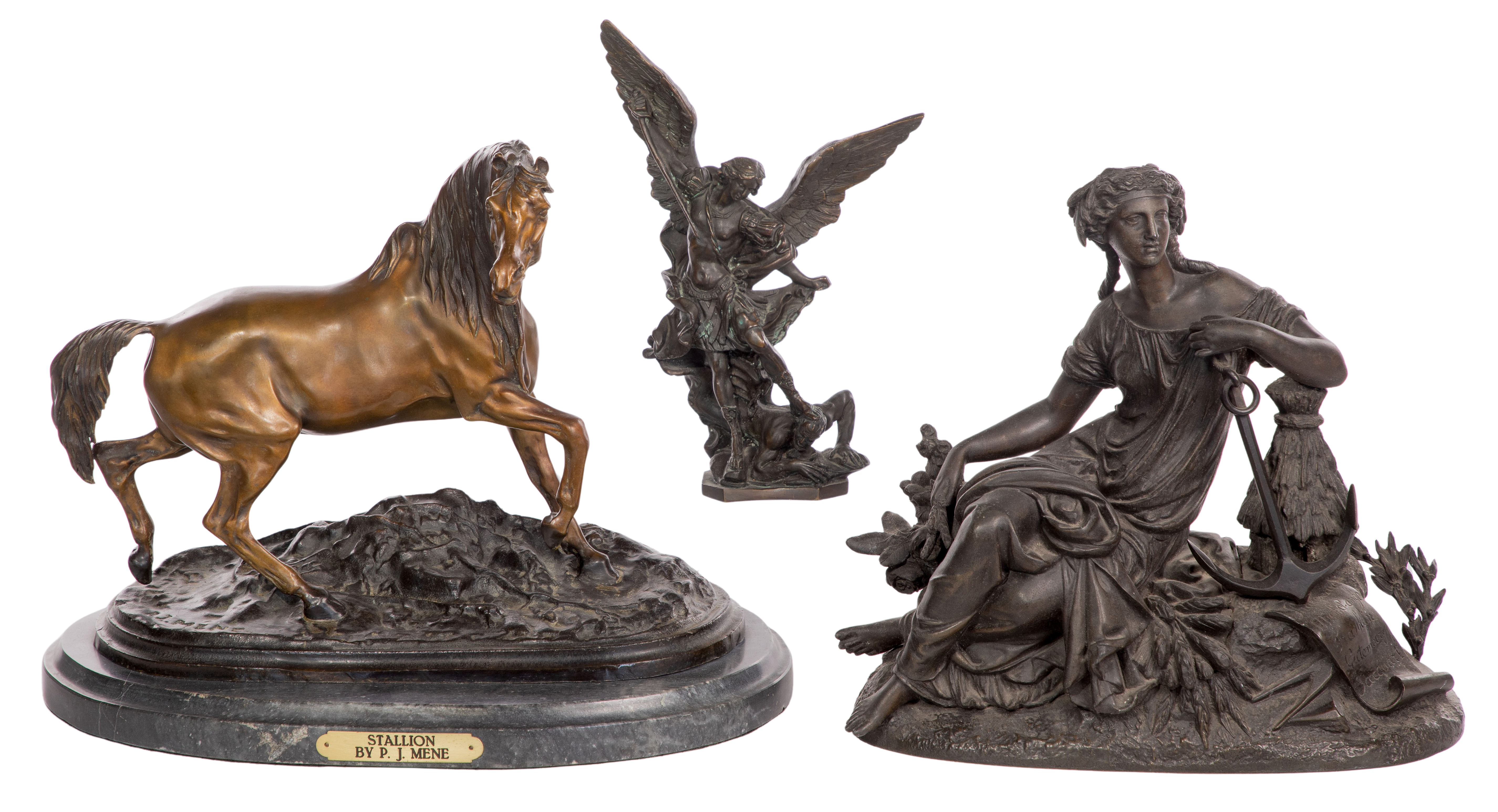 (3) items including a bronze sculpture titled ‘Stallion’ after P.J. Mene, on a hardstone base with title placard, a bronze sculpture of St. Michael defeating Lucifer and a metal casting of a Neoclassical seated woman