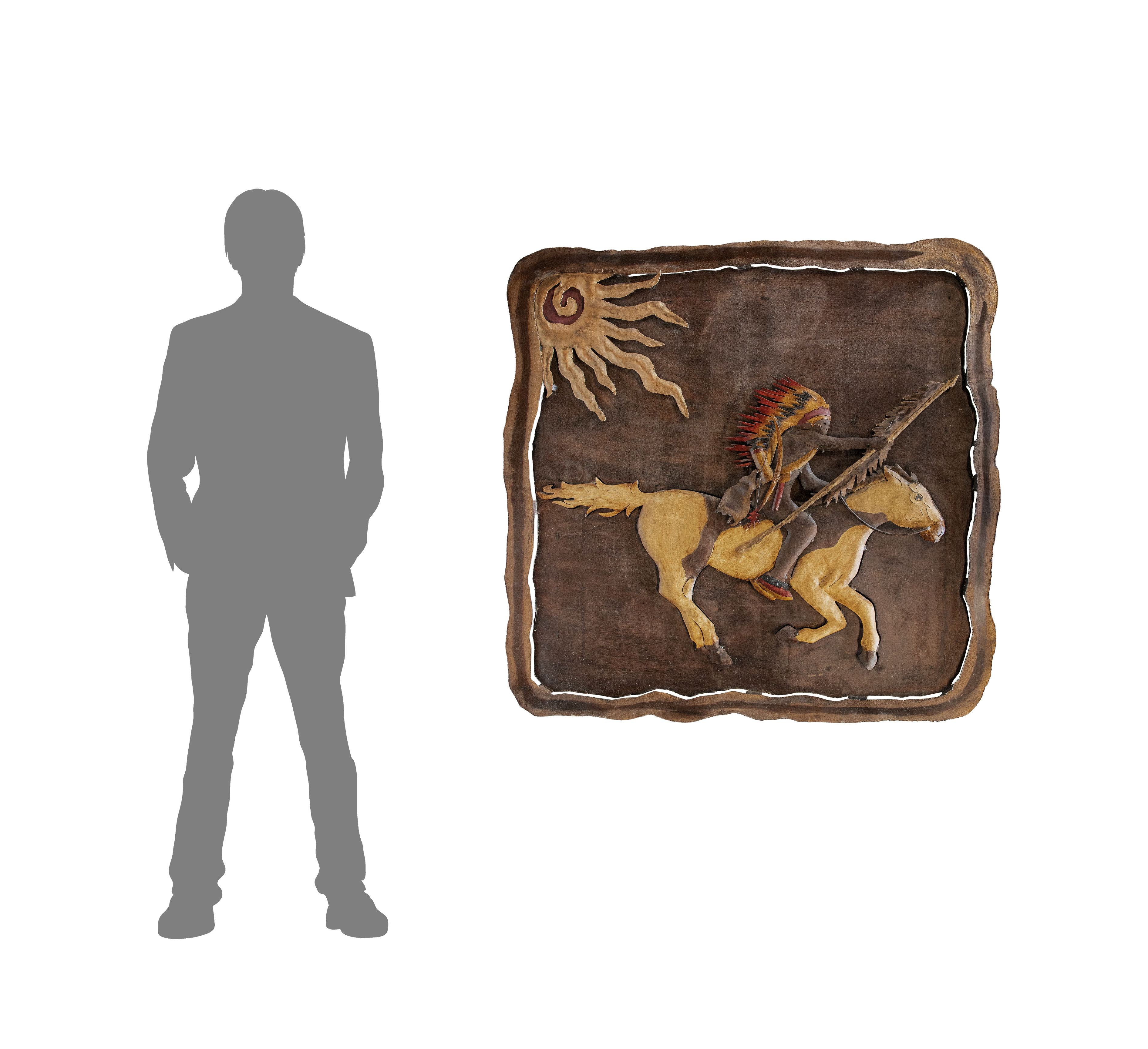 Hand cut, multi-layered and assembled to create depth and dimension, depicting a Native American warrior on horseback