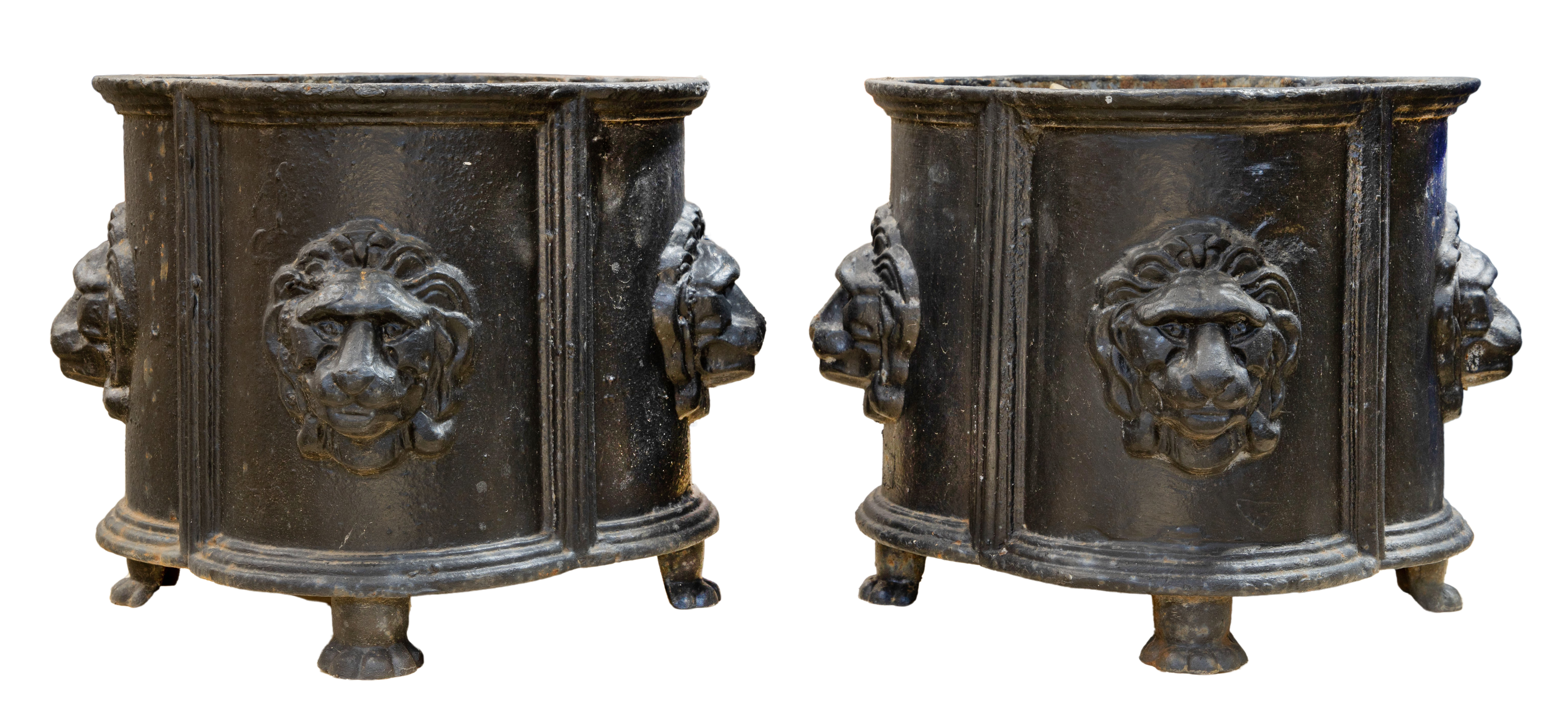 A set of (2) French heavy cast iron planters / Jardinieres, clover shape, lion’s faces to each side, claw feet