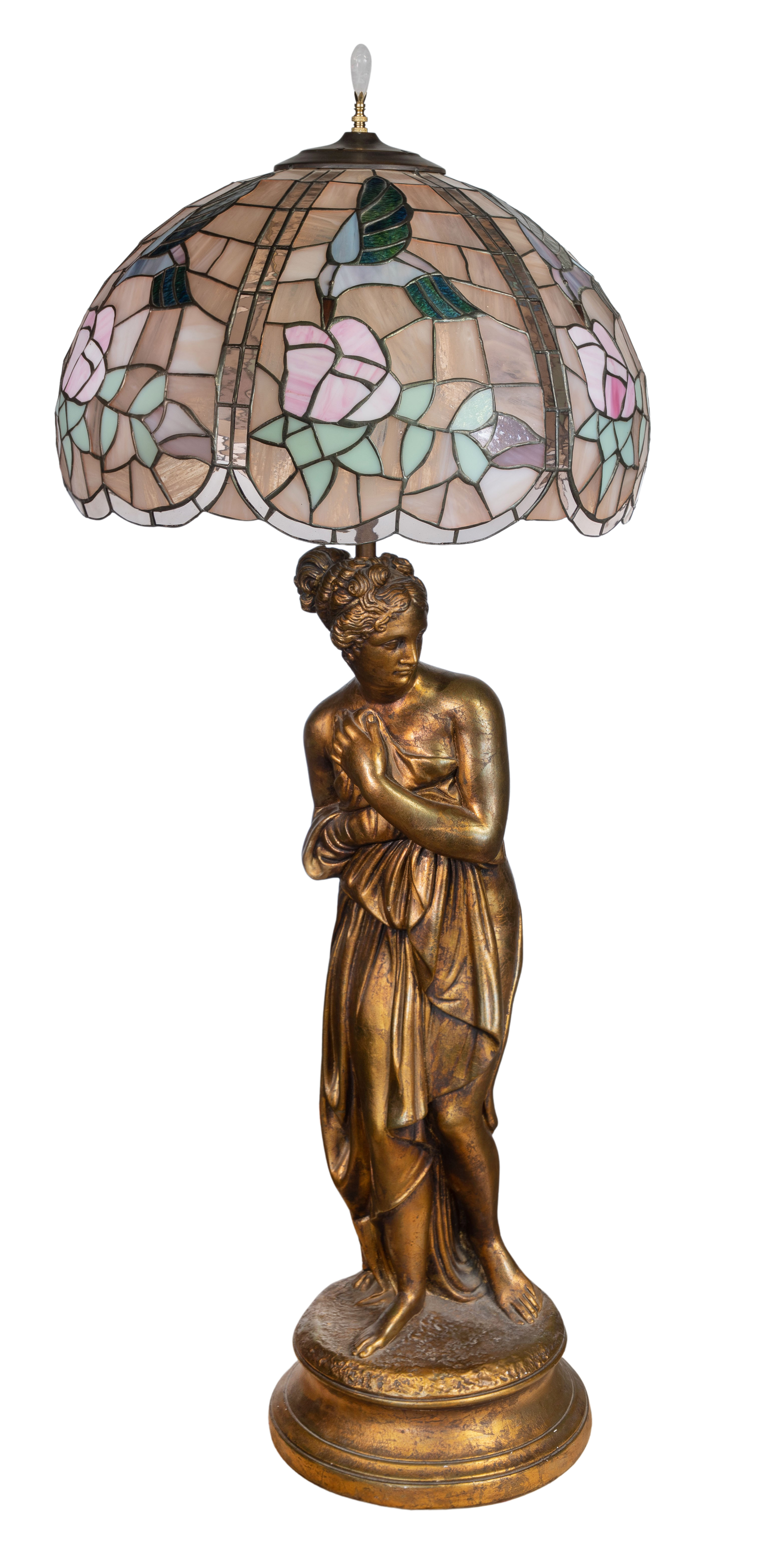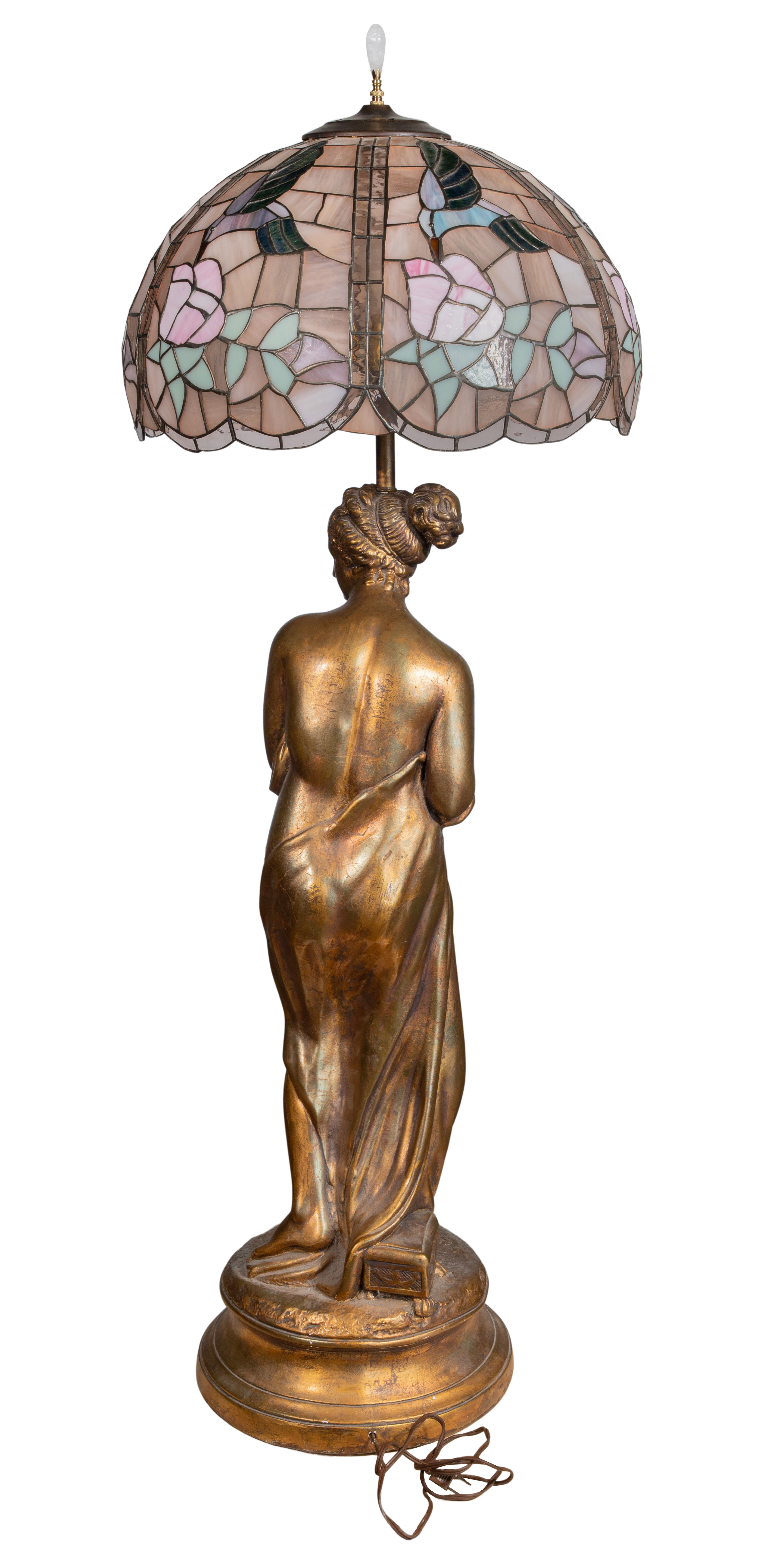 A gilt statue depicting the goddess partially robed, converted into a lamp having a later slag glass shade in an array of colors in a hummingbird and floral design