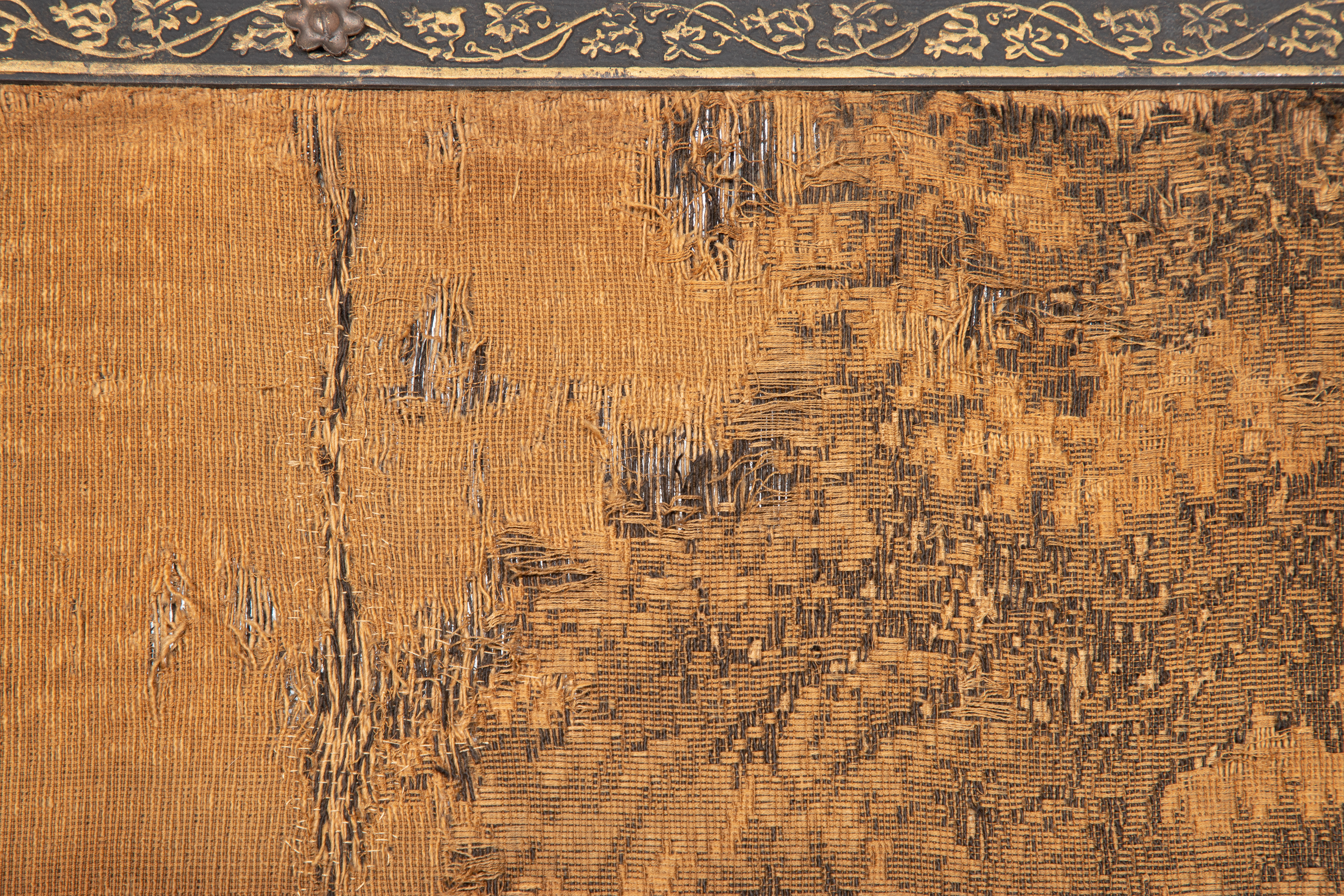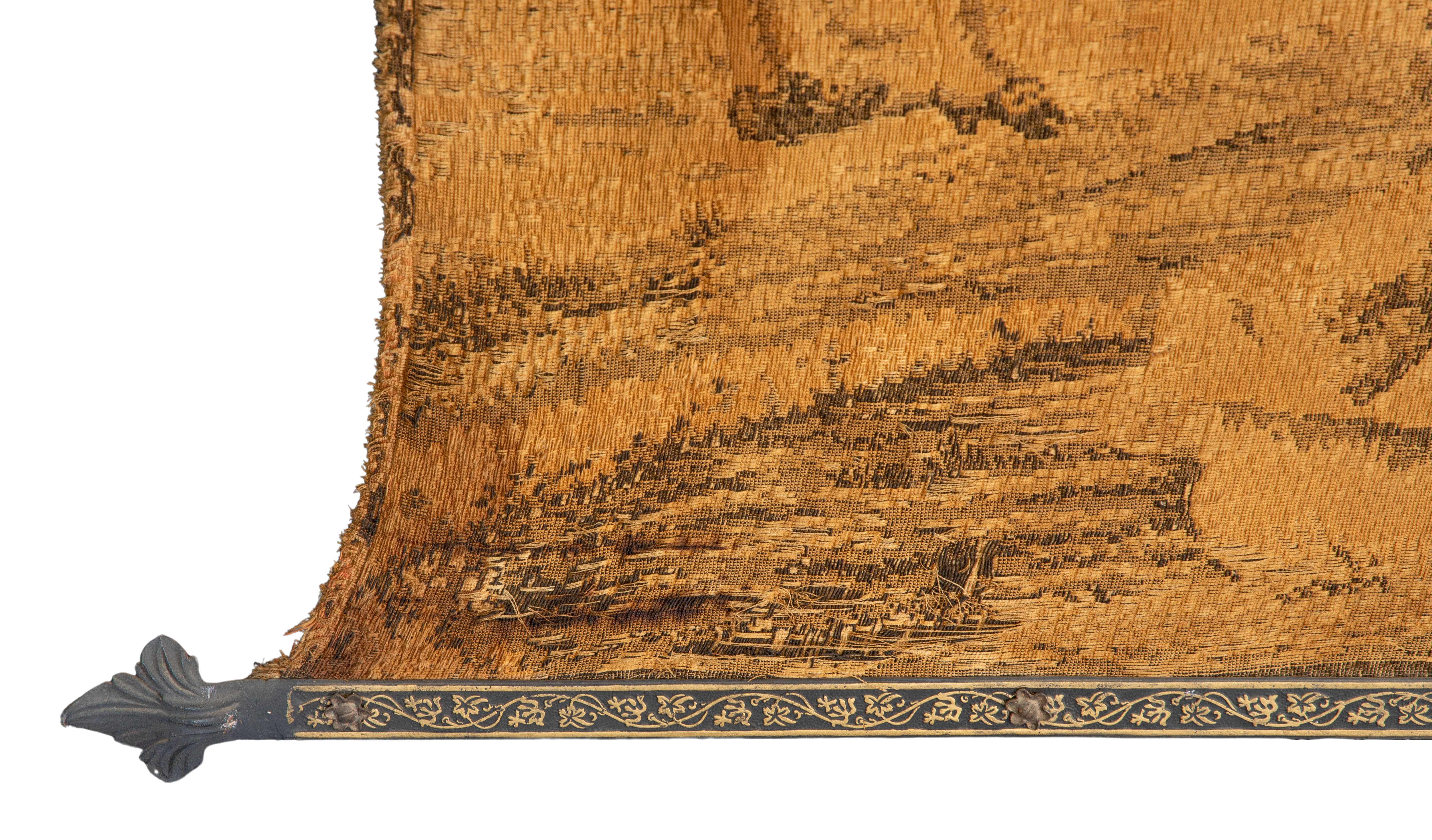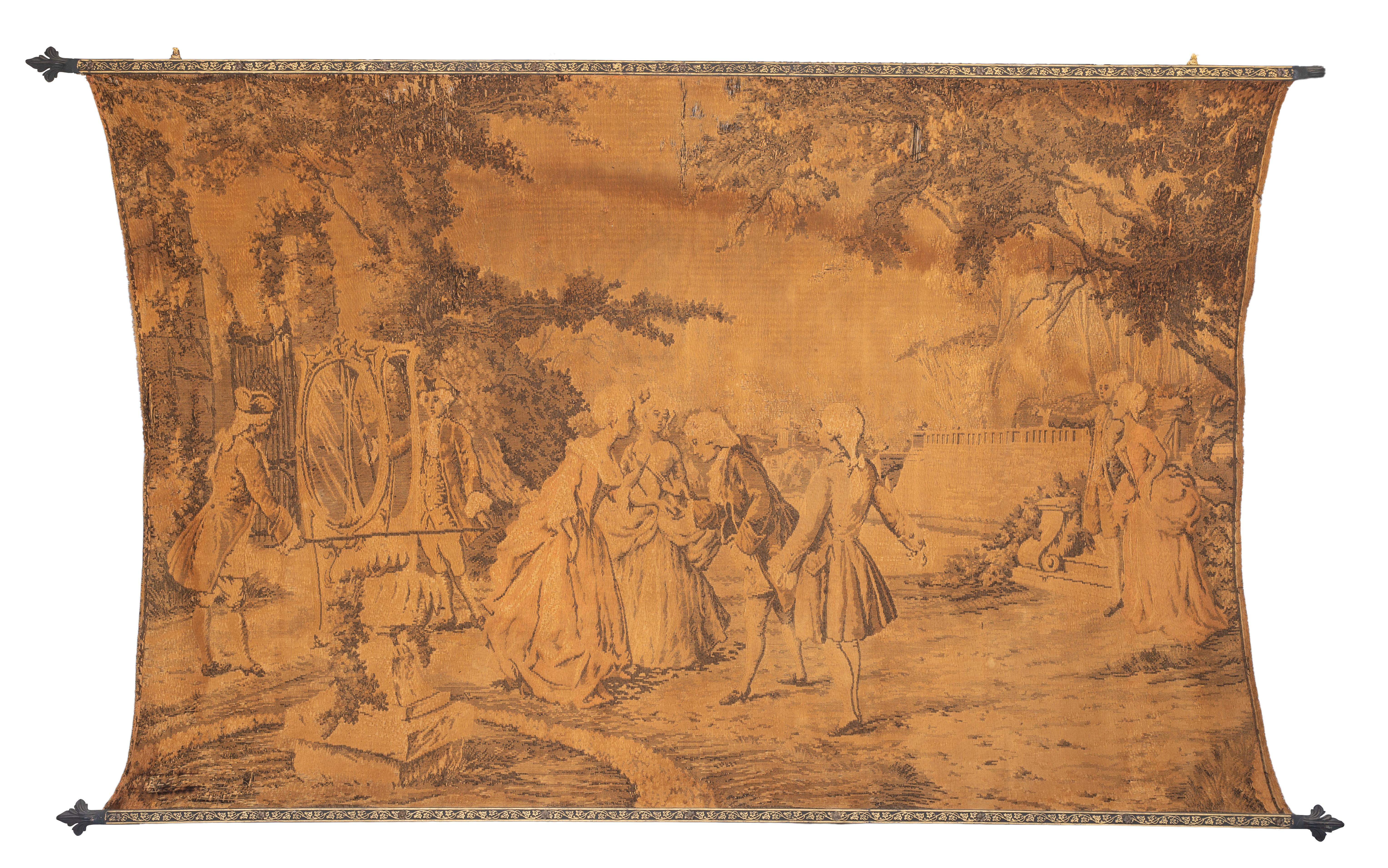 A woven tapestry depicting a French court scene, having metal rods with fleur-de-lis finials