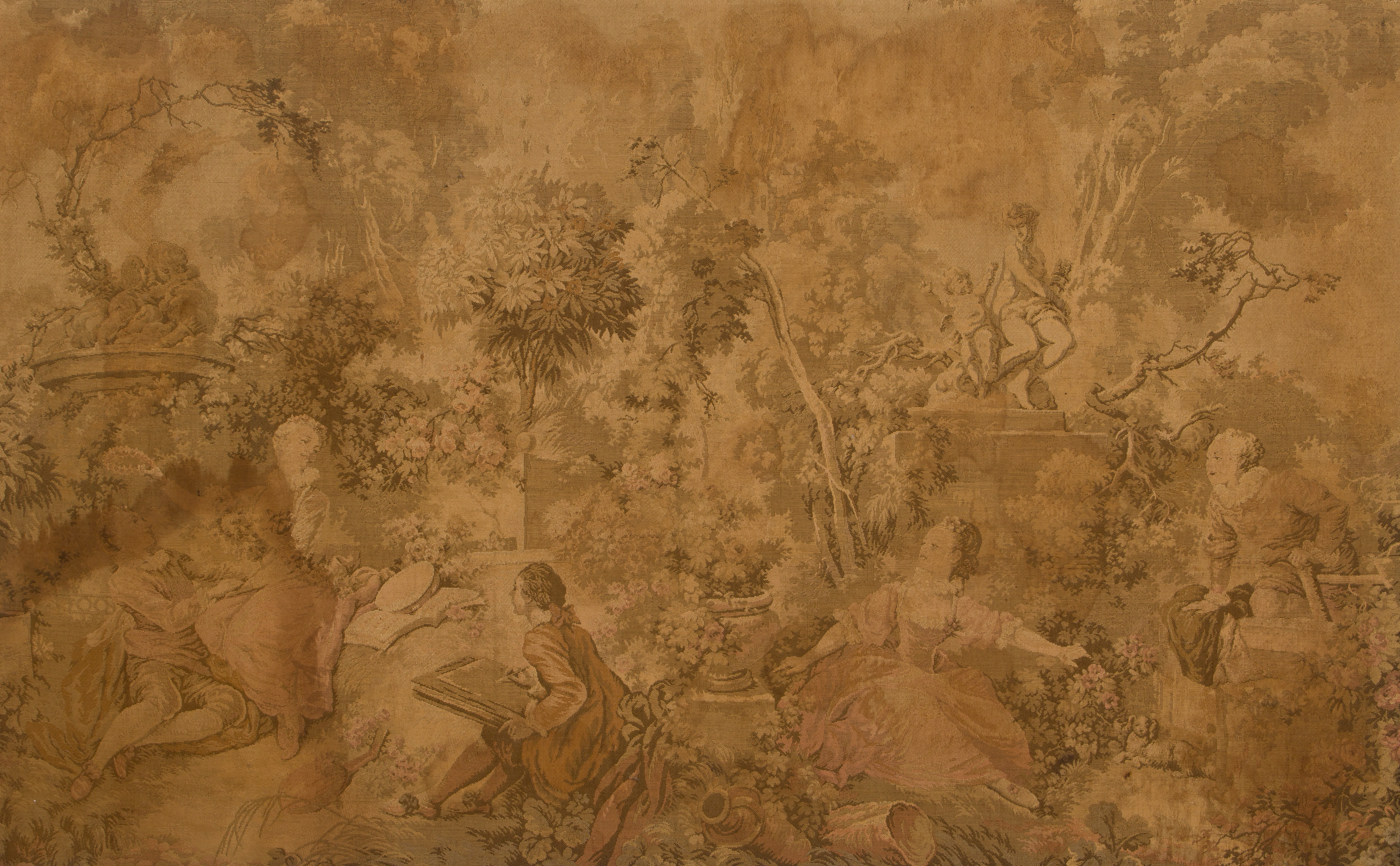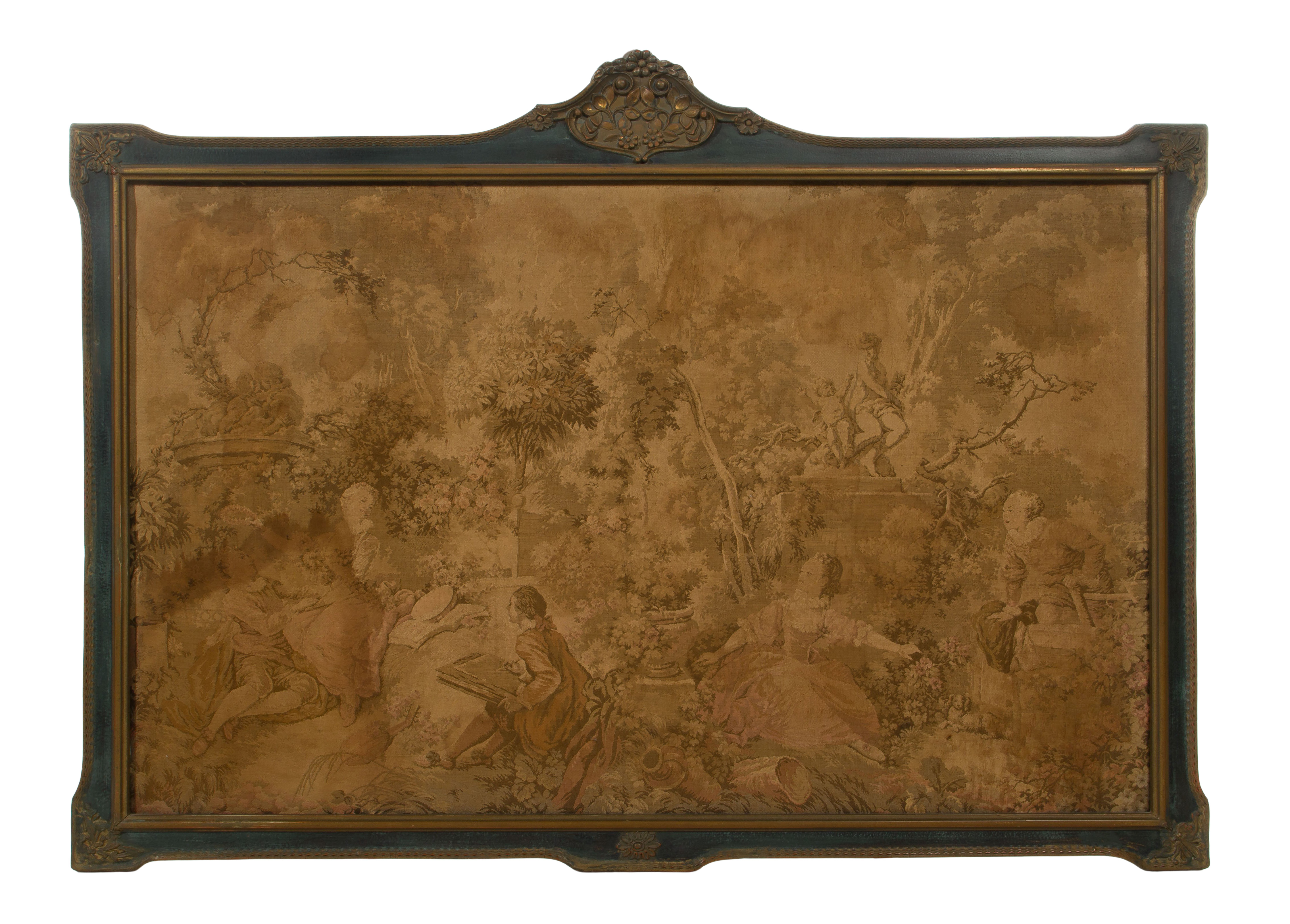 A depiction of a garden party showing five figures at ease, one of whom is sketching the couple at left, attached at edges to backing board in a painted gesso on carved wood frame