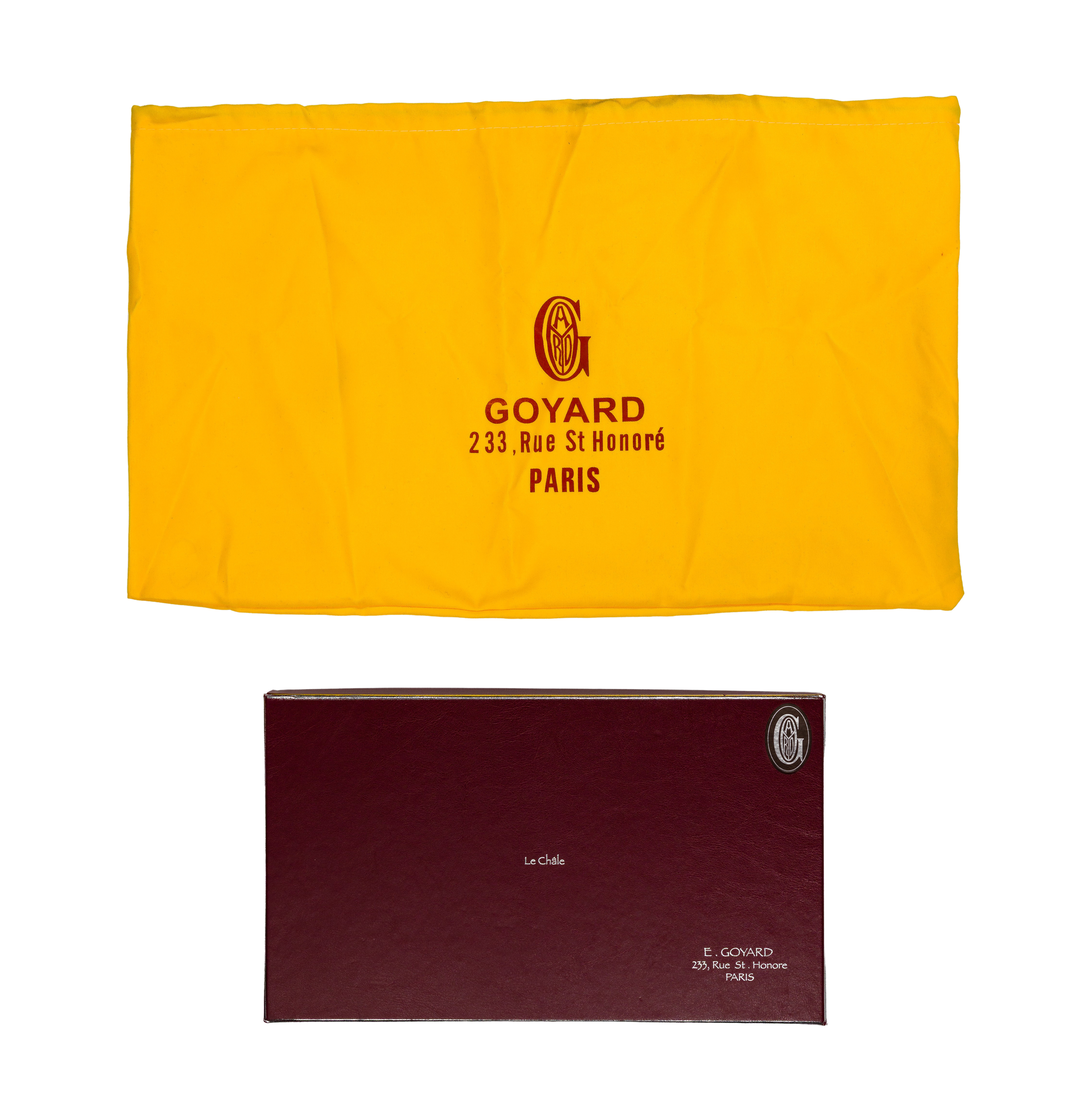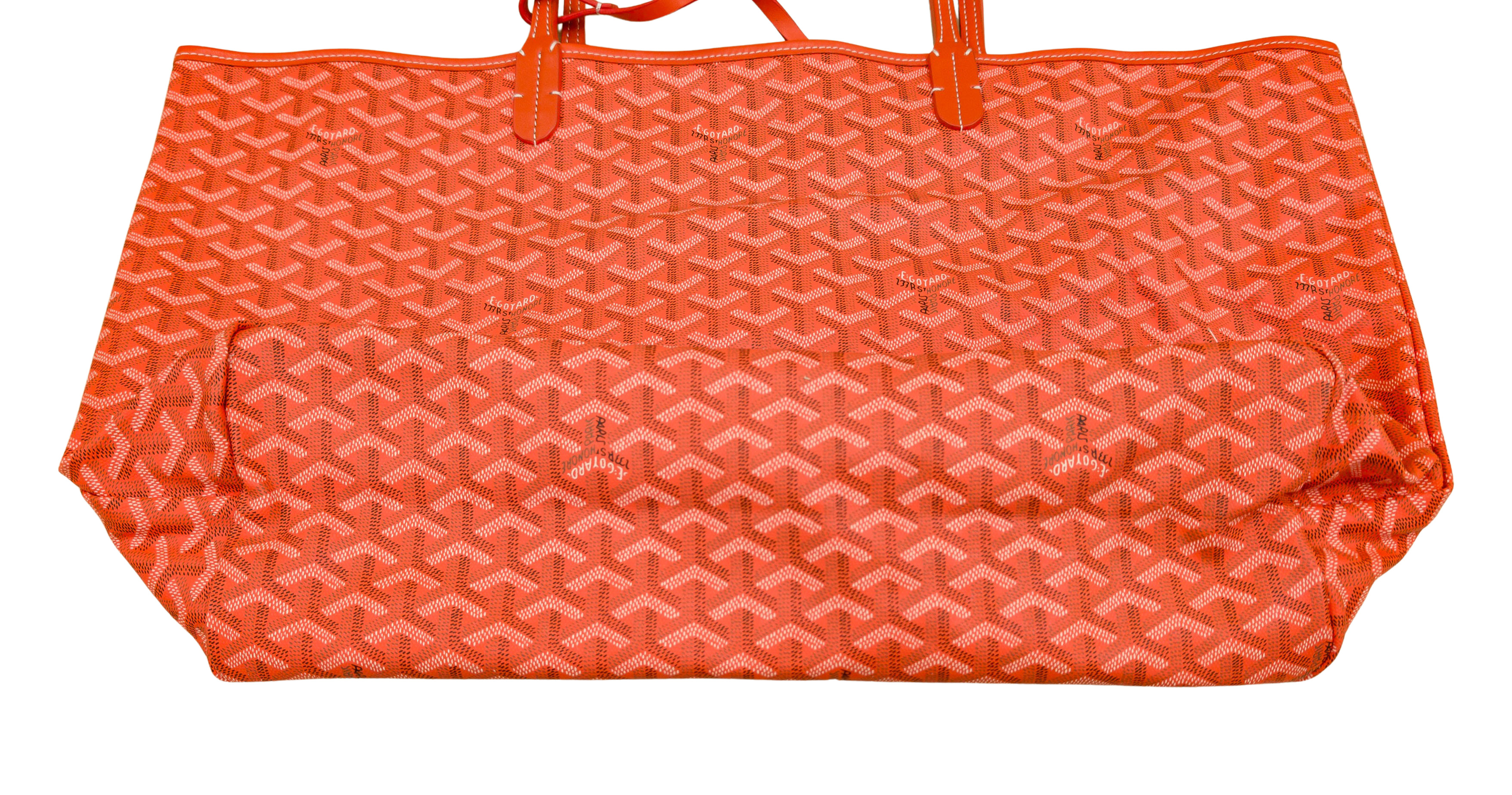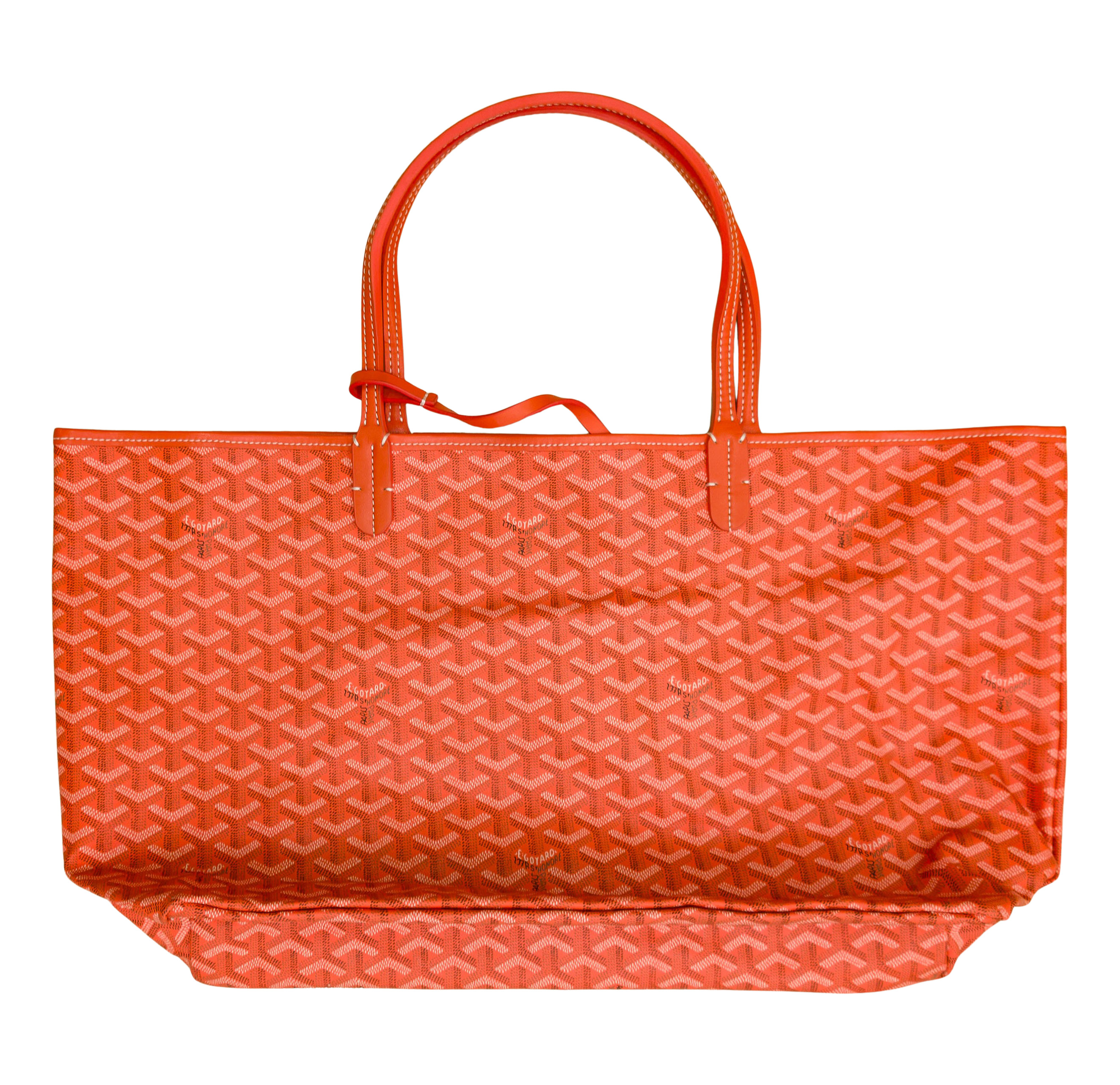 (2) items including a Saint Louis Tote having signature Goyard chevron print canvas, orange leather straps, trim, a natural canvas lined interior, a hanging pouch and yellow dust bag as well as an orange logo square frayed edge scarf, having bag, box and ribbon