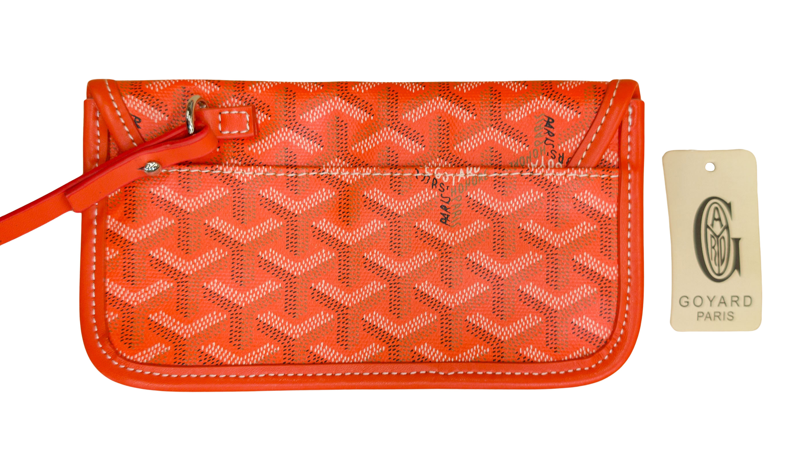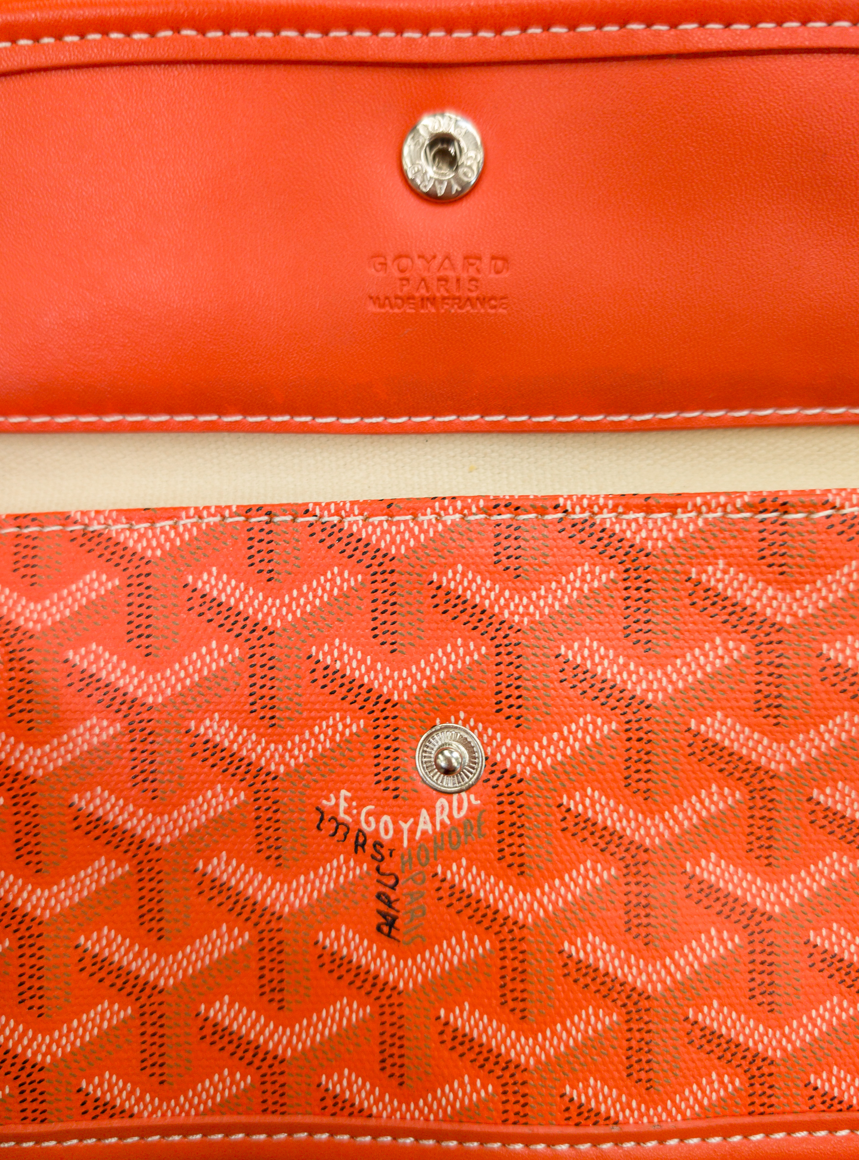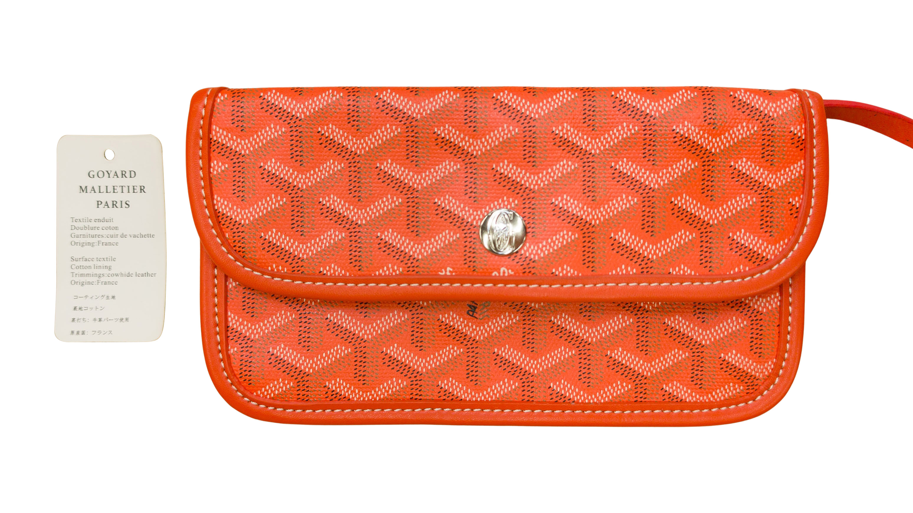 (2) items including a Saint Louis Tote having signature Goyard chevron print canvas, orange leather straps, trim, a natural canvas lined interior, a hanging pouch and yellow dust bag as well as an orange logo square frayed edge scarf, having bag, box and ribbon