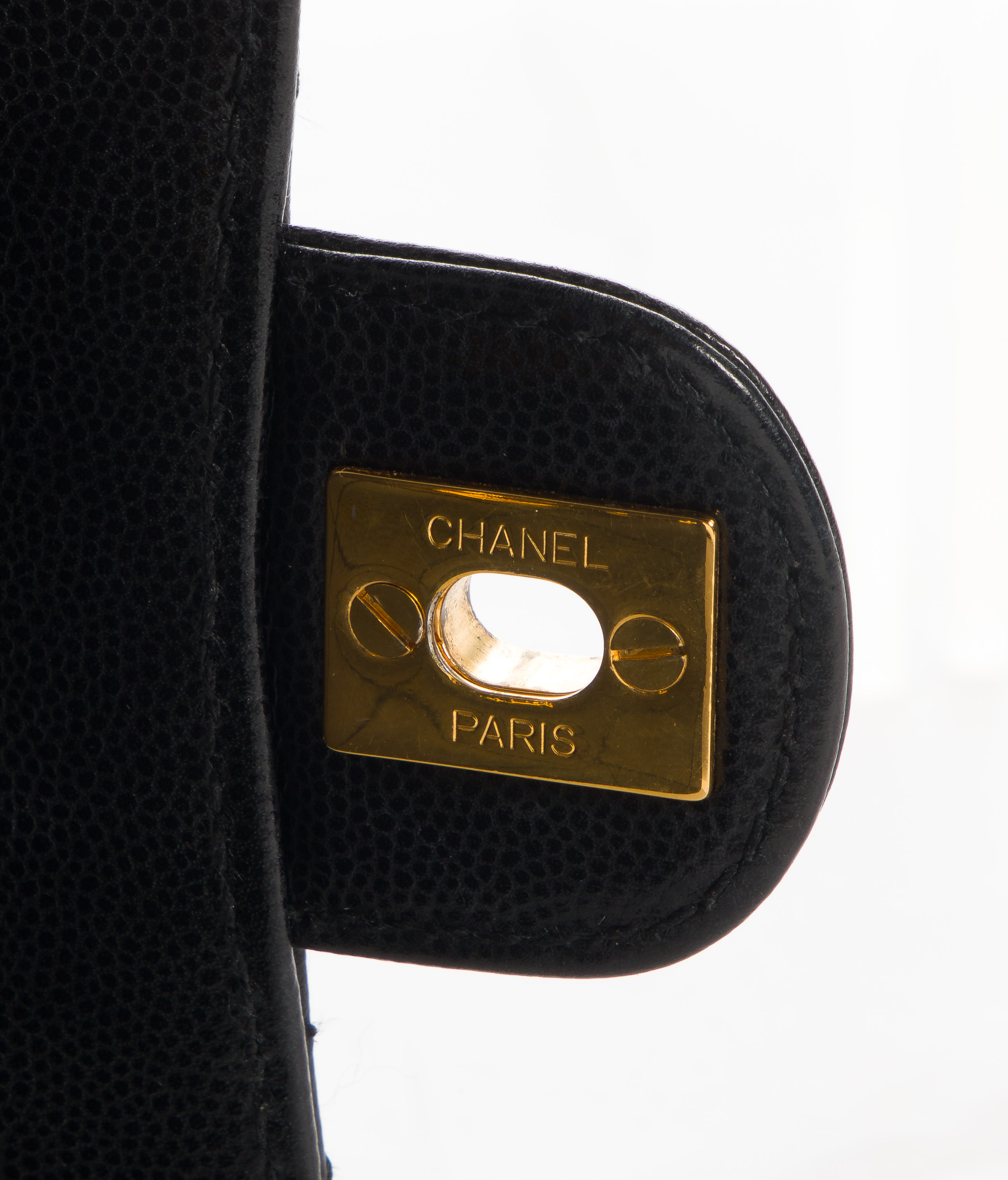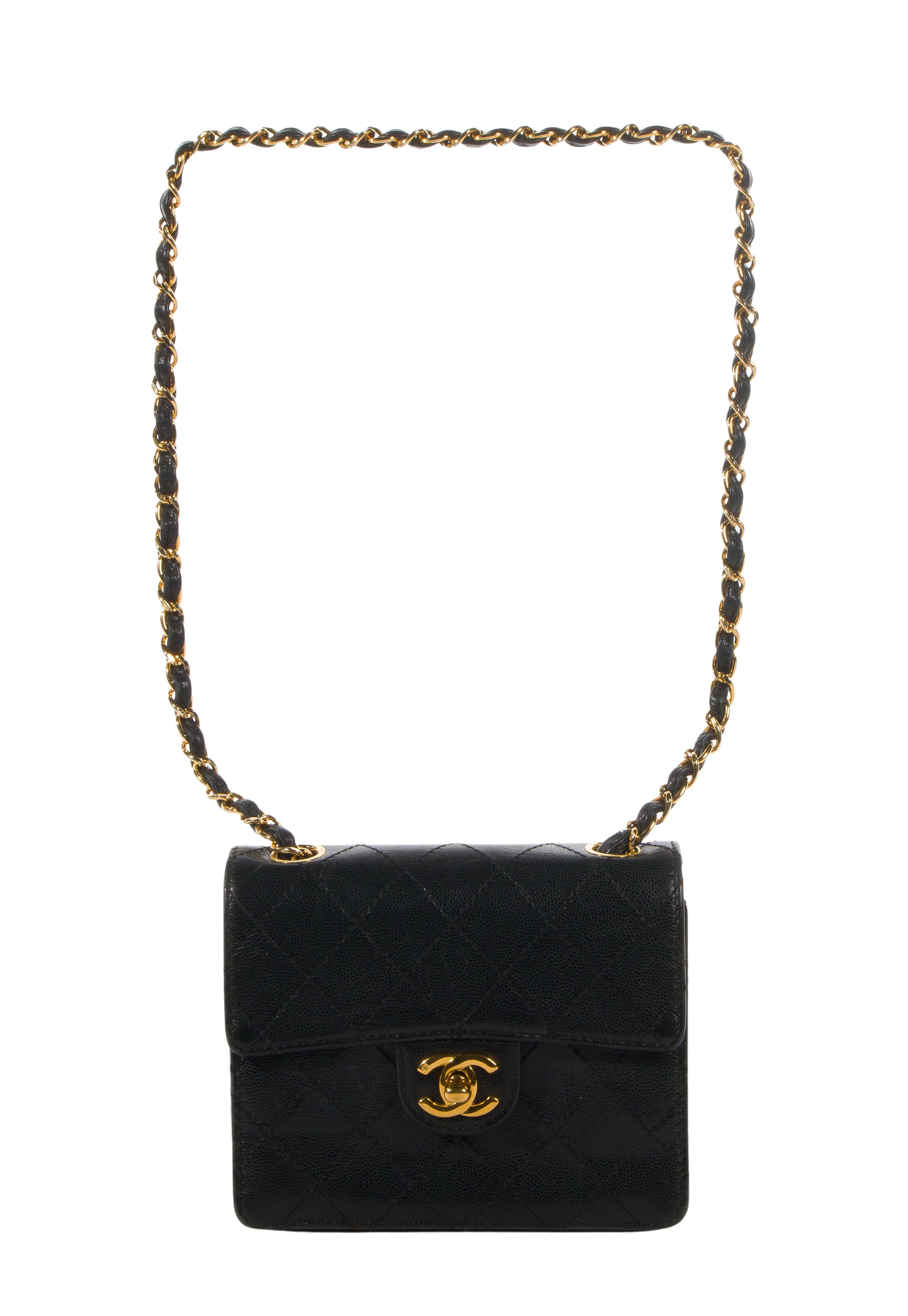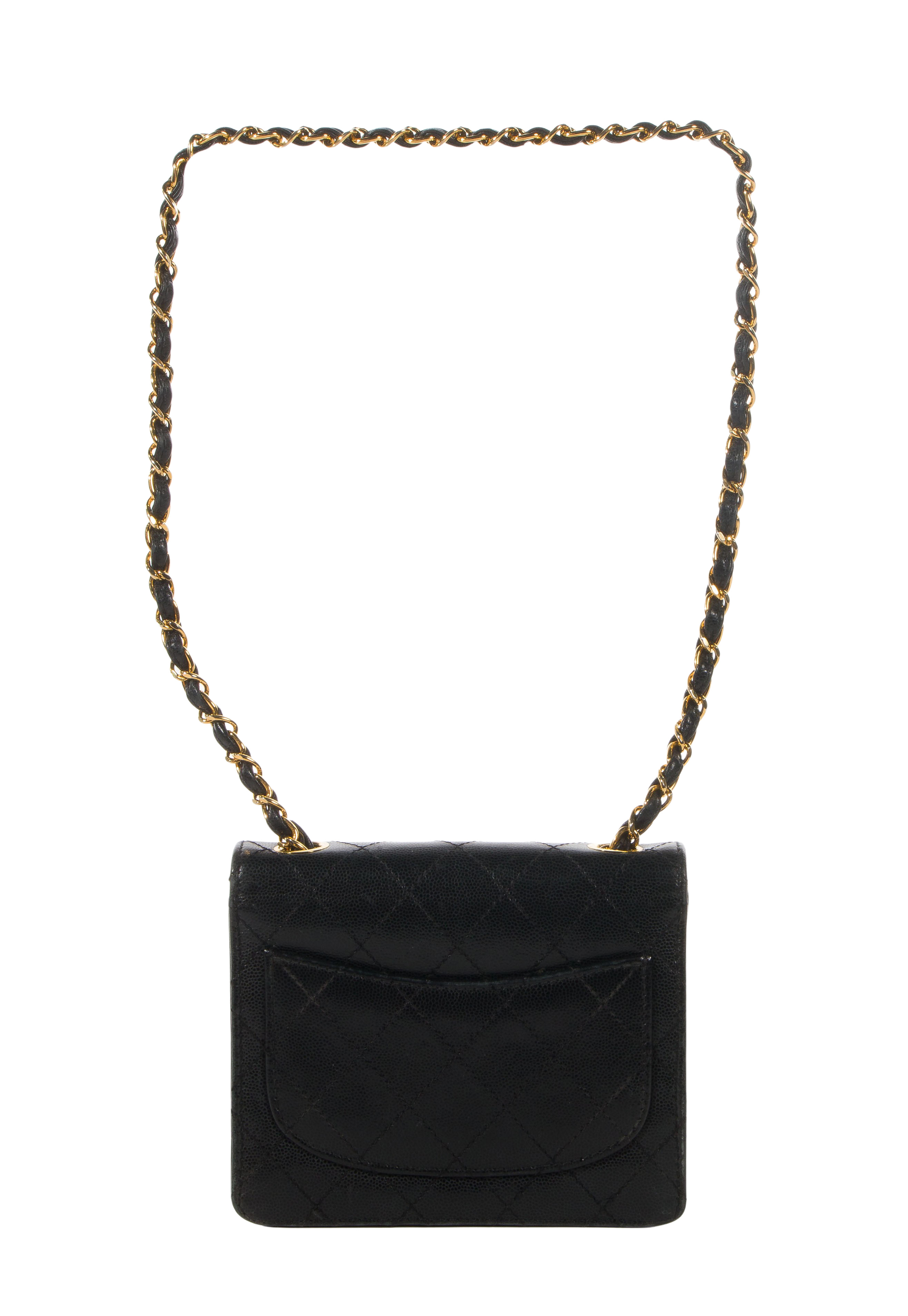 Black quilted leather, exterior pocket, gold-tone chain link leather-threaded shoulder strap, CC turn-lock closure, interior having a zipper and patch pocket, serial #626275