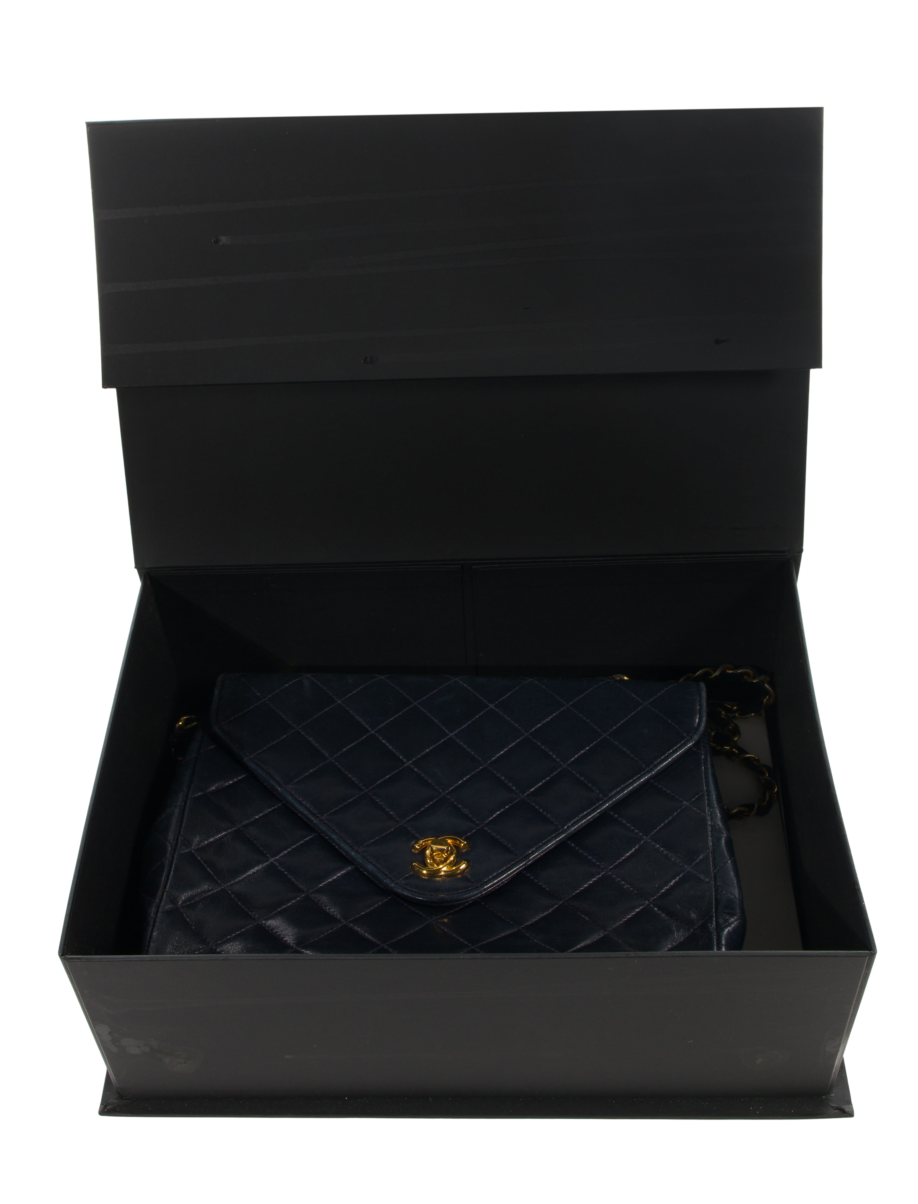 Navy blue kid skin, #3 style having a quilted exterior, V-flap, gold-tone hardware, turn lock, chain handle, Chanel stamp on interior, in box including papers