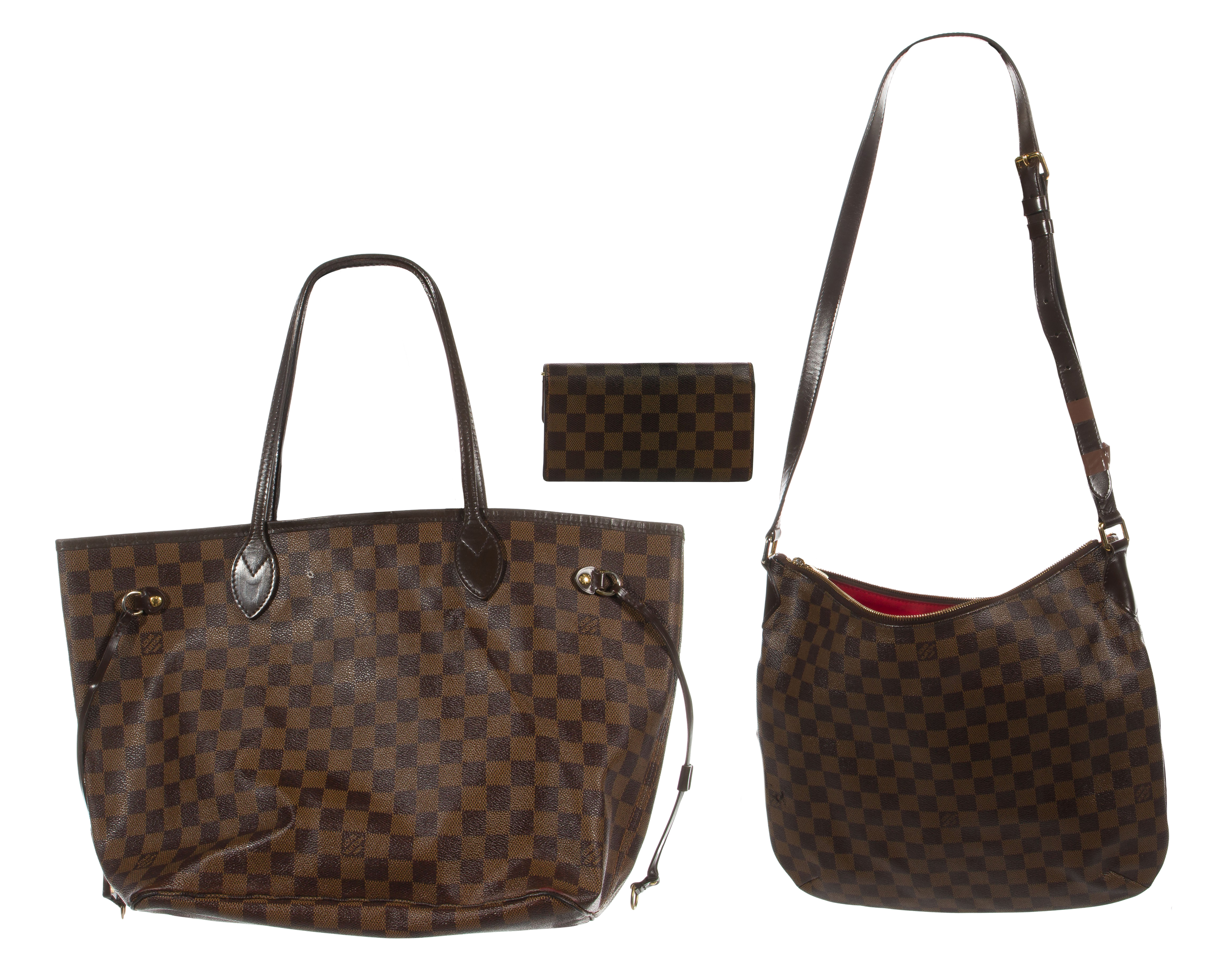 Condition: overall light to moderate wear consistent with normal use, minor scuffs, corner wear, interior of bags having areas of dirt and wear, wallet appearing never used