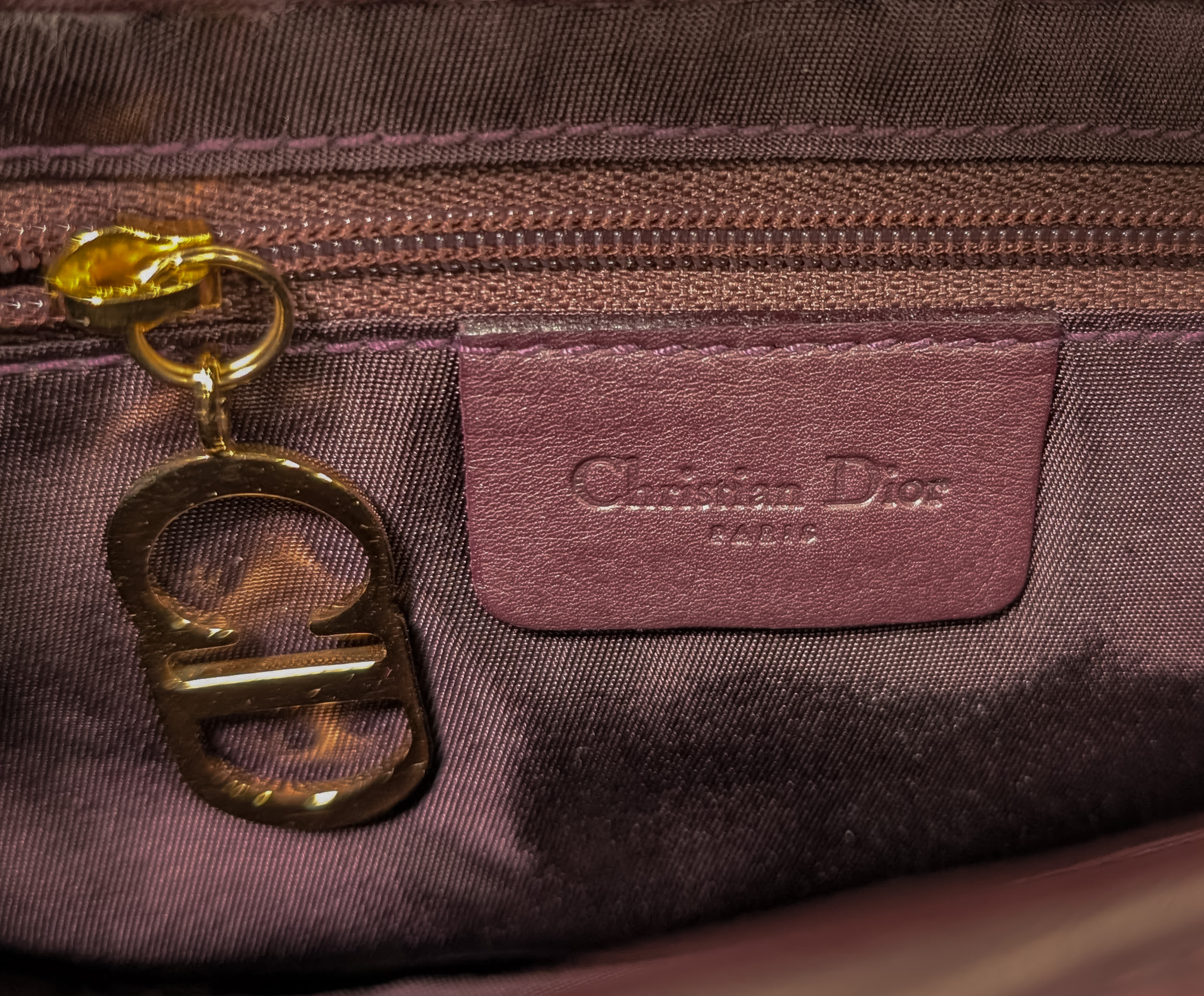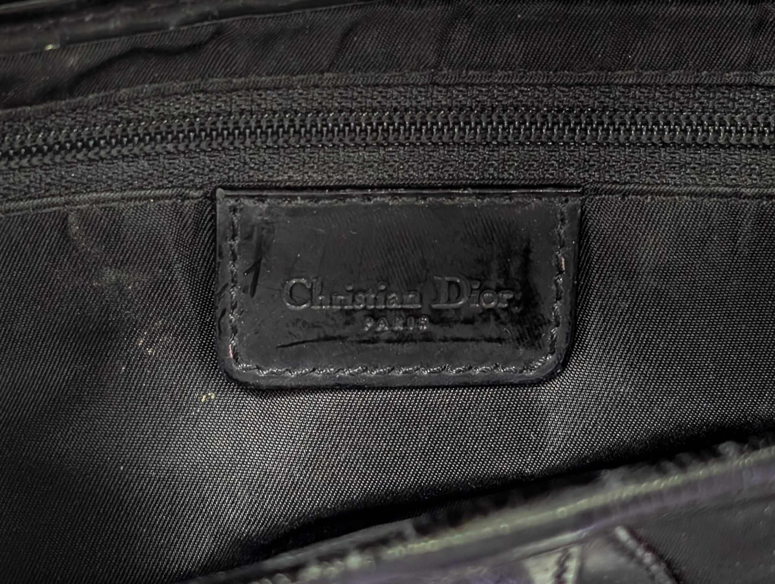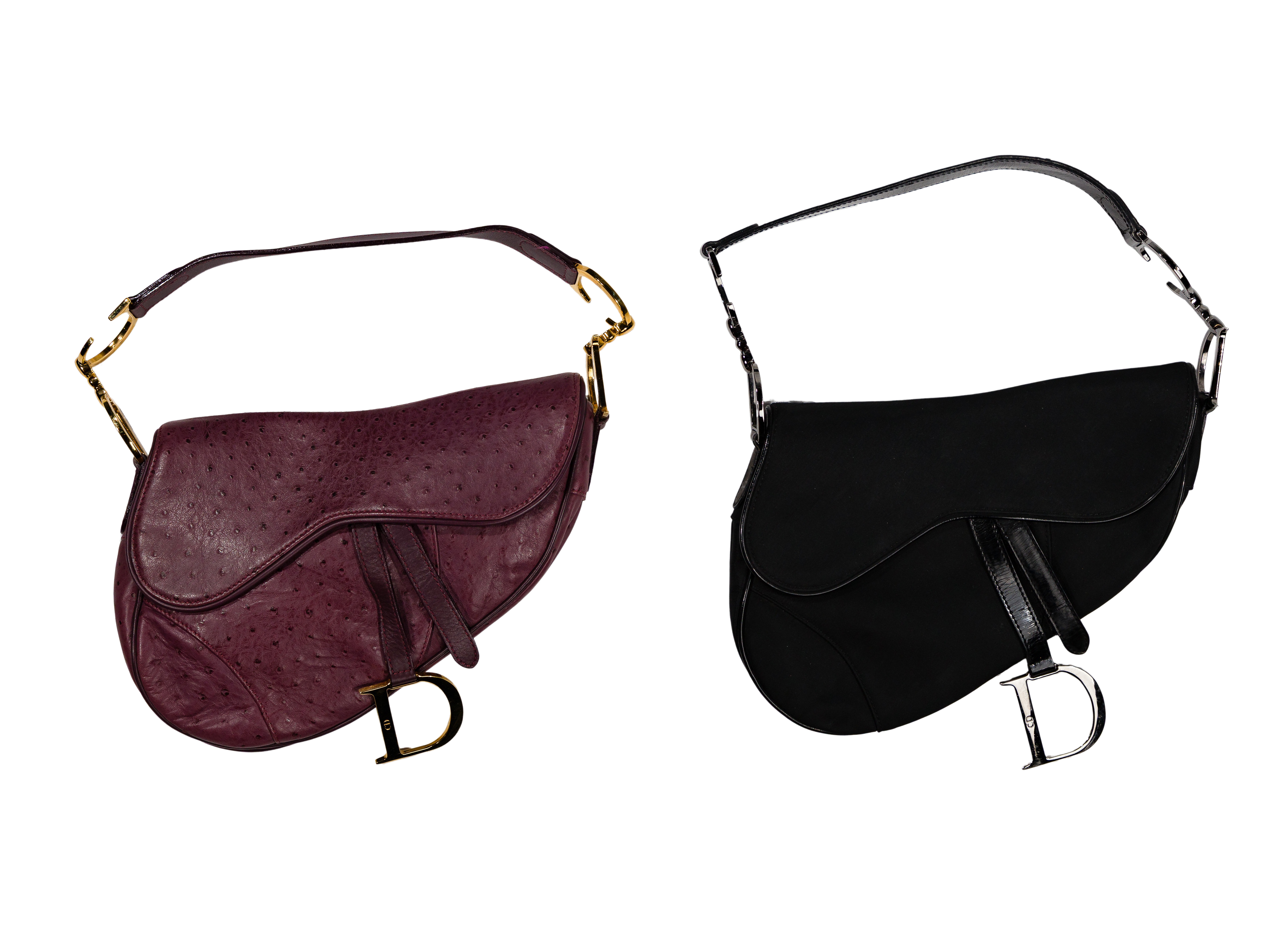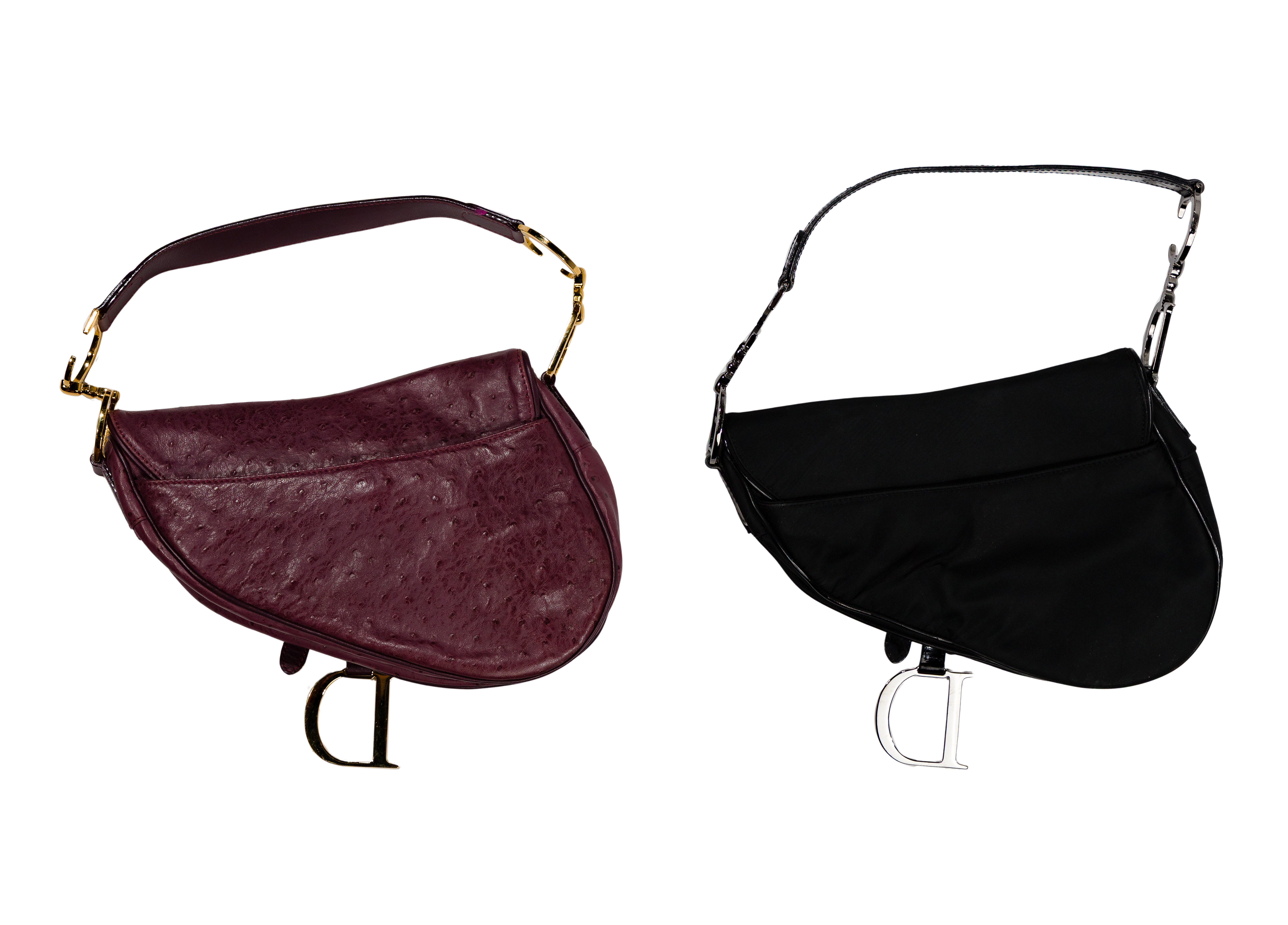 (2) items including a purple ostrich skin and black fabric, both having a D-stirrup strap, Velcro pull, CD signatures on the top handle, interior pocket, magnetic closure back pocket and marked ‘Christian Dior’