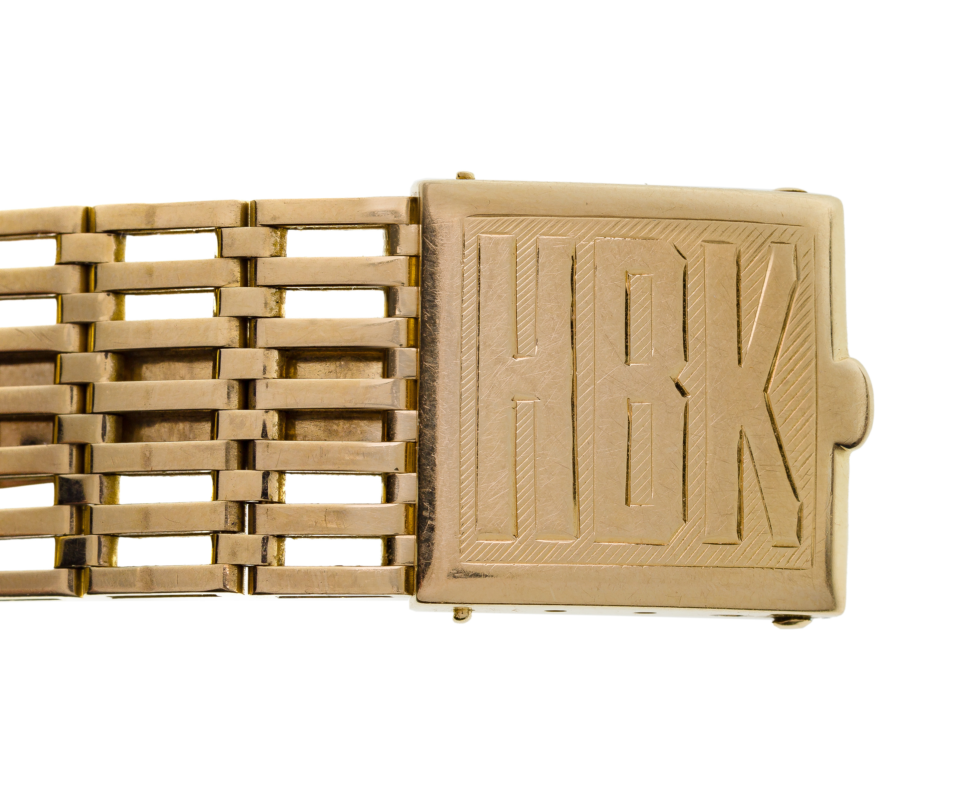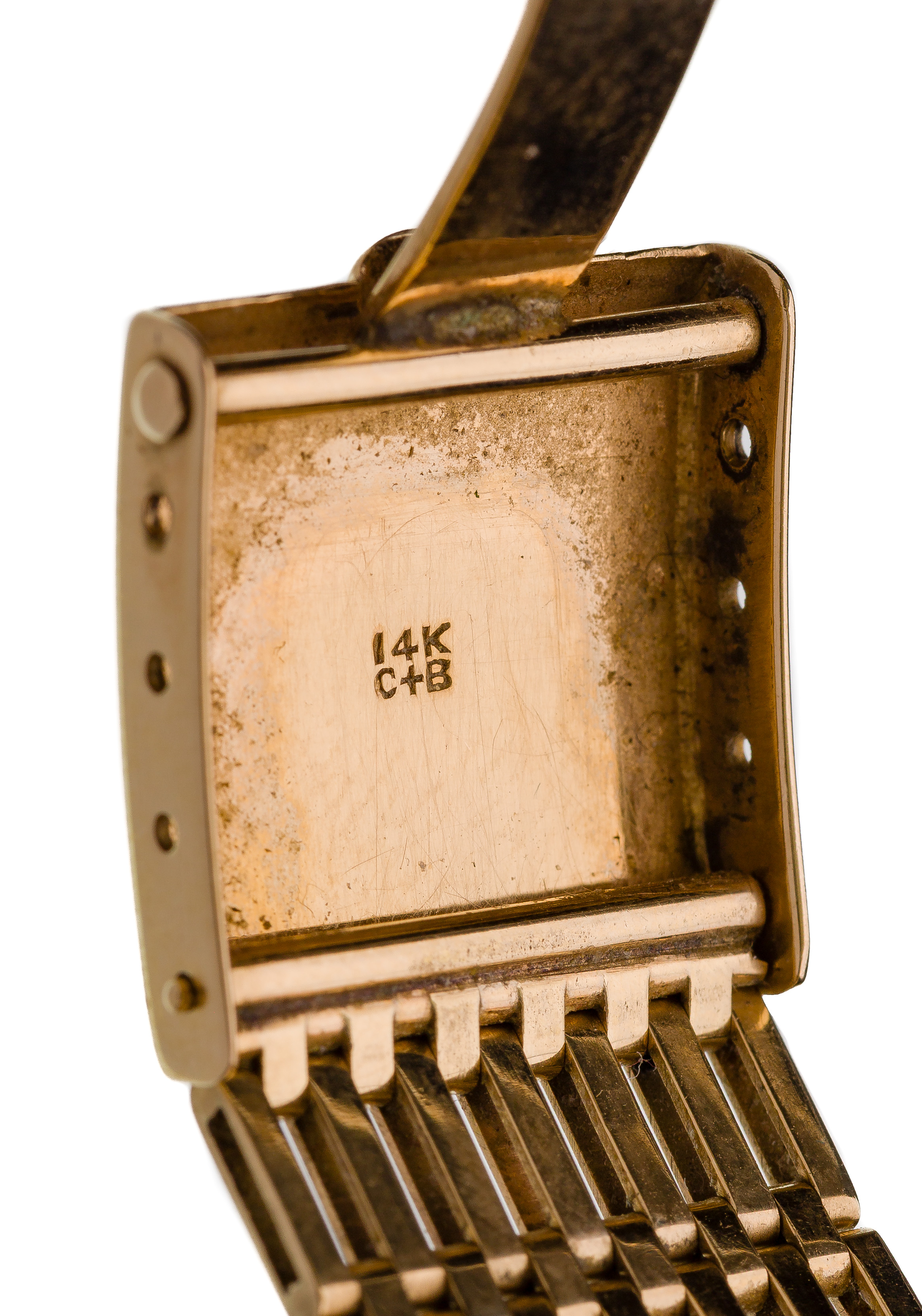 Reference #4073, having a 17-jewel movement, champagne dial, marquise number markers, subsidiary seconds dial (marked ’18k’) and mesh band (marked ’14k’)