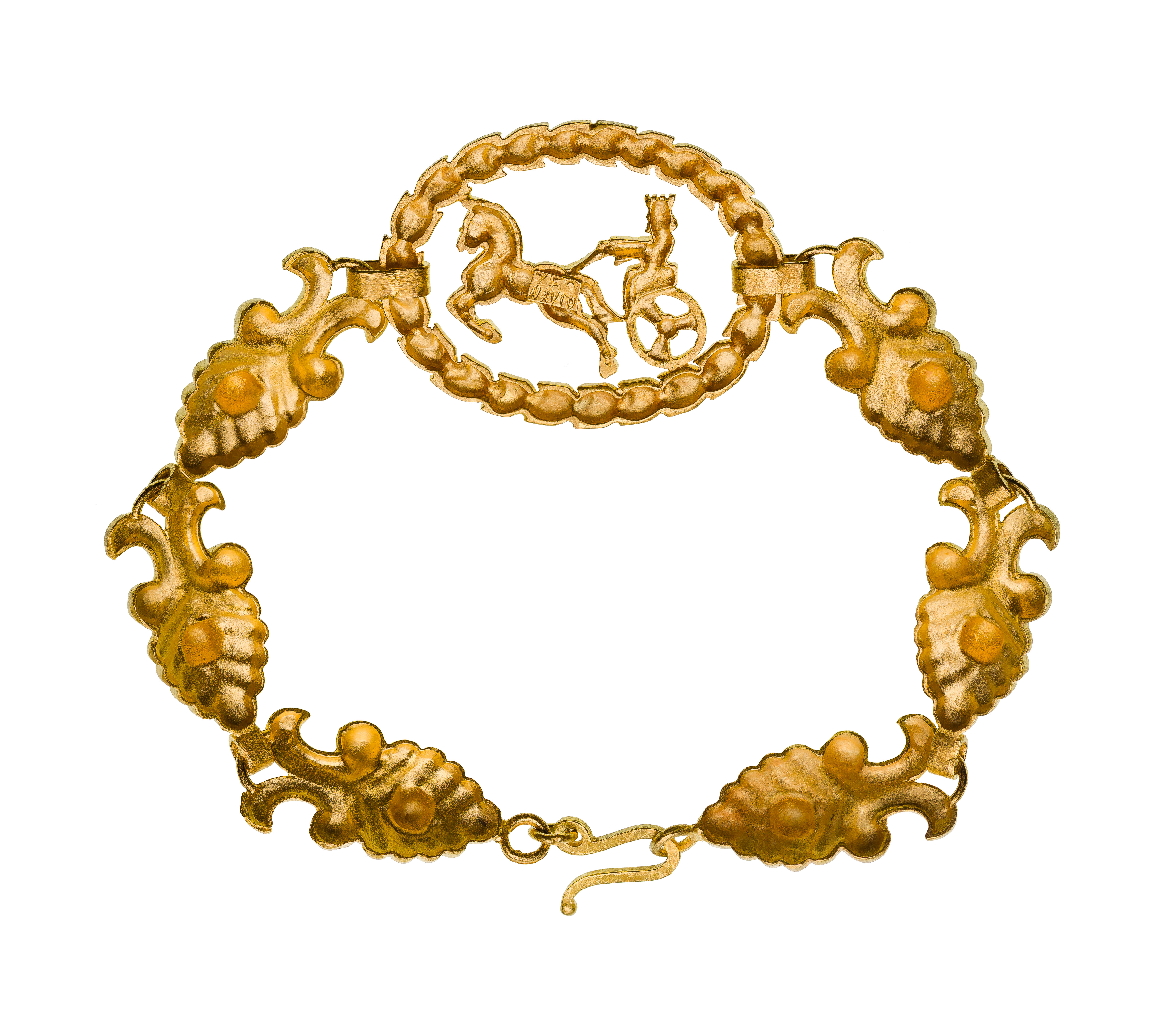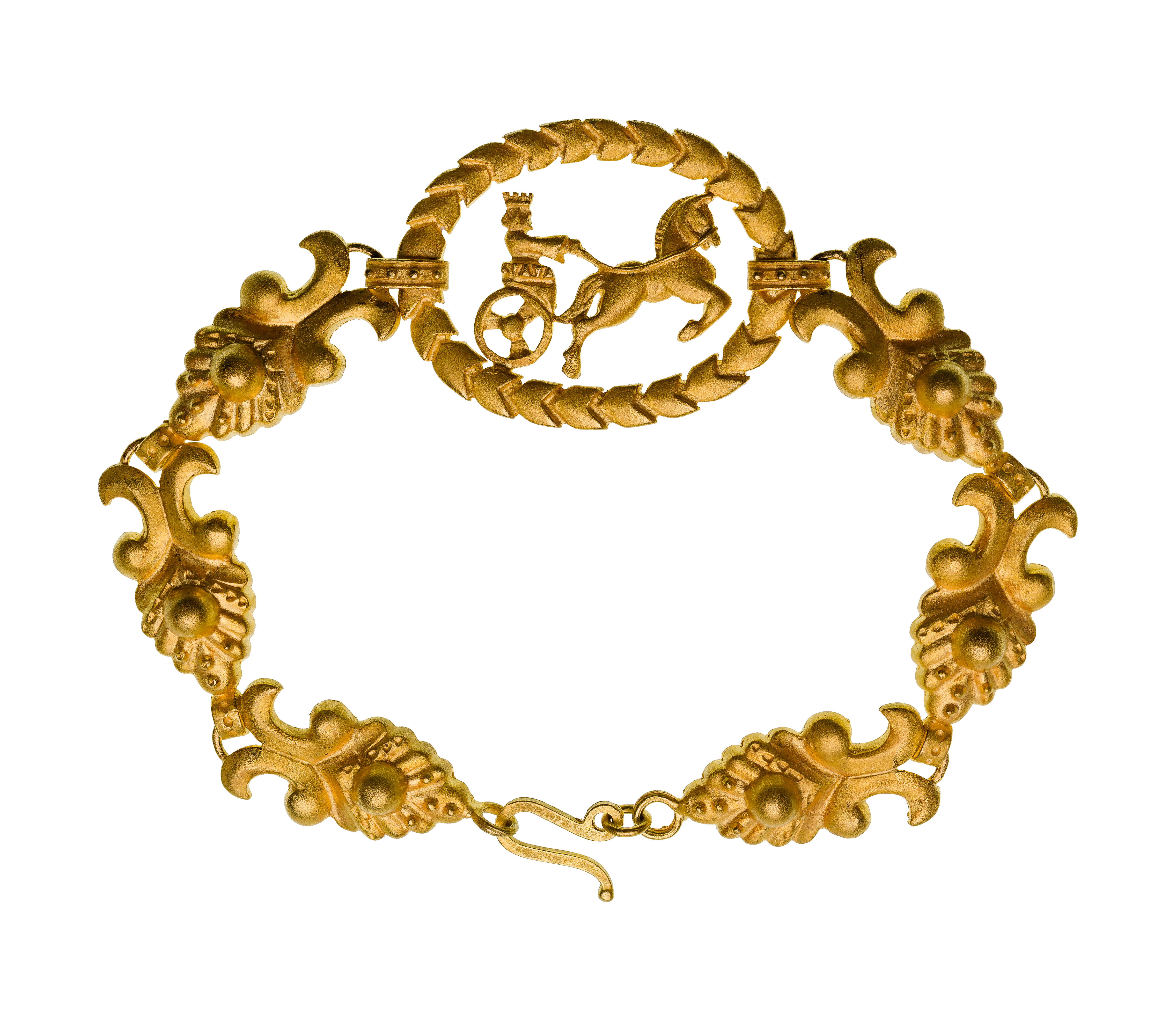 Having a horse and driver motif in an open cut oval on fleur-de-lis links (unmarked 18k)