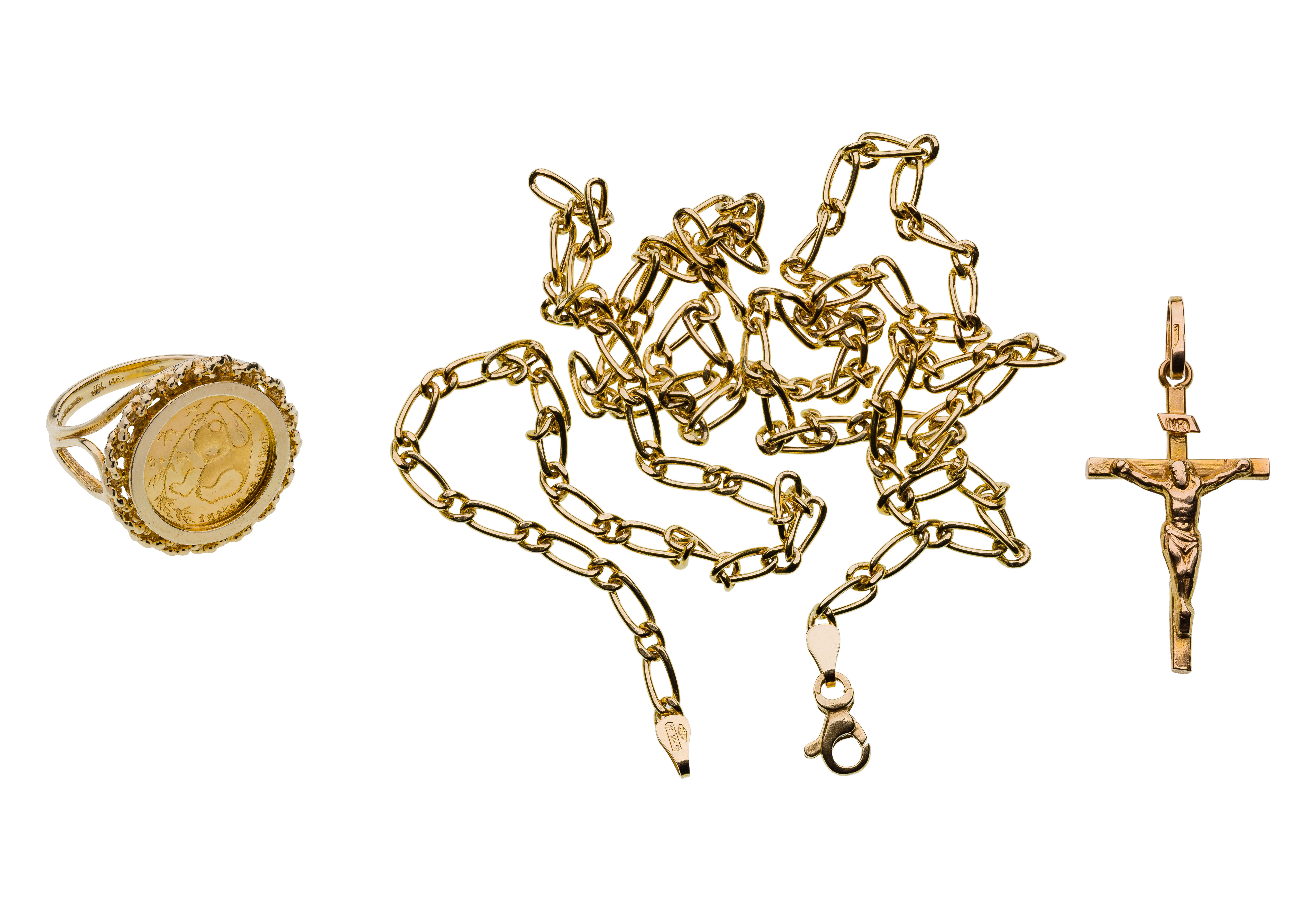 (3) items including an oval link style necklace and a cross pendant (marked ‘750’/ ’18k’) as well as a coin ring (coin marked ‘.999′, ring setting marked ’14k’)