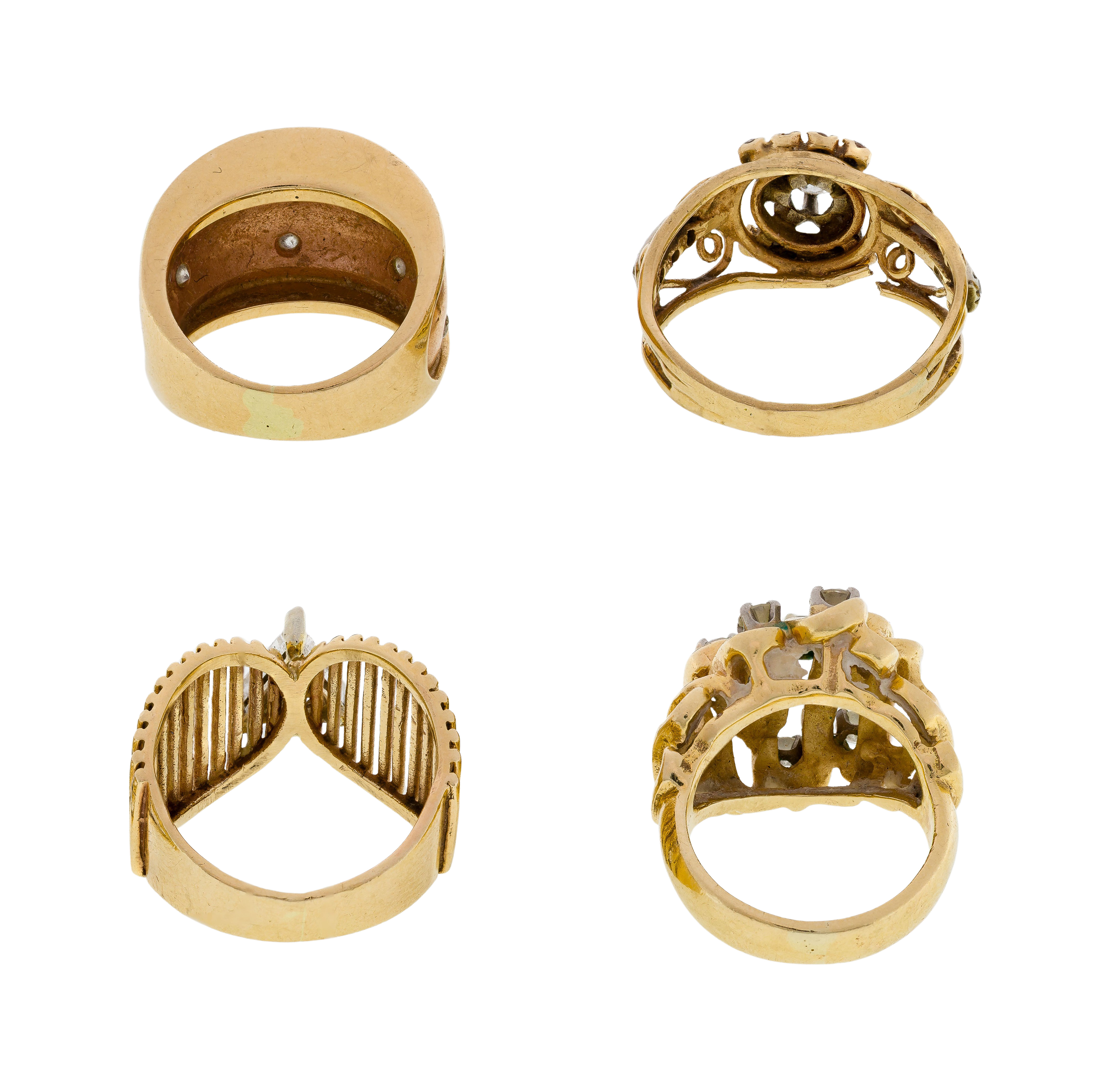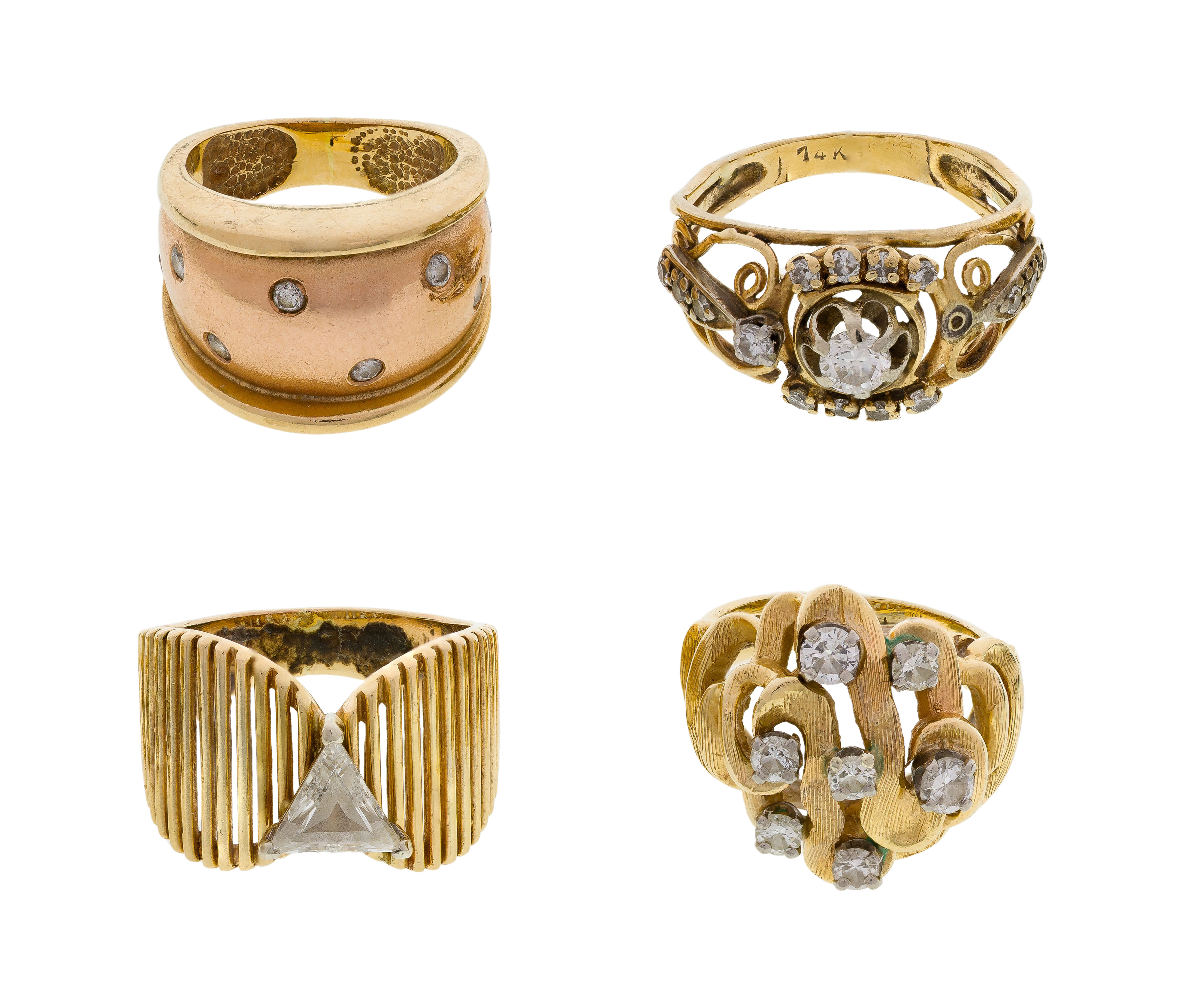 (4) items including a trillion cut diamond on a fluted band, a cluster style having seven round cut diamonds approximately 0.60 carat total weight, a bi-color band having diamond accents on top and an open style band having a center round diamond approximately 0.25 carat surrounded by sixteen diamond accents (all marked ’14k’)