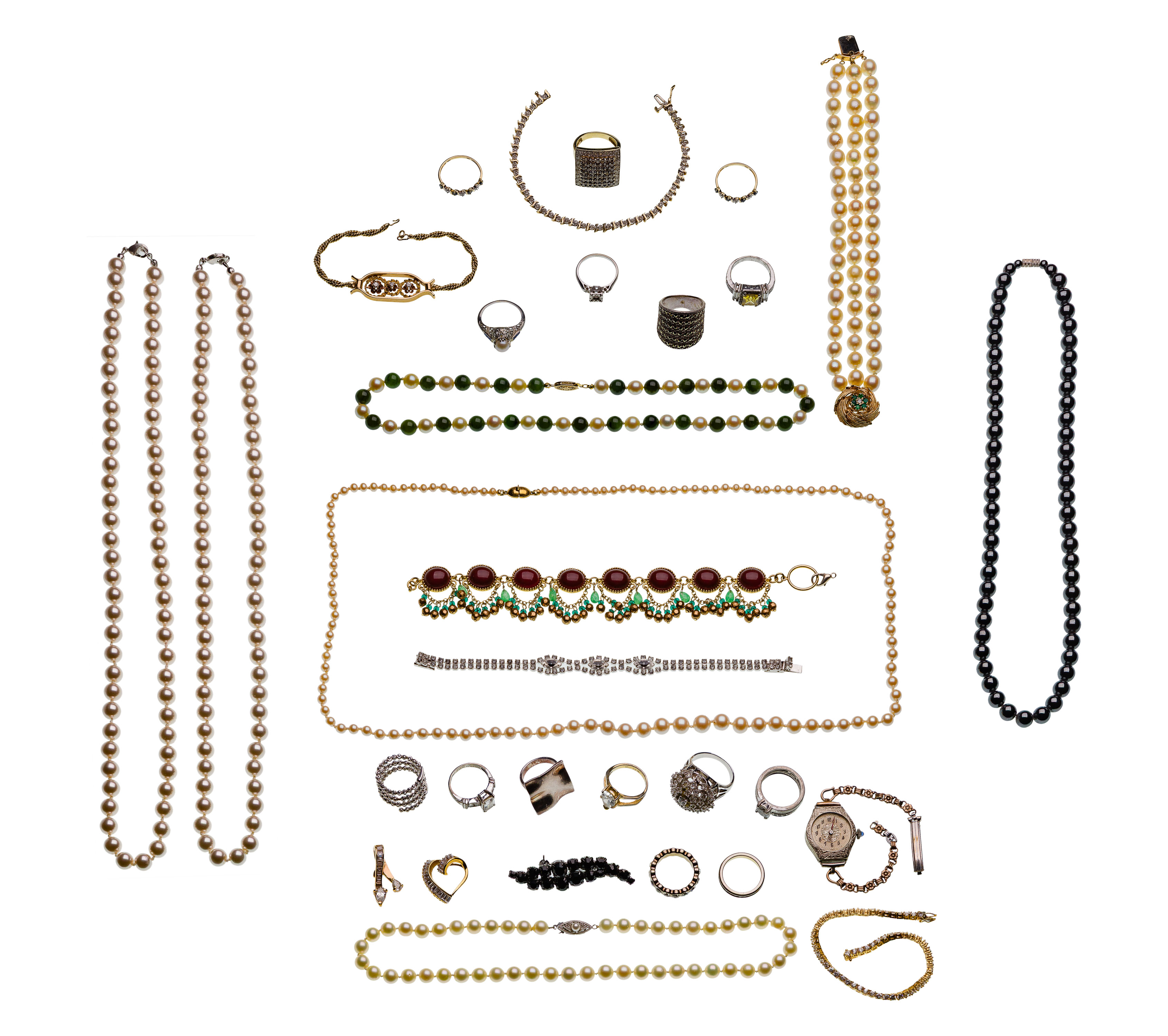 (11) items including a pearl ring (unmarked 18k), a pearl and jade single-strand necklace, a triple-strand pearl bracelet (marked ’14k’) a bracelet having round cut diamond accents (unmarked 14k, 10k), (3) rings, a setting and a tennis bracelet (some marked ’10k’), two rings (marked ‘925’) and approximately a pound of costume jewelry