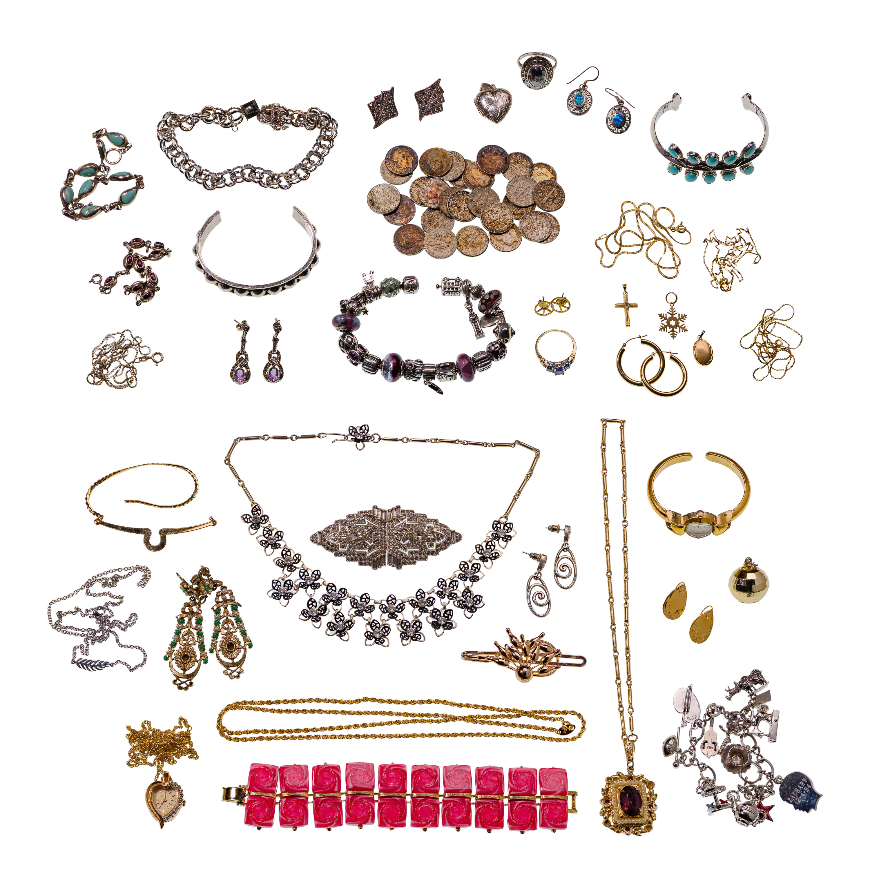 Including (3) chain style necklaces, (3) pendants and (2) pairs of pierced earrings (most marked ’14k’), a sapphire ring (marked ’10K’), a Pandora bracelet having (21) attached charms (one Murano, rest marked ‘925’ and ‘ALE’) as well as bracelets, earrings, necklaces and pendants (most marked ‘925’); together with $2.70 face value in US 90% silver Roosevelt 10c and approximately a pound of fashion jewelry