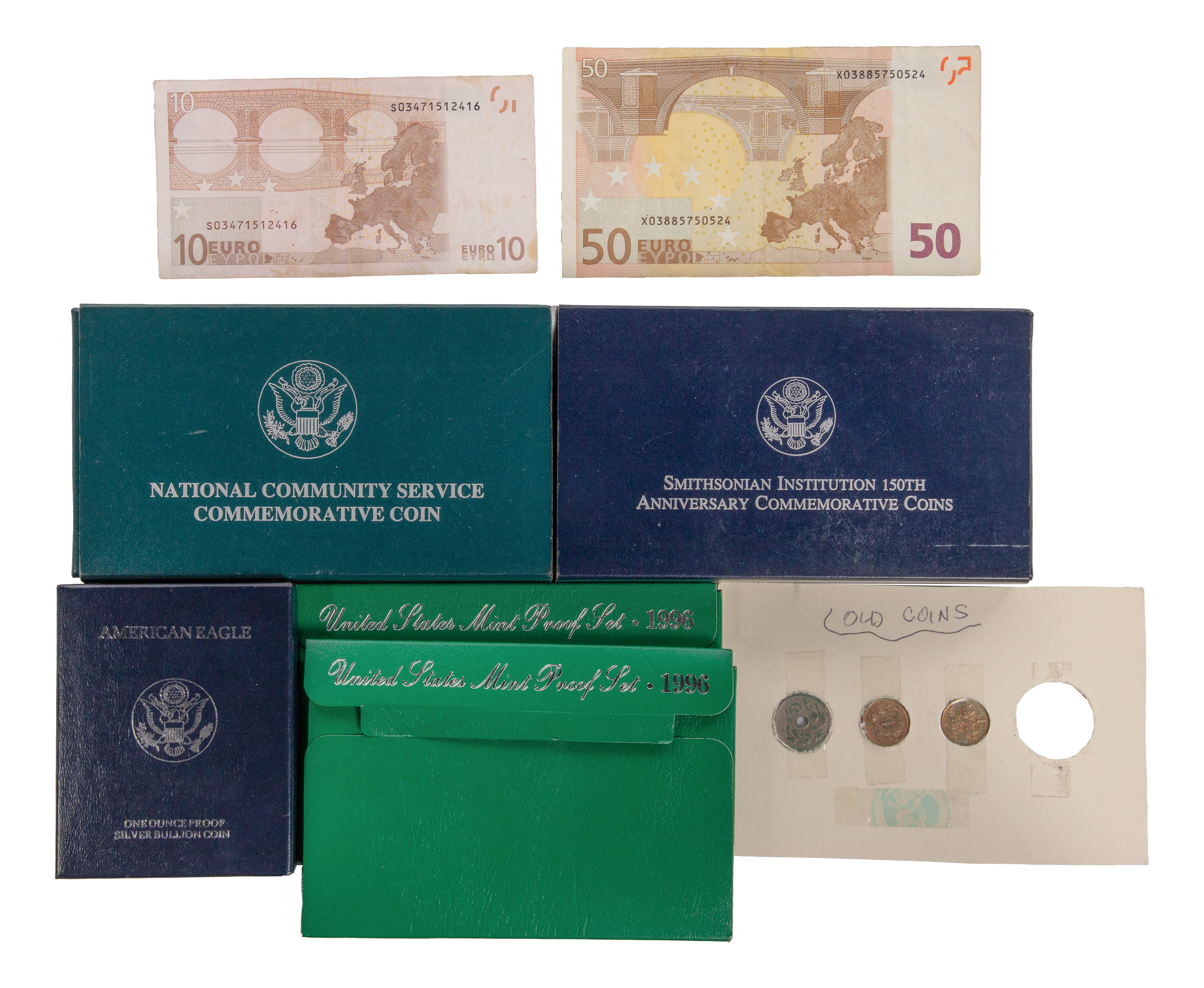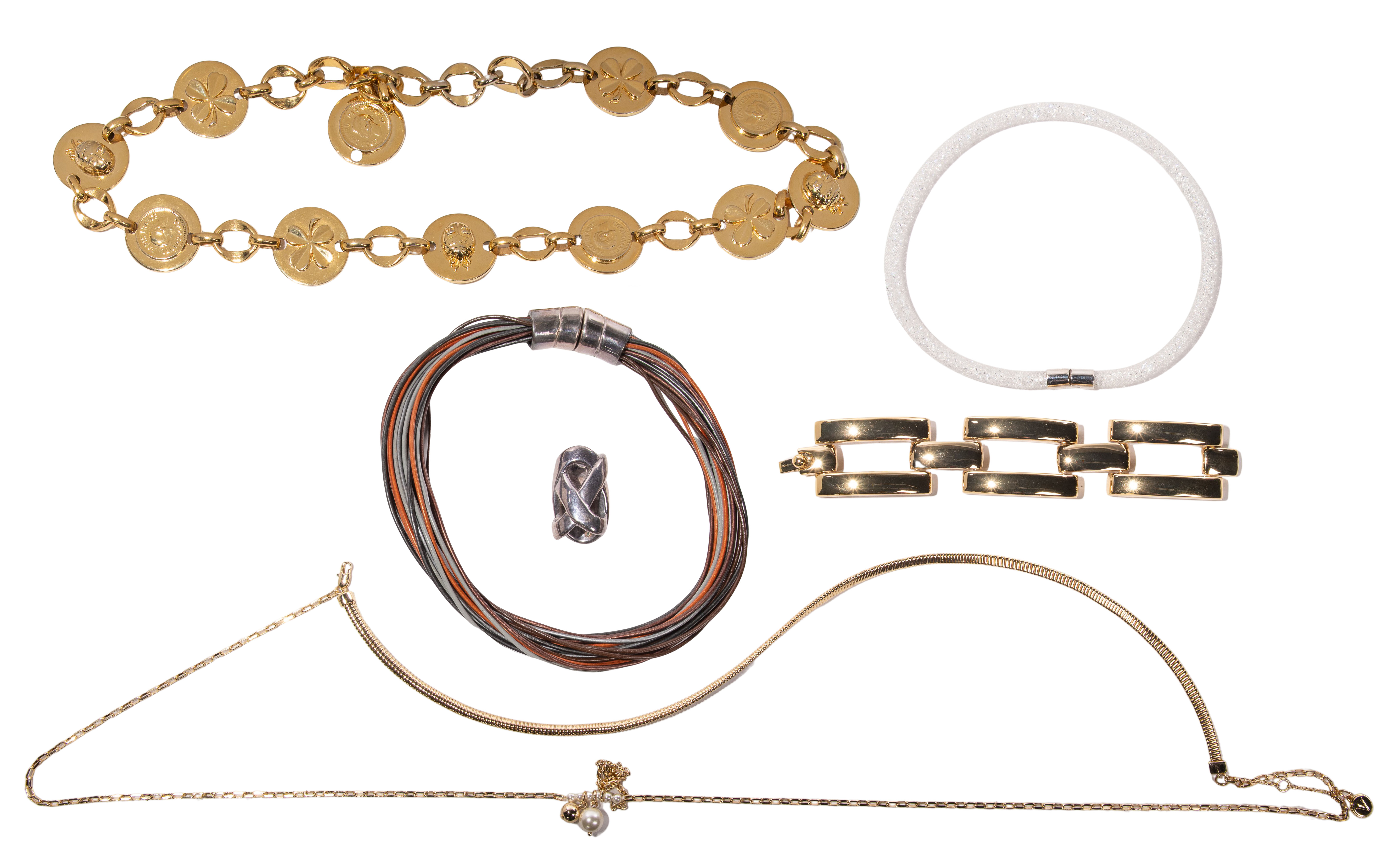 Including a pair of oval jade pierced earrings (unmarked 14k), a thimble (unmarked 9k), a pair of hoop pierced earrings and a choker (marked ‘925’) as well as a Cartier vermeil tank watch, a Chanel multi strand pearl runway necklace having four strands attached to an orange gripoix pendant, in original display sleeve and a Cuban link bracelet (marked ‘Chanel’), (2) 1996 mint proof sets, (2) commemorative sets, some foreign currency, an American eagle coin and approximately (8) pounds of fashion jewelry including watches, necklace, bracelets and earrings