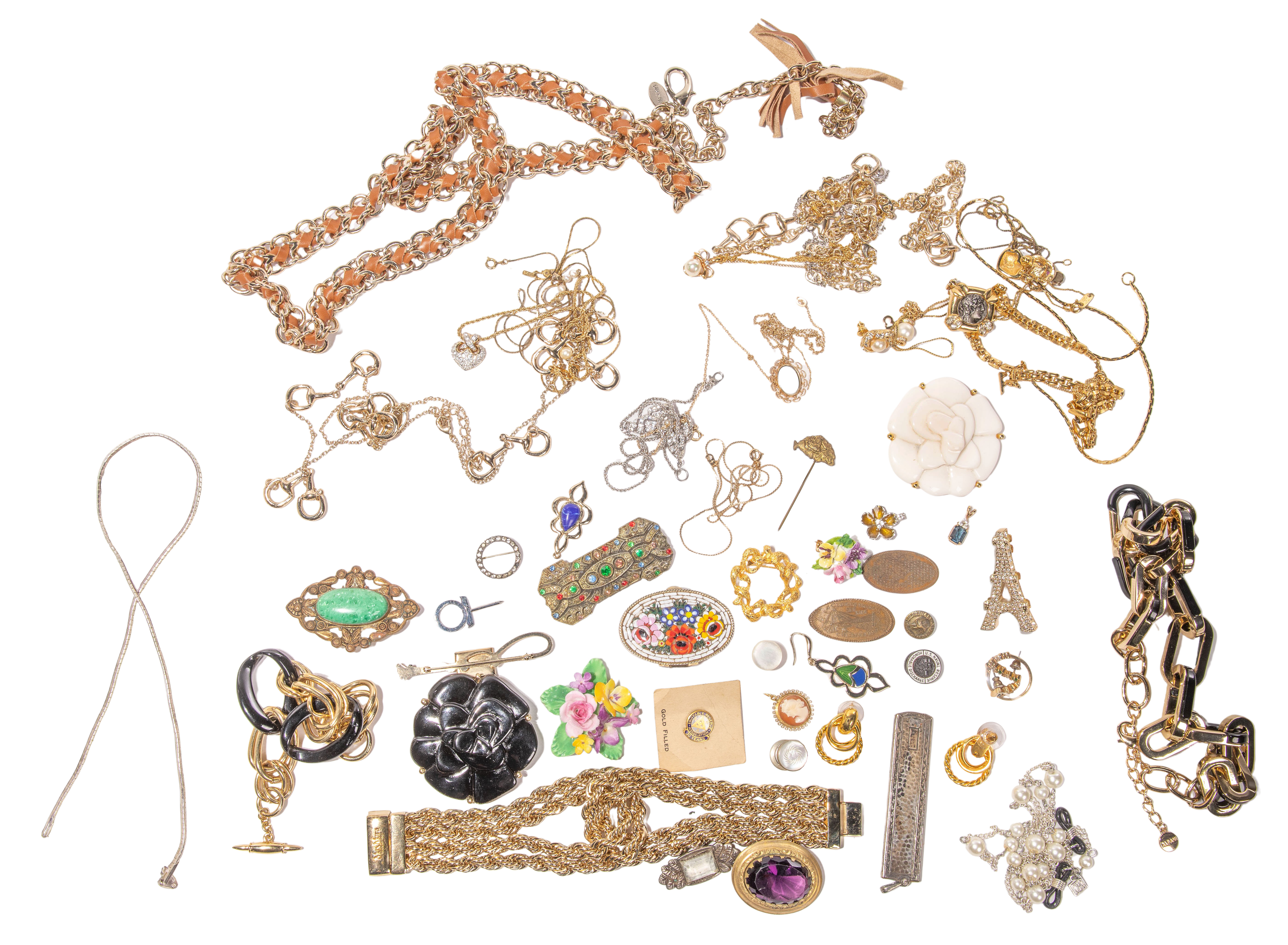 light to moderate wear consistent with use, some tarnish and scratches, Cartier wristwatch not running when tested, Chanel runway having minor pitting to pearls, finish wear on hardware and pearls, some of the black sleeve stuck to pearls and pendant, some items unmarked but XRF tested as 14k / 9k gold