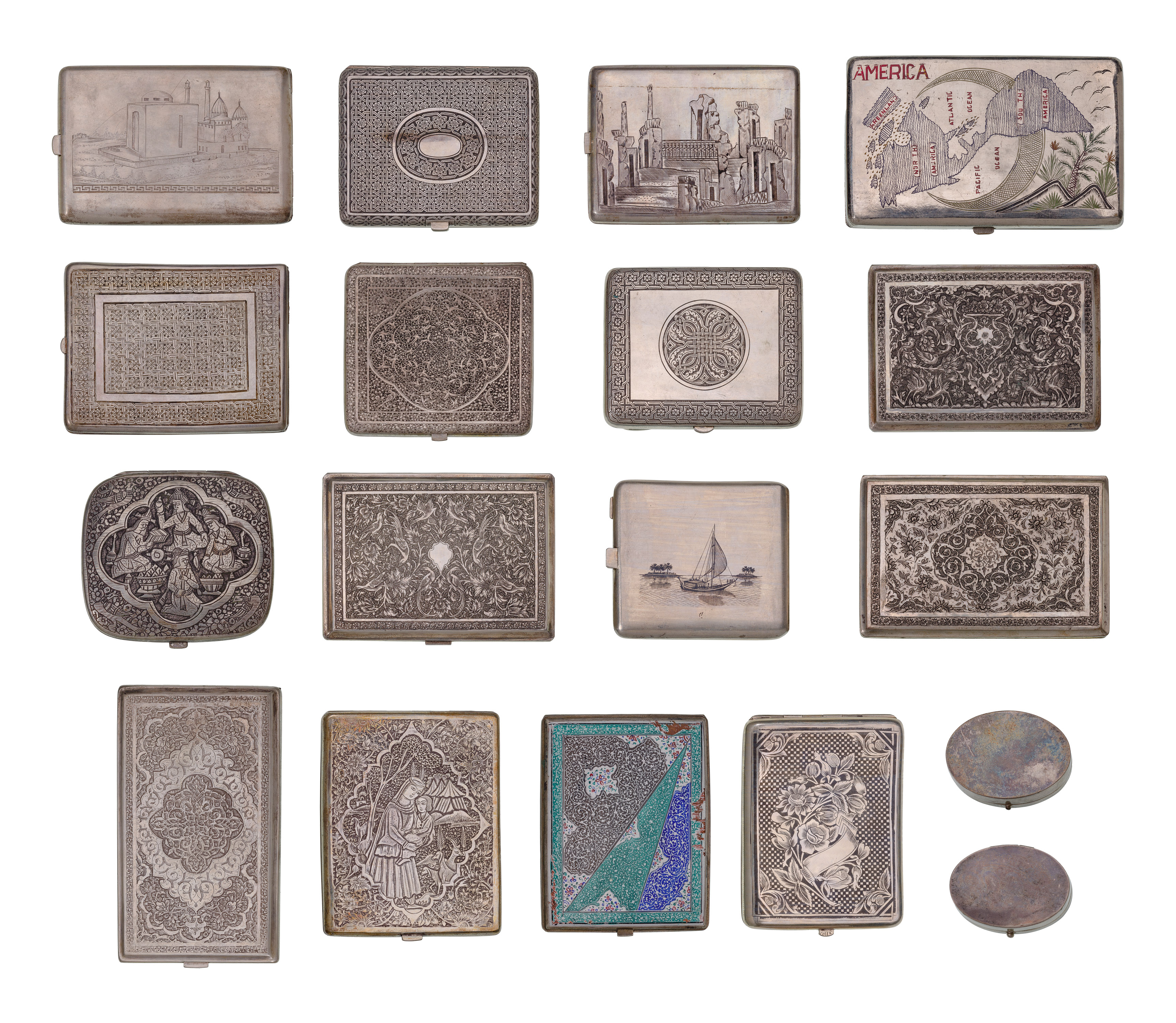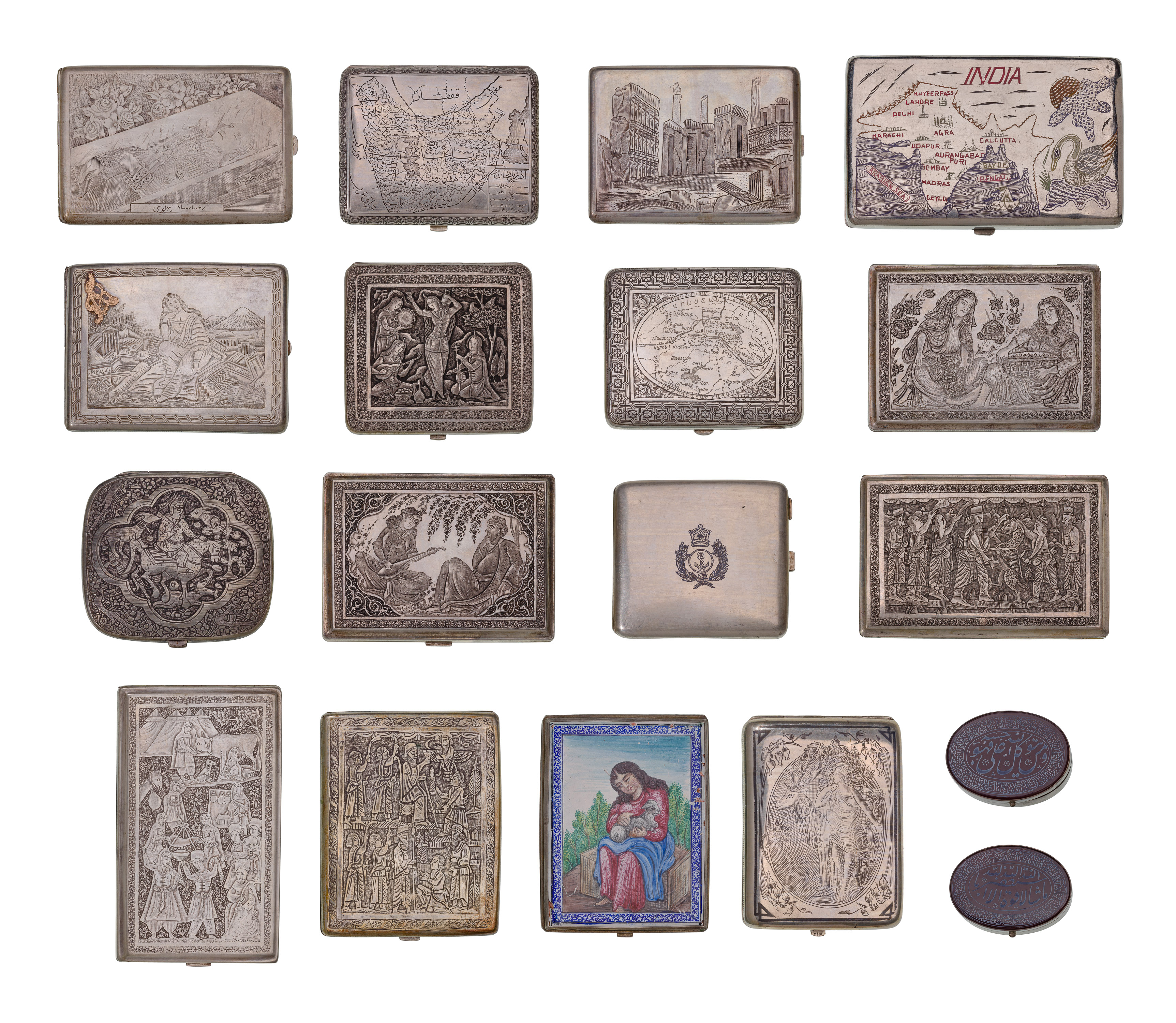 (18) items of various shapes, sizes and styles including (4) cases (unmarked 900 silver, 368 grams), (4) cases (unmarked 850 silver, 532 grams), (3) cases (some marked 800 silver, 372 grams), (4) cases (unmarked 750 silver, 608 grams, one having 14k gold applied initials) and (2) cases (unmarked 600 silver, 274 grams, one enameled) as well as a non-silver metal case, all having intricate engravings, some having Arabic motif