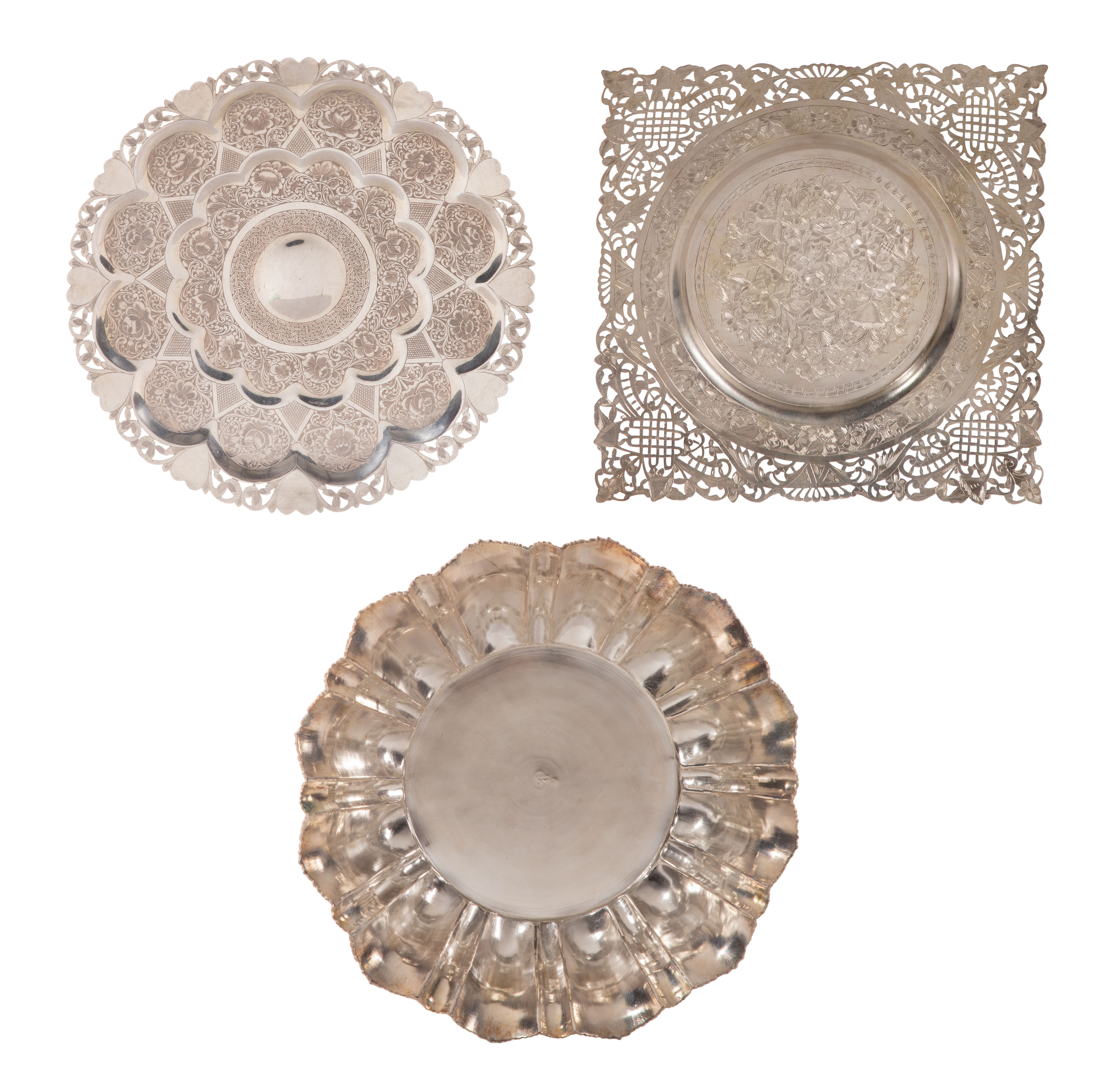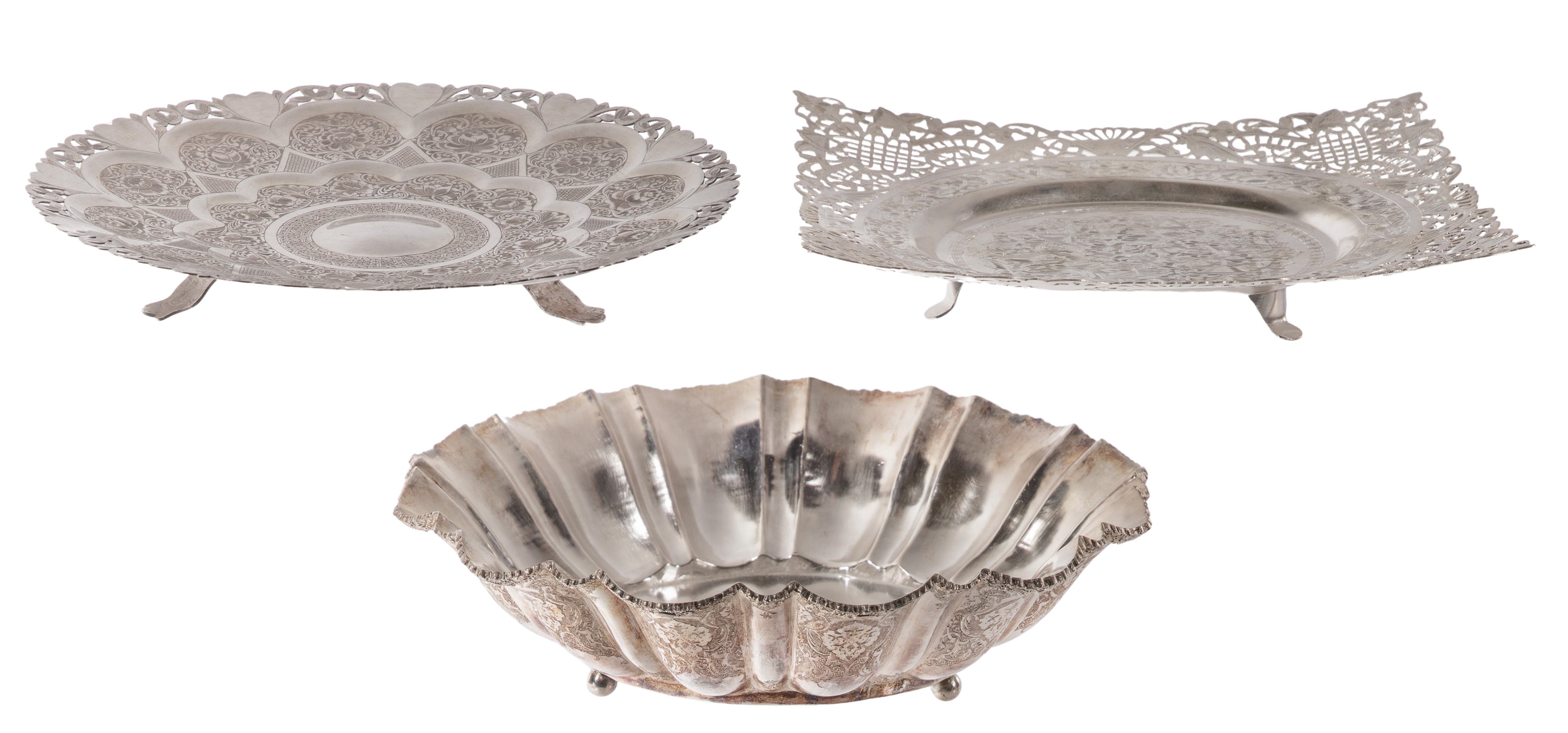 (3) items, all having intricate engraving including a scalloped bowl and (2) footed trays (marked in Arabic on undersides)