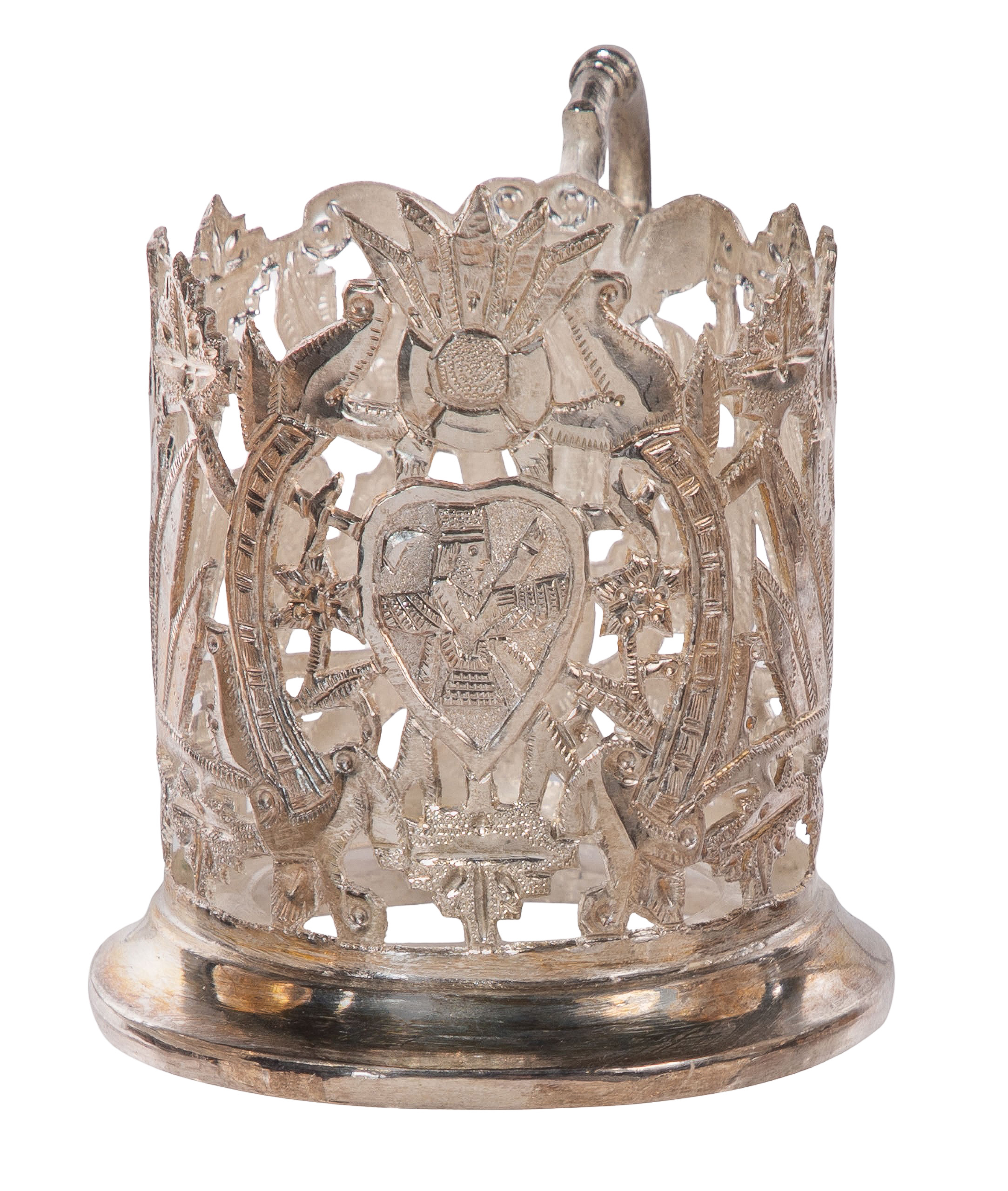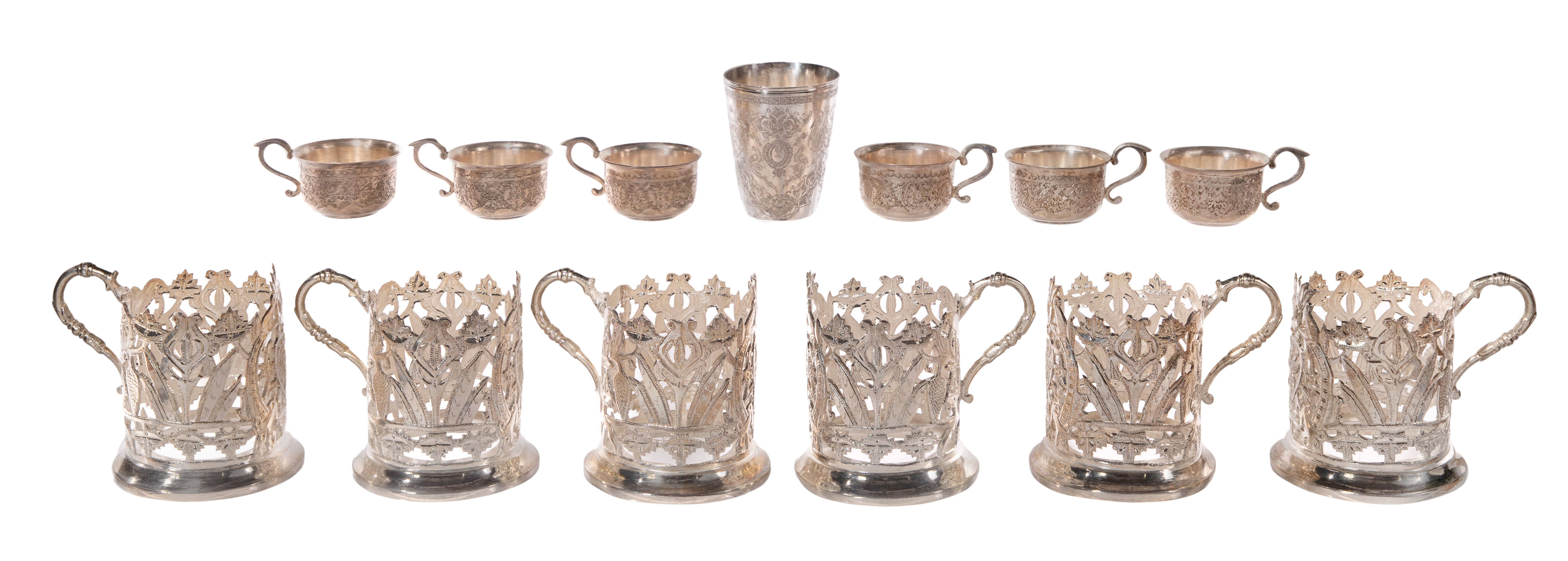 (13) items including a set of (6) openwork cup holders (unmarked 950), a set of (6) cups (marked in Arabic 925) and a tumbler (marked in Arabic 900)