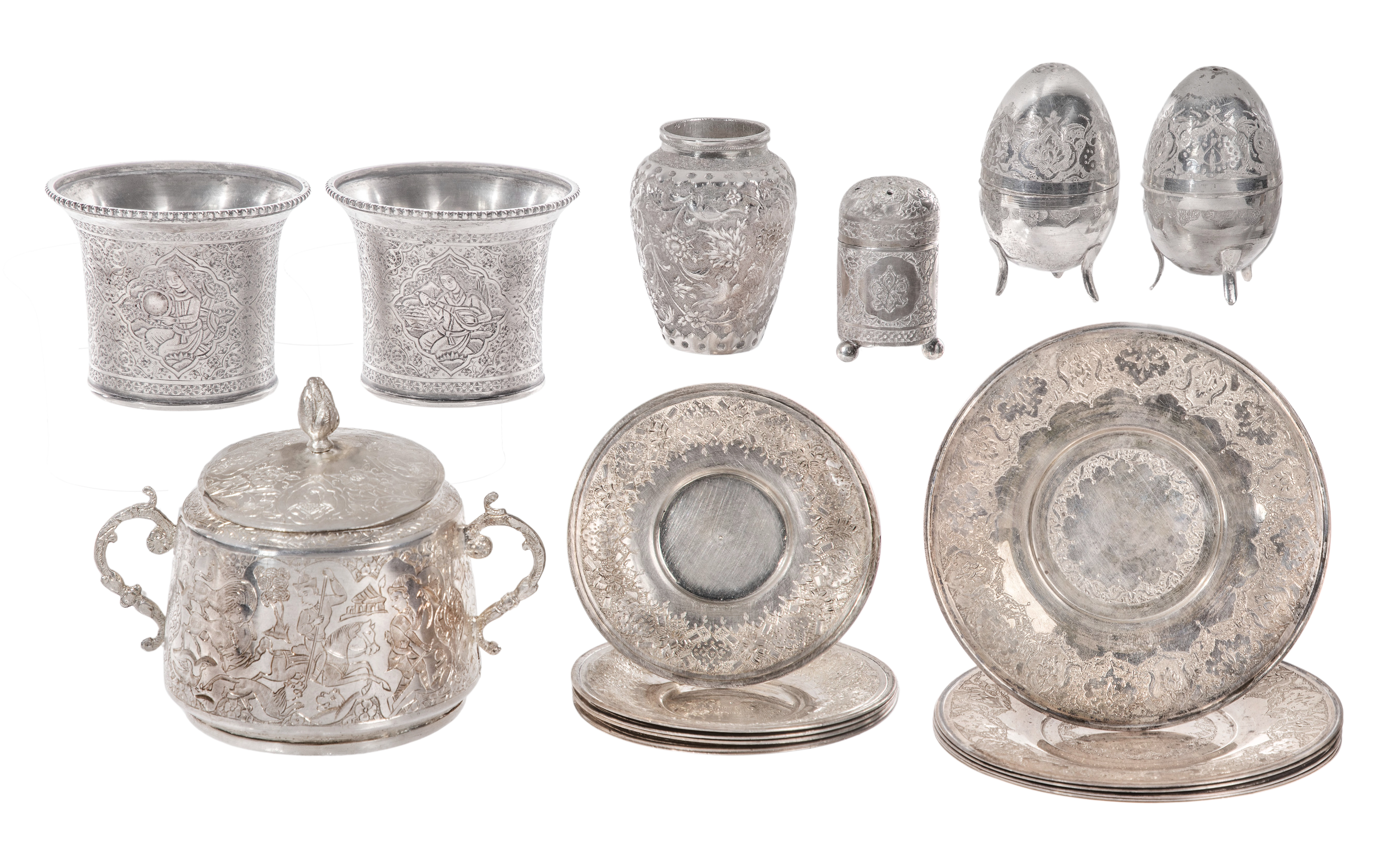 (16) items including a lidded sugar bowl (unmarked 925), a set of (5) saucers (marked ‘Iran 900′) as well as a set of (4) saucers, (2) cups, a pair of salt and pepper shakers, a spice shaker and a vase (marked in Arabic, some having ’84’)