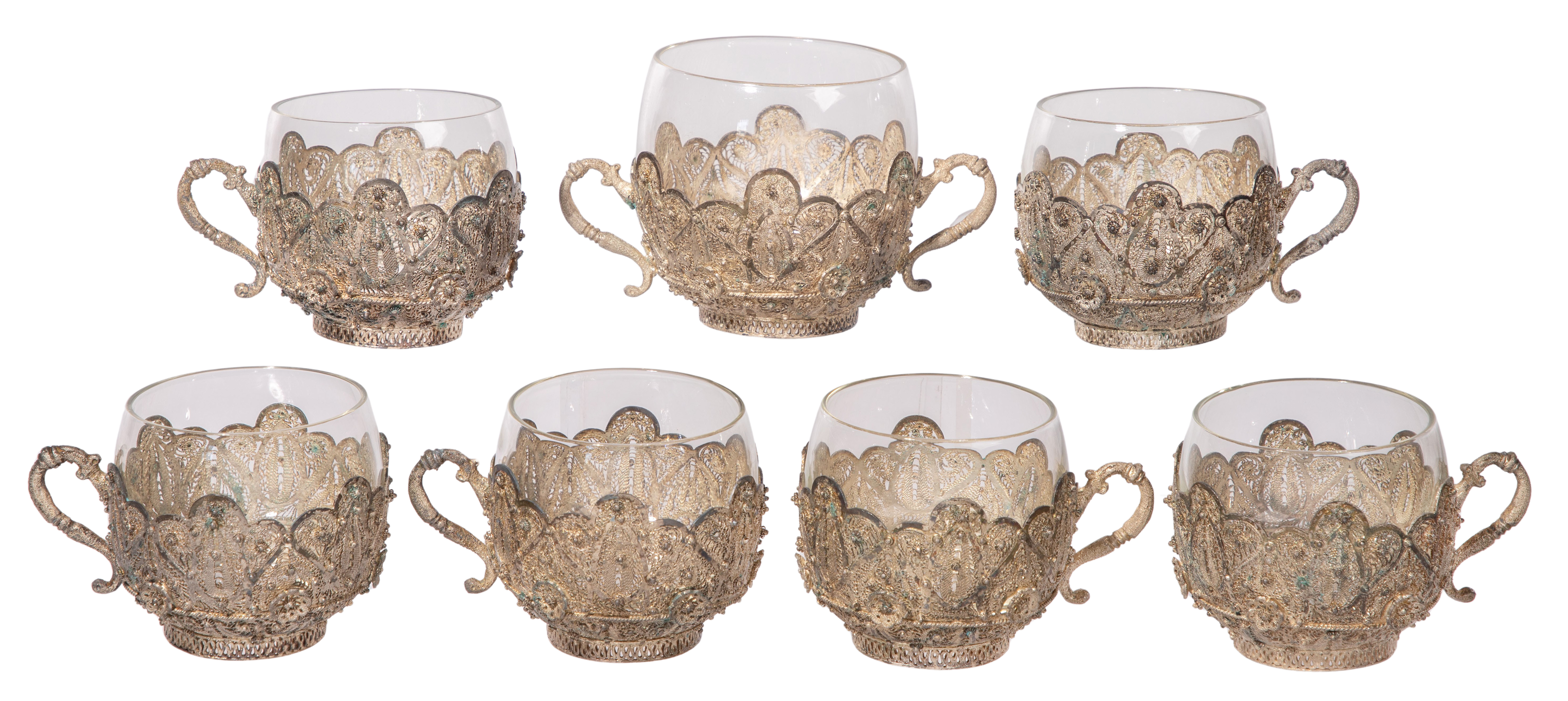 (7) items including a set of (6) coffee cups and a sugar bowl, all in an intricate openwork design having clear glass inserts (unmarked 900)