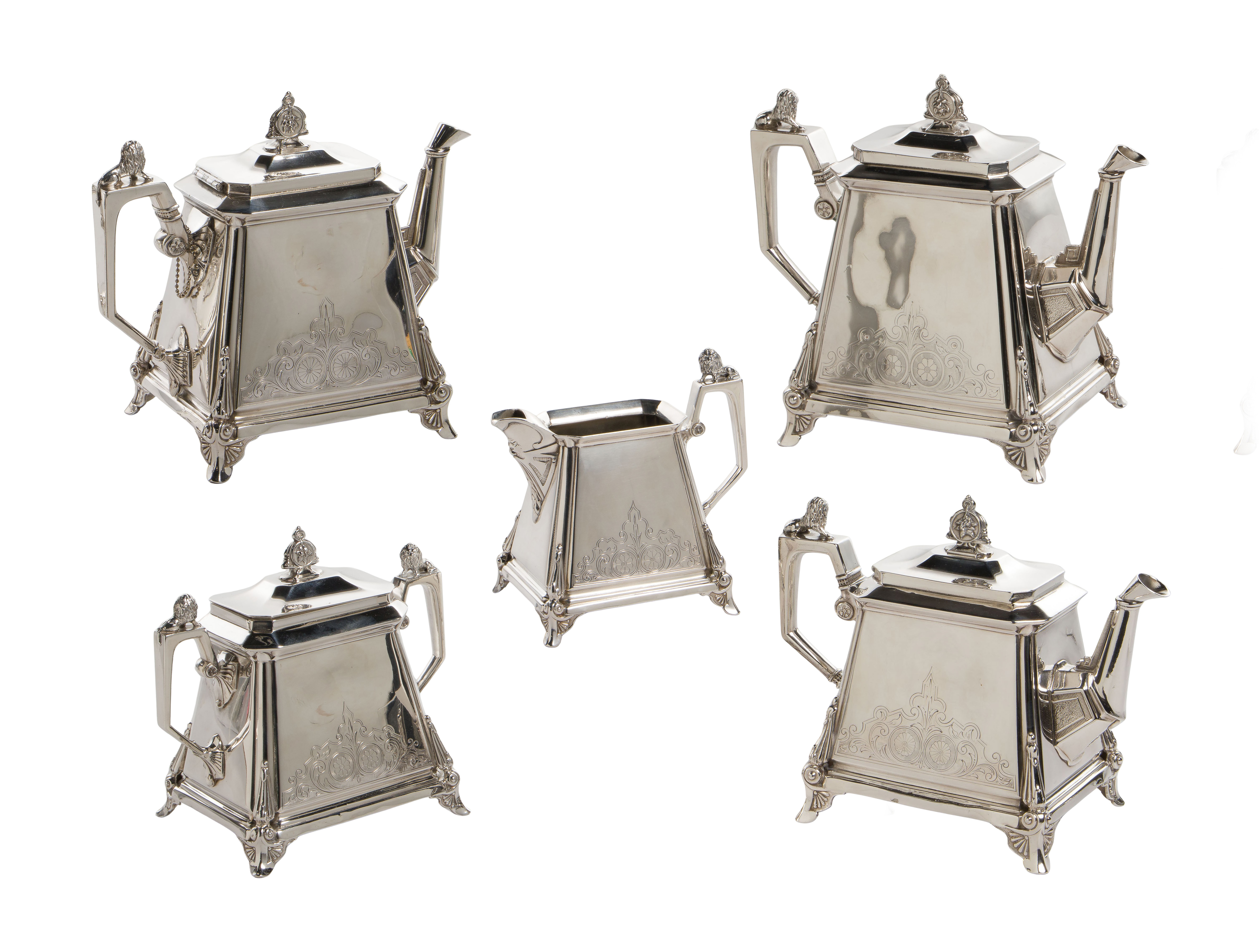 (5) items including a coffee pot, a teapot, a hot water pot, a lidded sugar and a creamer, all having engraved decorations, a lion on handle and funnel end on spouts, illegibly marked on underside