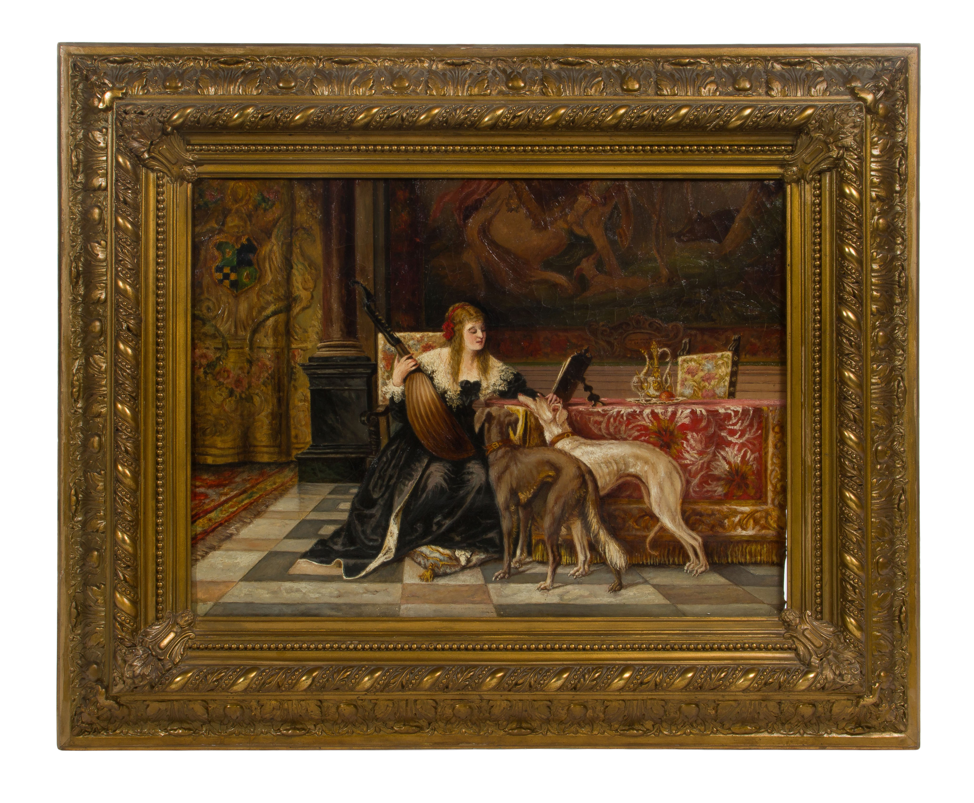 Undated, unsigned depiction of a Renaissance woman taking a pause in her lute playing to pet her dogs, in a gold-tone gesso on carved wood frame