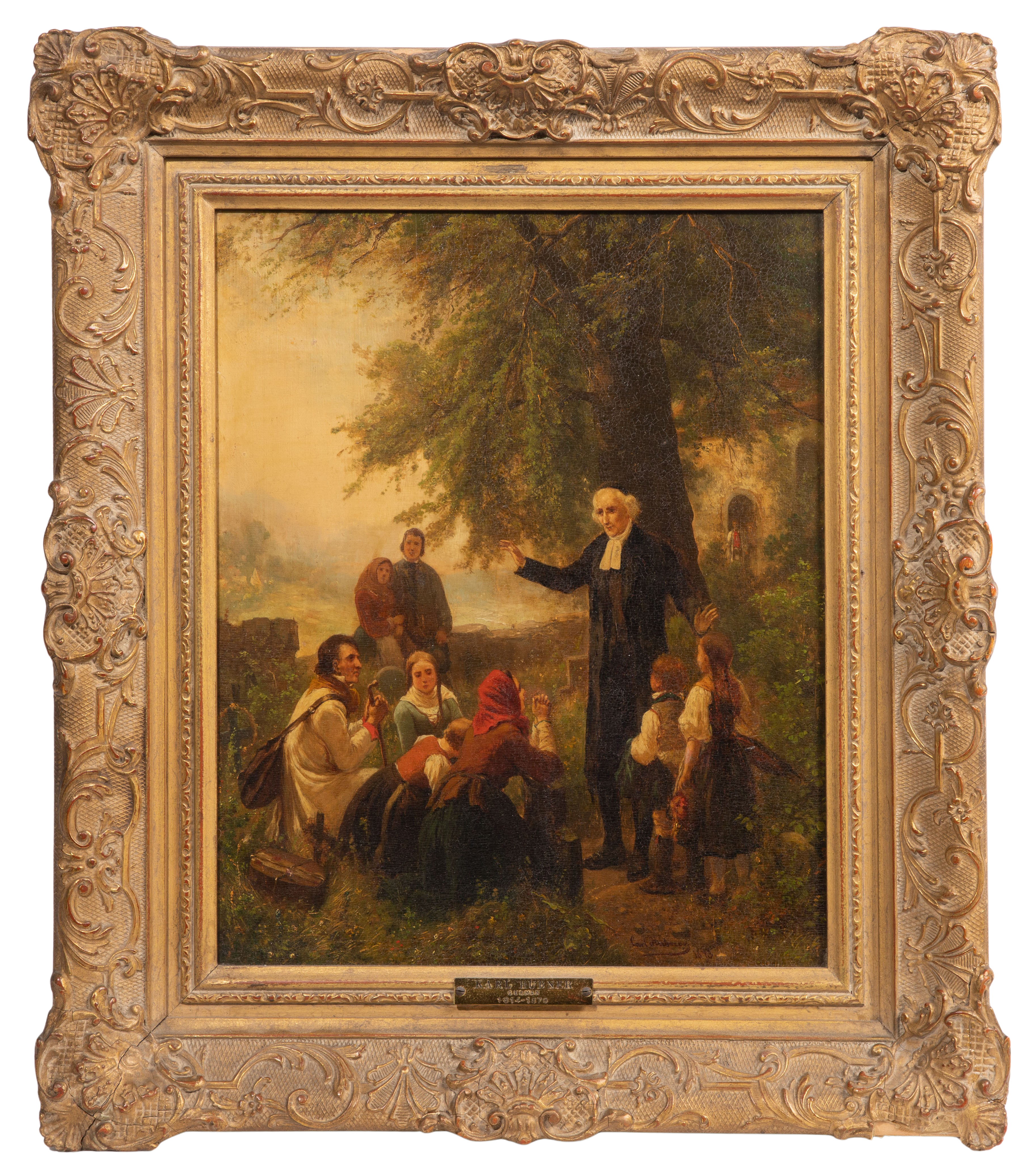 1873, signed lower right, a landscape having figures listening to a preacher, in a gold-tone gesso on wood frame with placard
