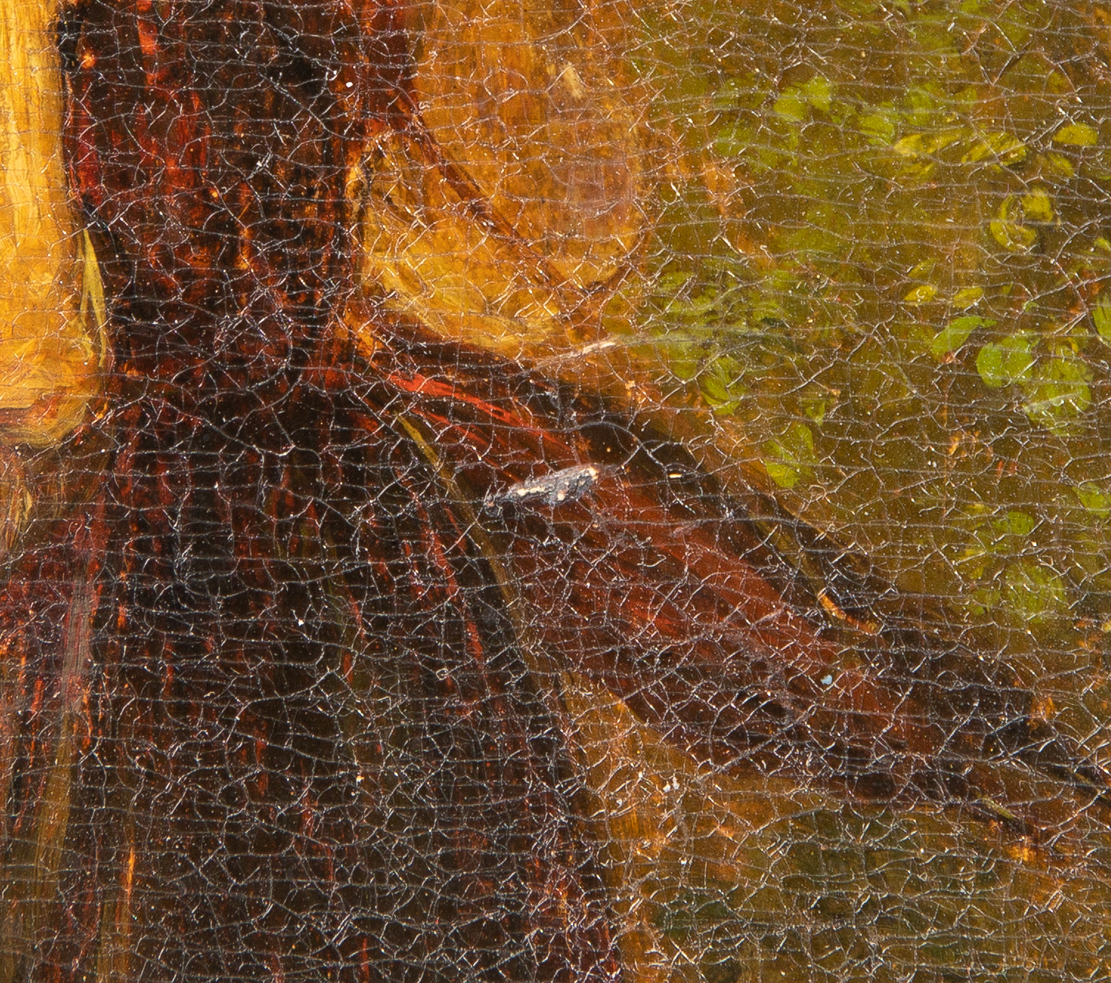 craquelure overall, light dirt accumulation, yellowing, frame having light wear