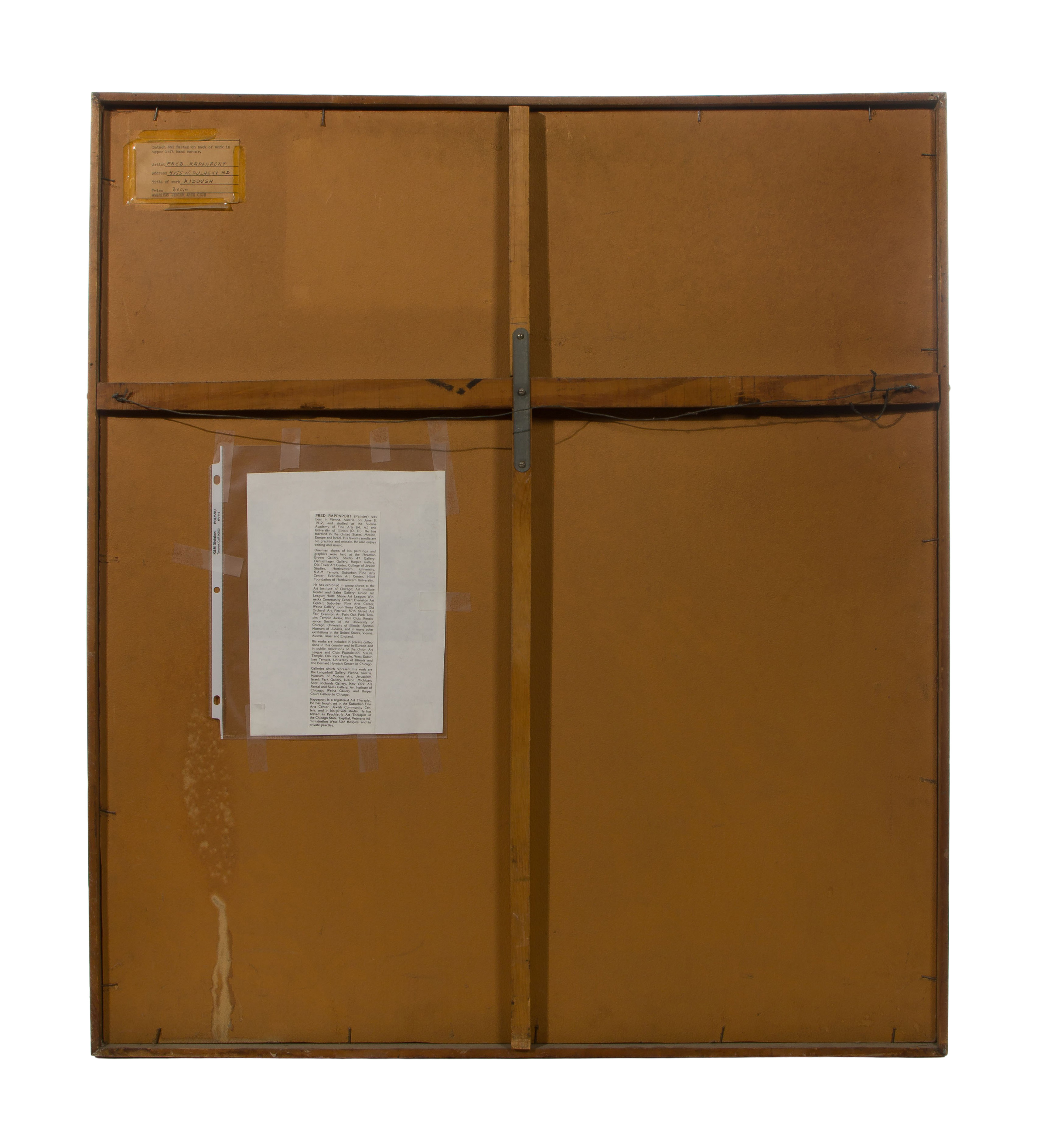 1954, signed lower left, an abstract painting of a figure appearing to be in European village and having symbols of the Holocaust, title label and artist biography verso, in wood frame
