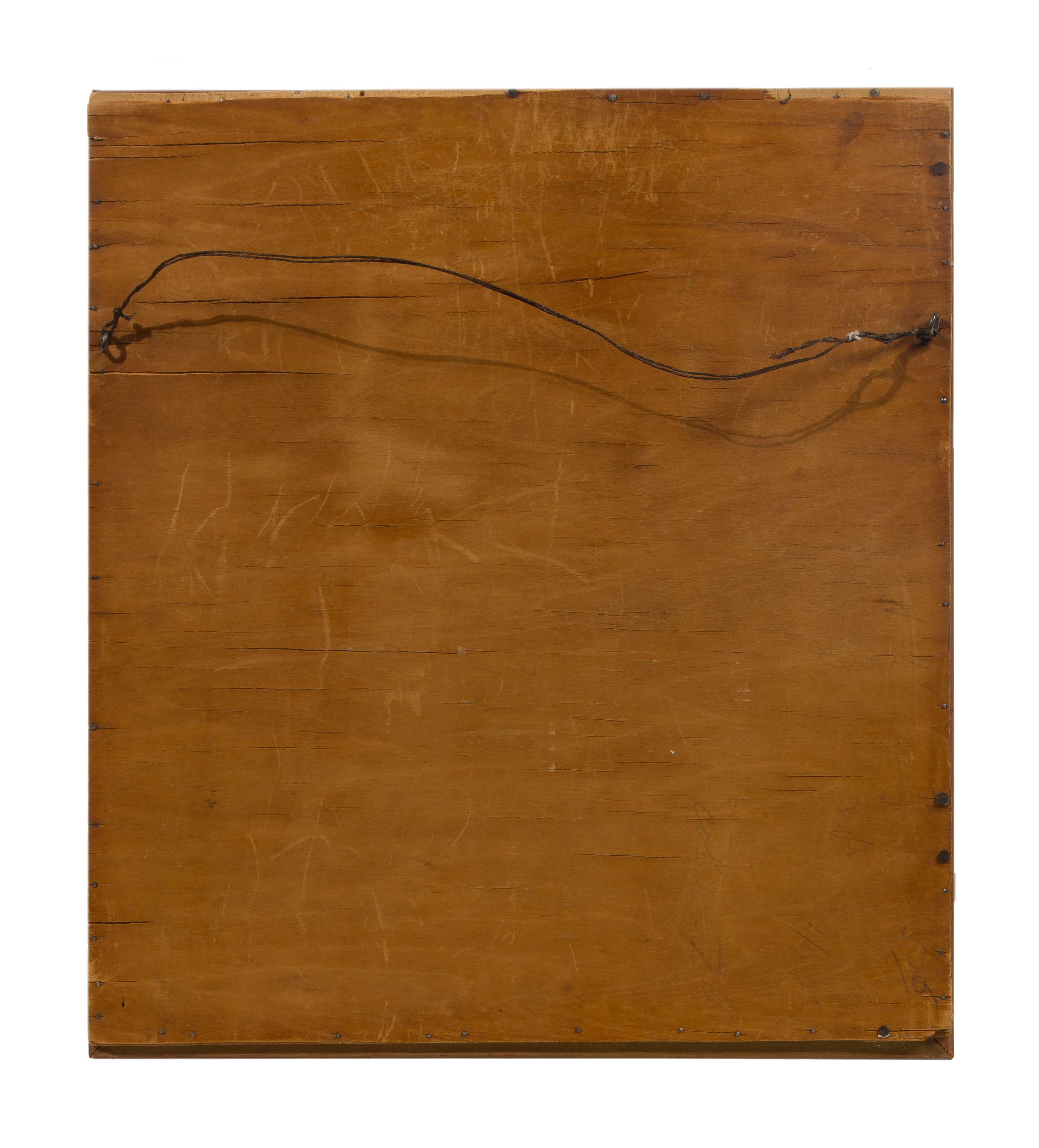 Undated and unsigned depiction of the Virgin Mary in prayer, upon a scratch-carved and gilt background, having the words ‘Santa Maria Virgo’ around the circumference of the halo, behind glass in a gold-tone wood frame