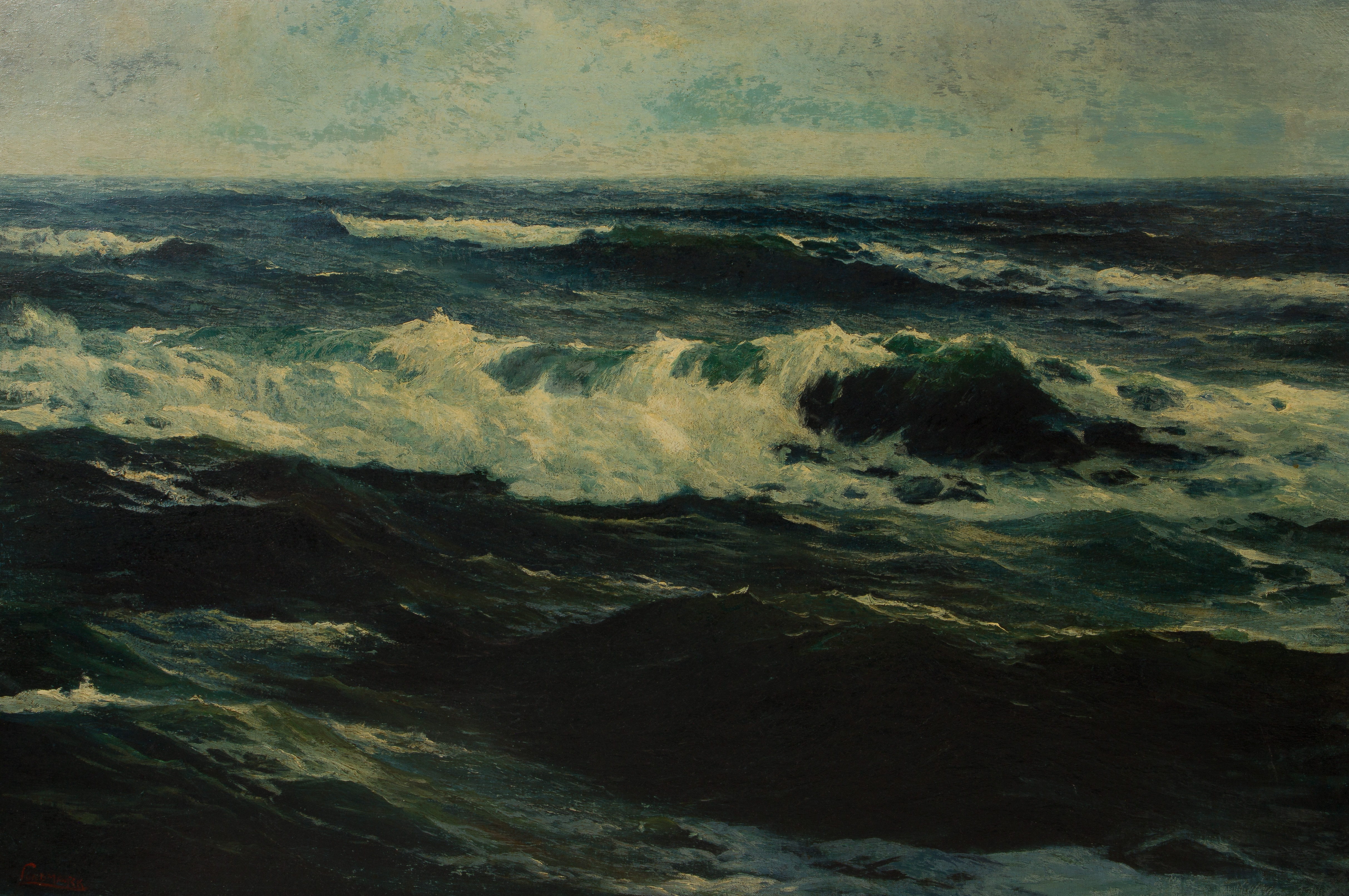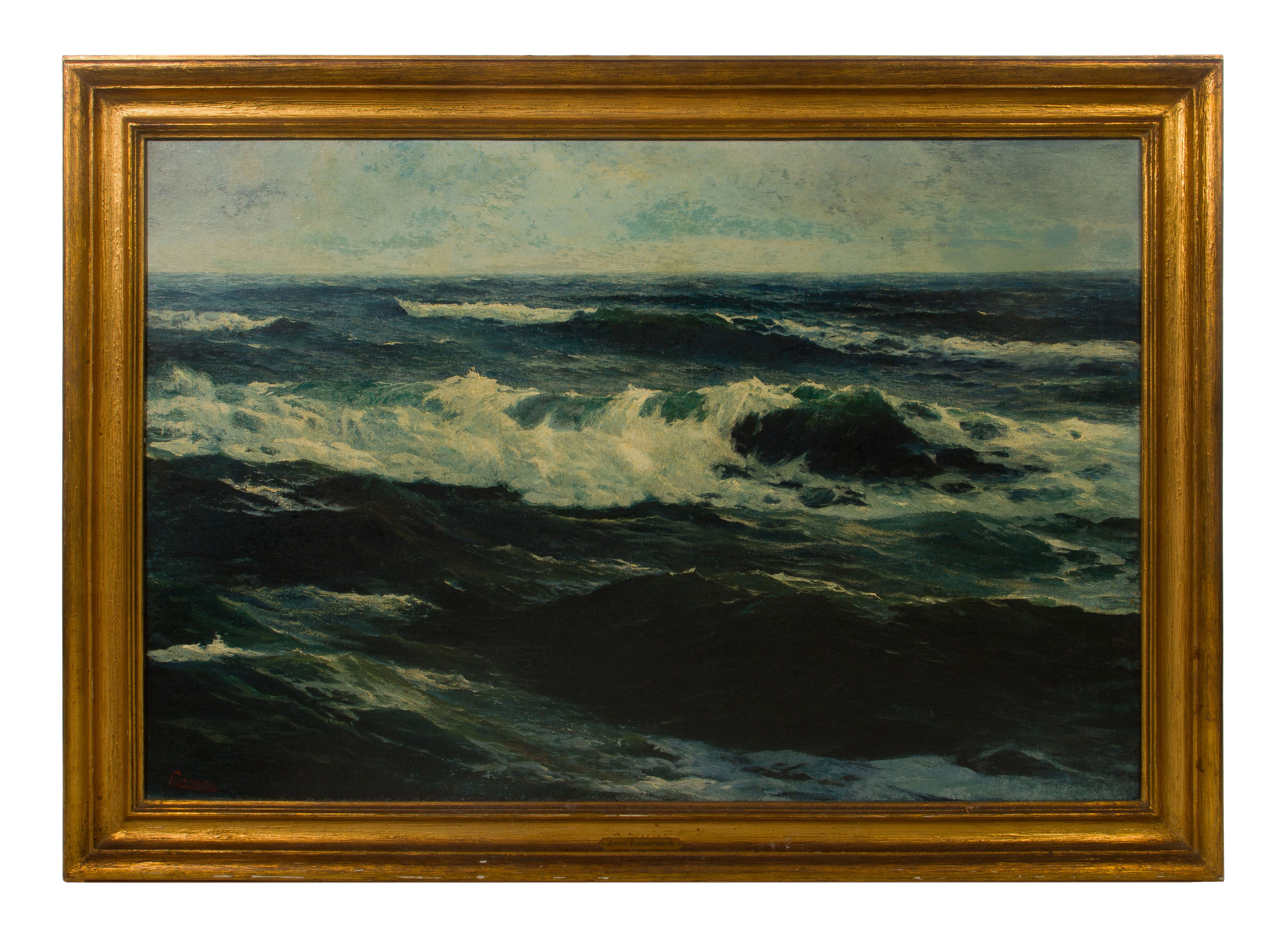 Undated, signed lower left, depicting waves crashing on the shore, in a painted gold-tone wood frame with placard
