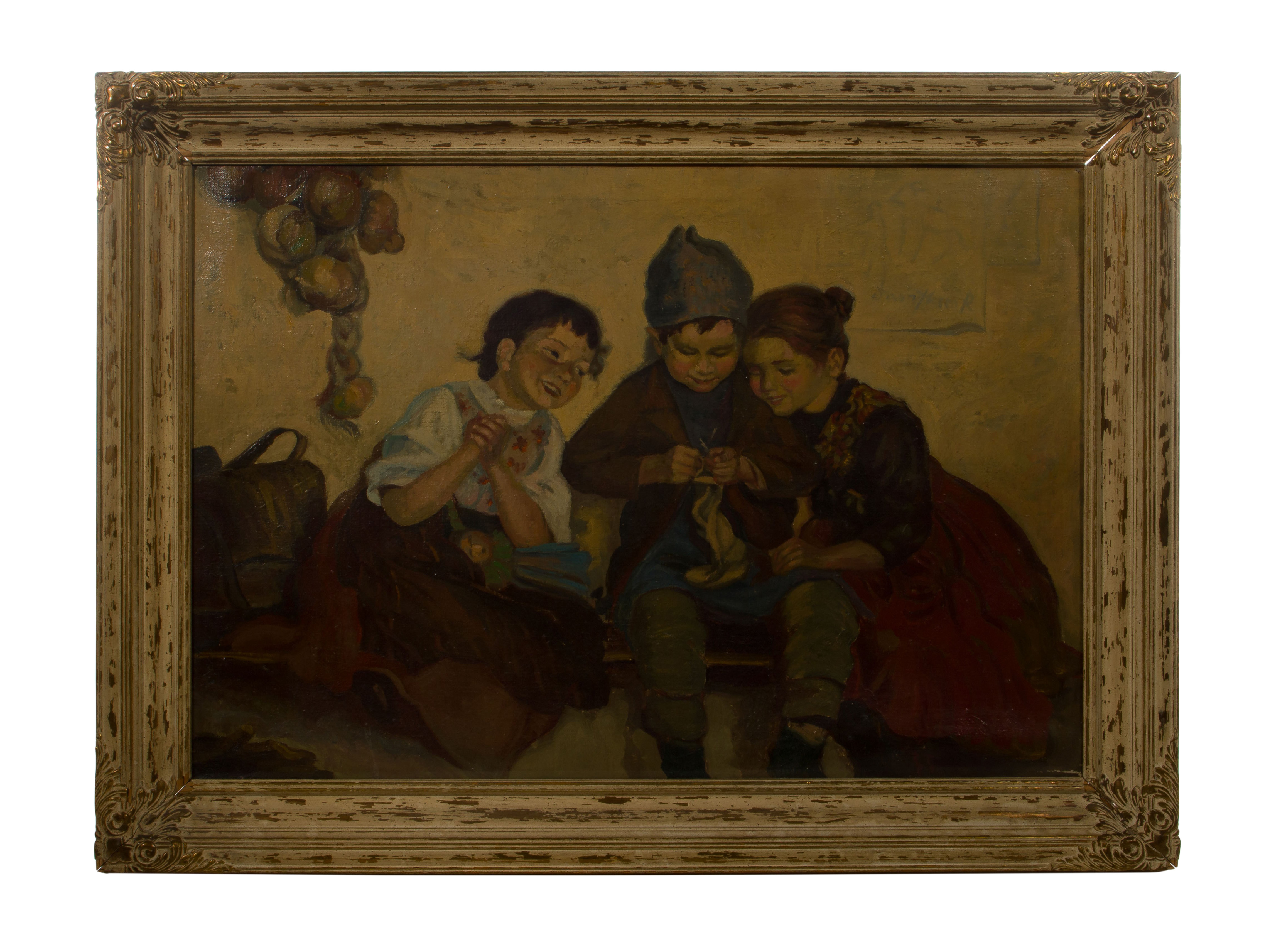 Undated, unsigned, in the style of Marie Mussi Wunsch, depicting a young boy learning to knit while two young girls look on, in a gold-tone weathered wood frame