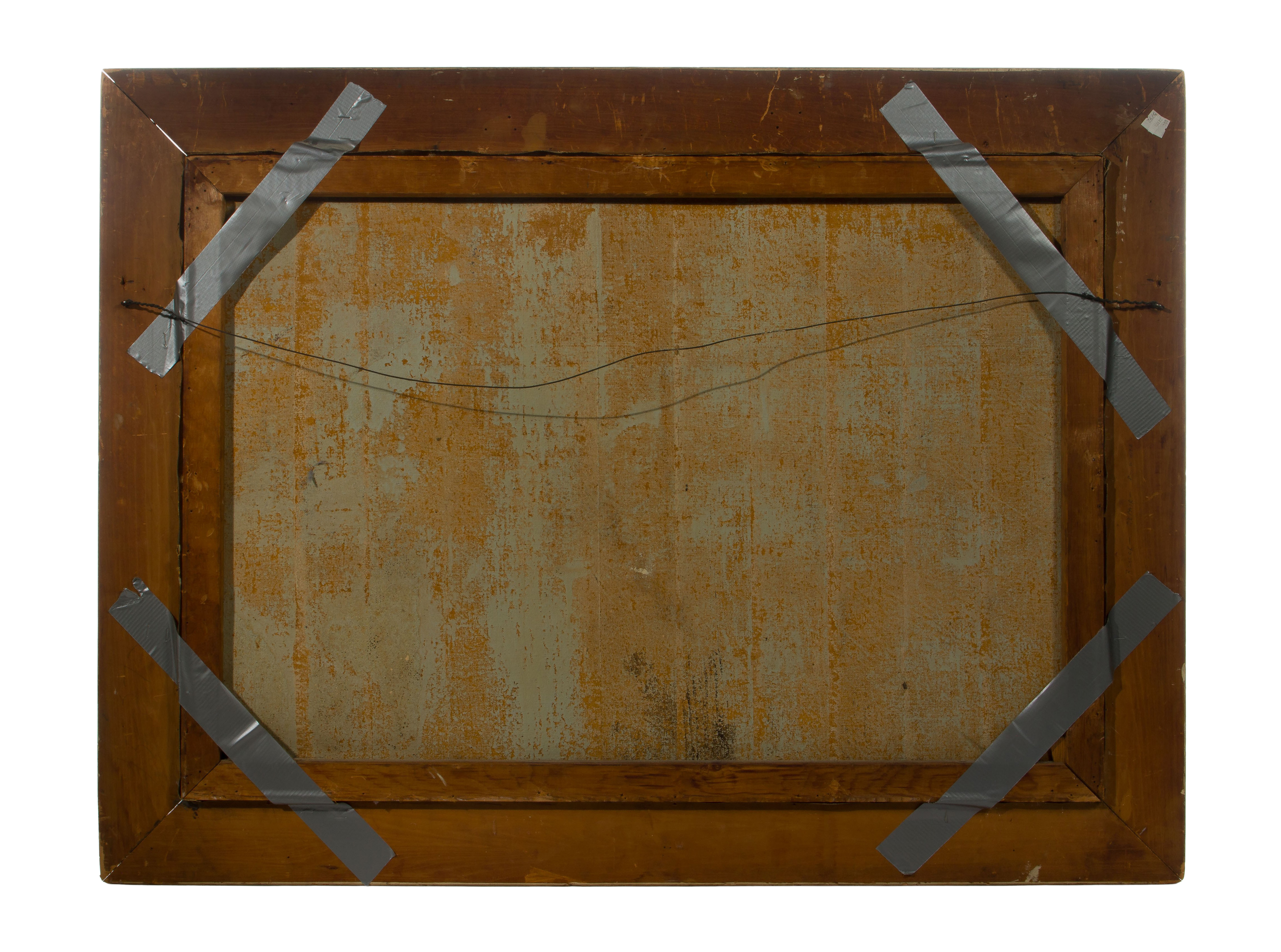Condition: light dirt accumulation, stretcher marks, blistering on the lower right, missing paint lower right, areas of minuscule white dots, pencil marks upper right quadrant, loose in frame, frame having minor wear