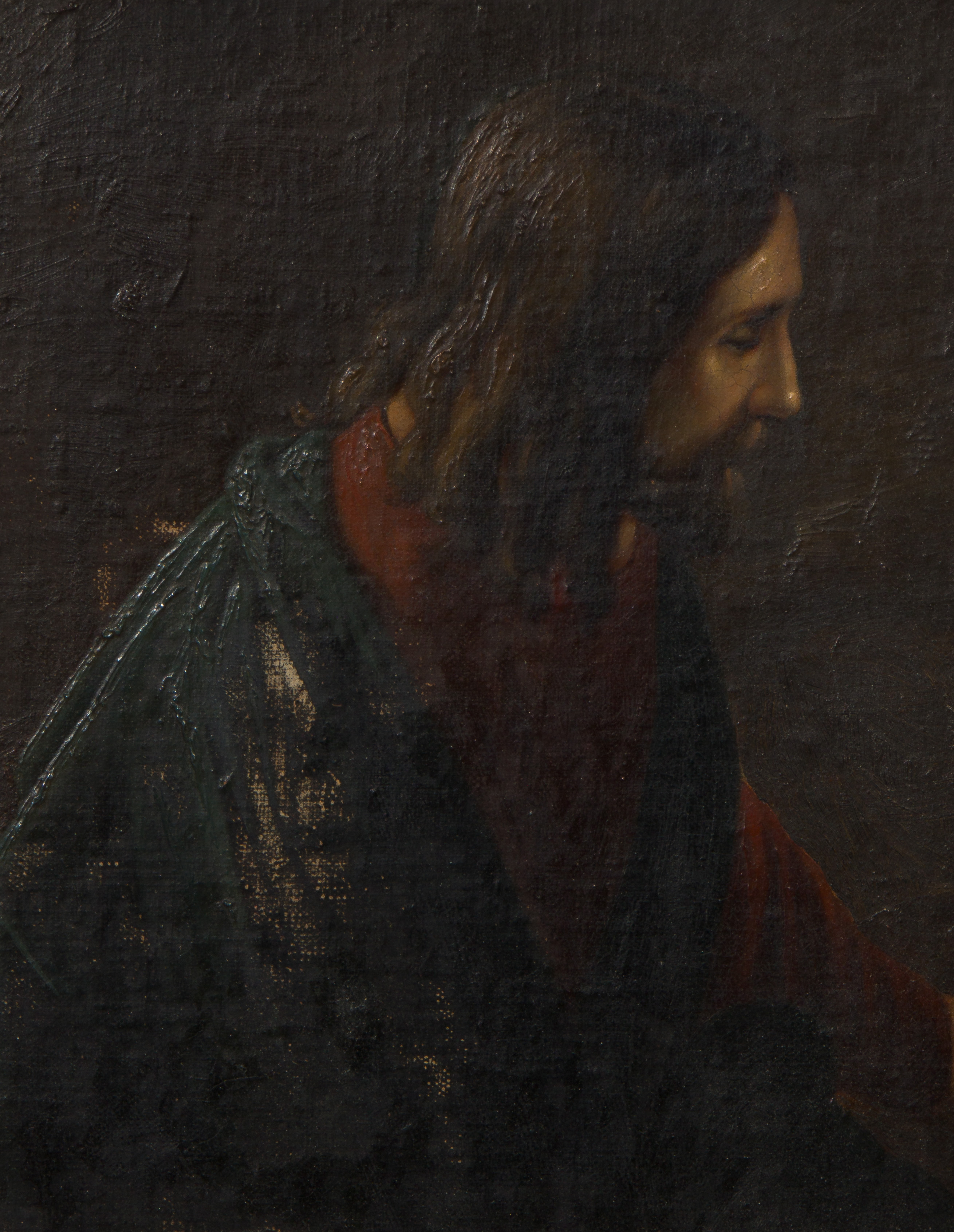areas of blistering and paint loss on robes and upper edge, frame having wear including separating corners