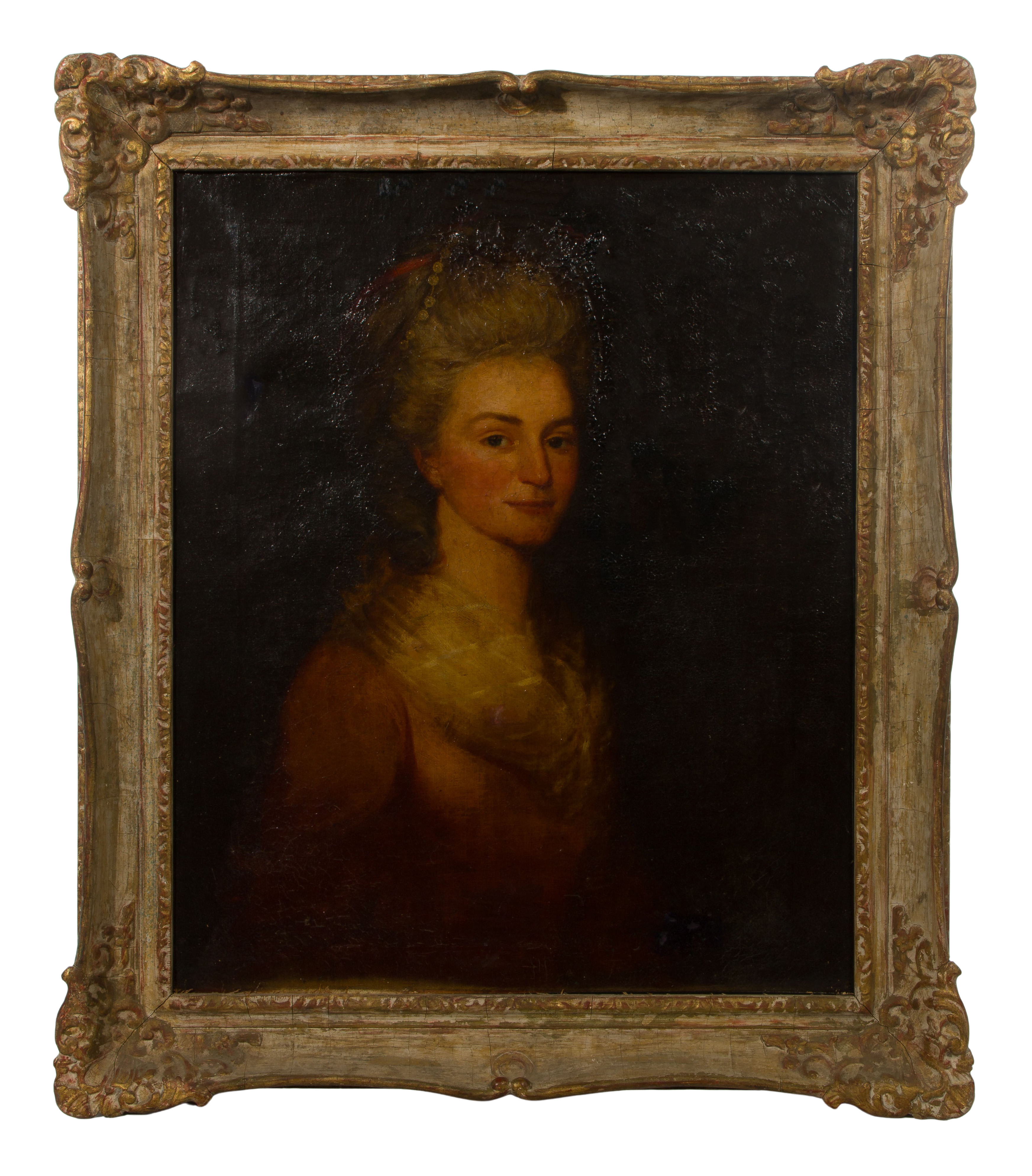 Undated, unsigned, a portrait of a young lady in the style of Sir Thomas Lawrence, in a worn gilt wood frame