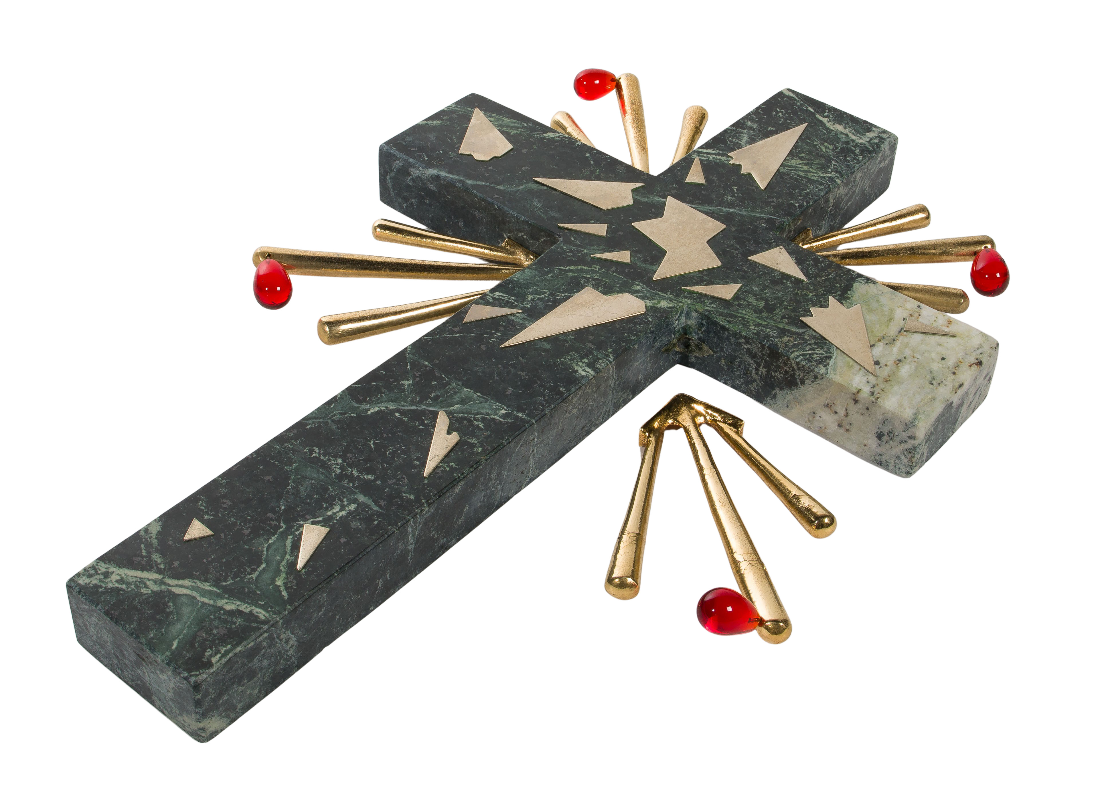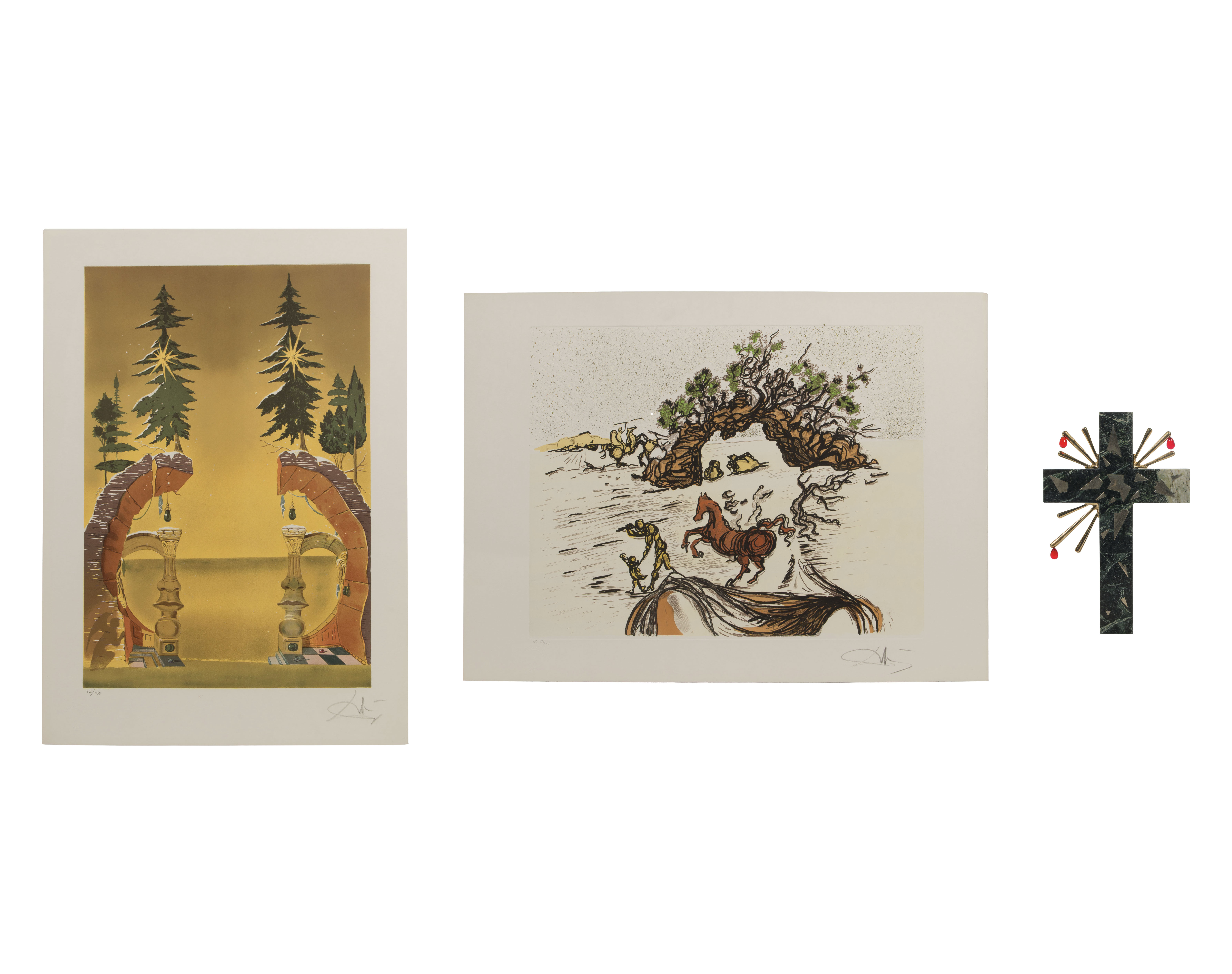 (3) total items including a 1984 color etching ‘Horses on Shore’ HC #29/45 and a lithograph ‘Christmas (Noel)’ #72/150, both pencil signed lower right, numbered and blindstamped lower left, thumbprint and code number lower right verso, both unframed; together with a 1980 ‘Crucifixion’ marble cross having metal attachments and amber colored bead pendants, engraved signature to the metal form just below cross piece, brass label on back reading #213/375 and dated, (14.5 x 9.5 x 1.5 inches) accompanied by a Dalart prospectus sheet