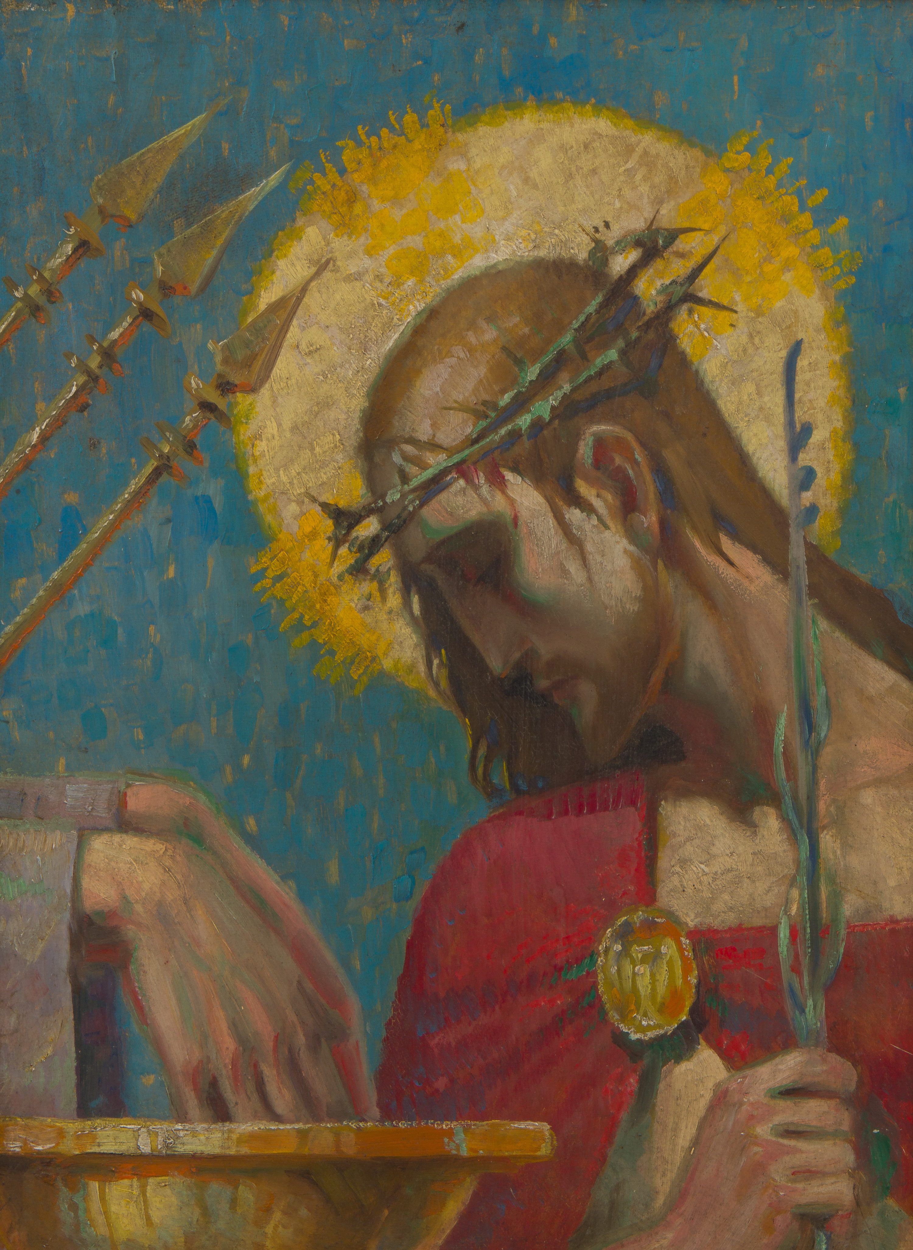 Undated, unsigned, a depiction of Christ in his crown of thorns at Pilate’s knee, in a painted gold-tone frame