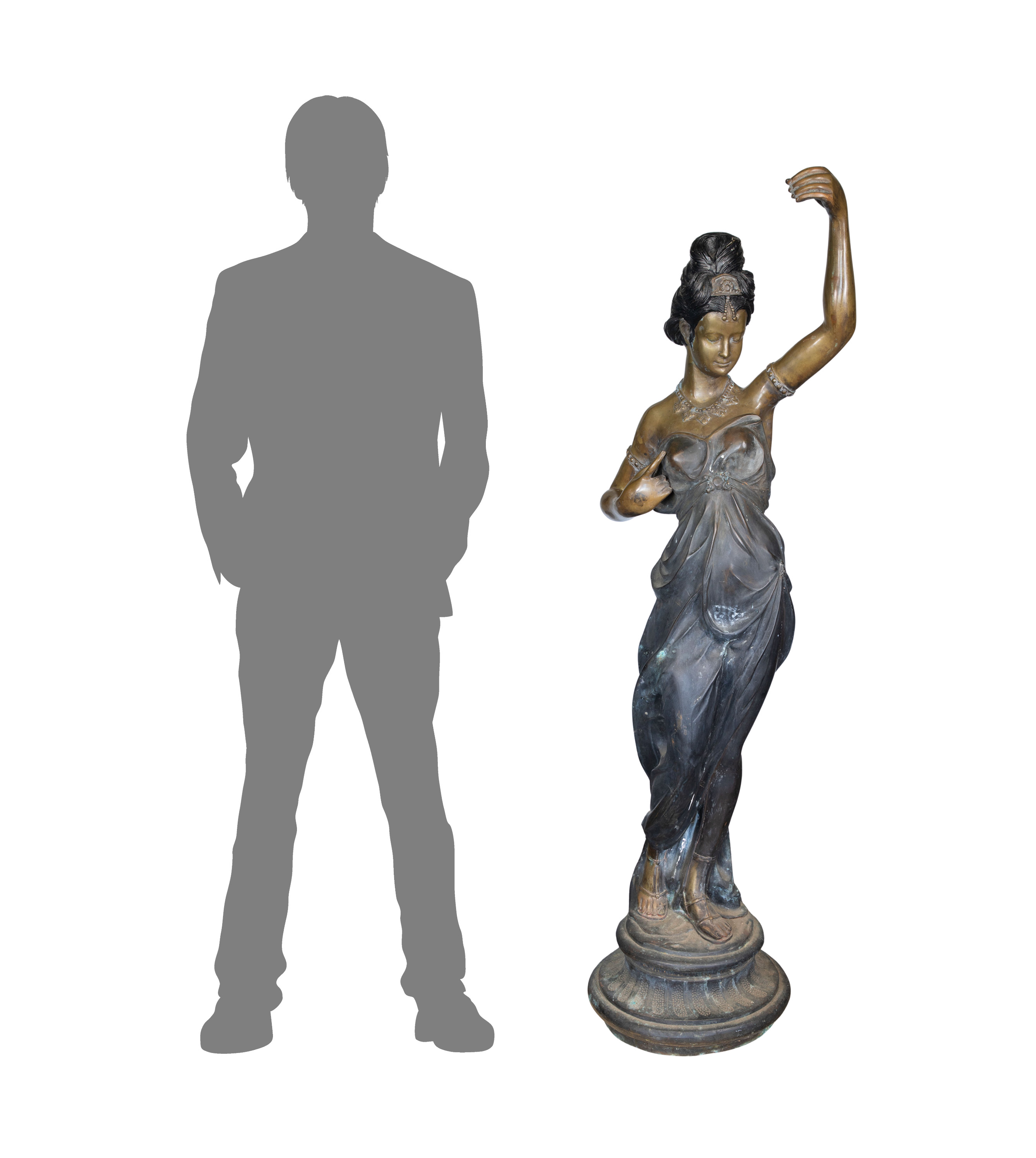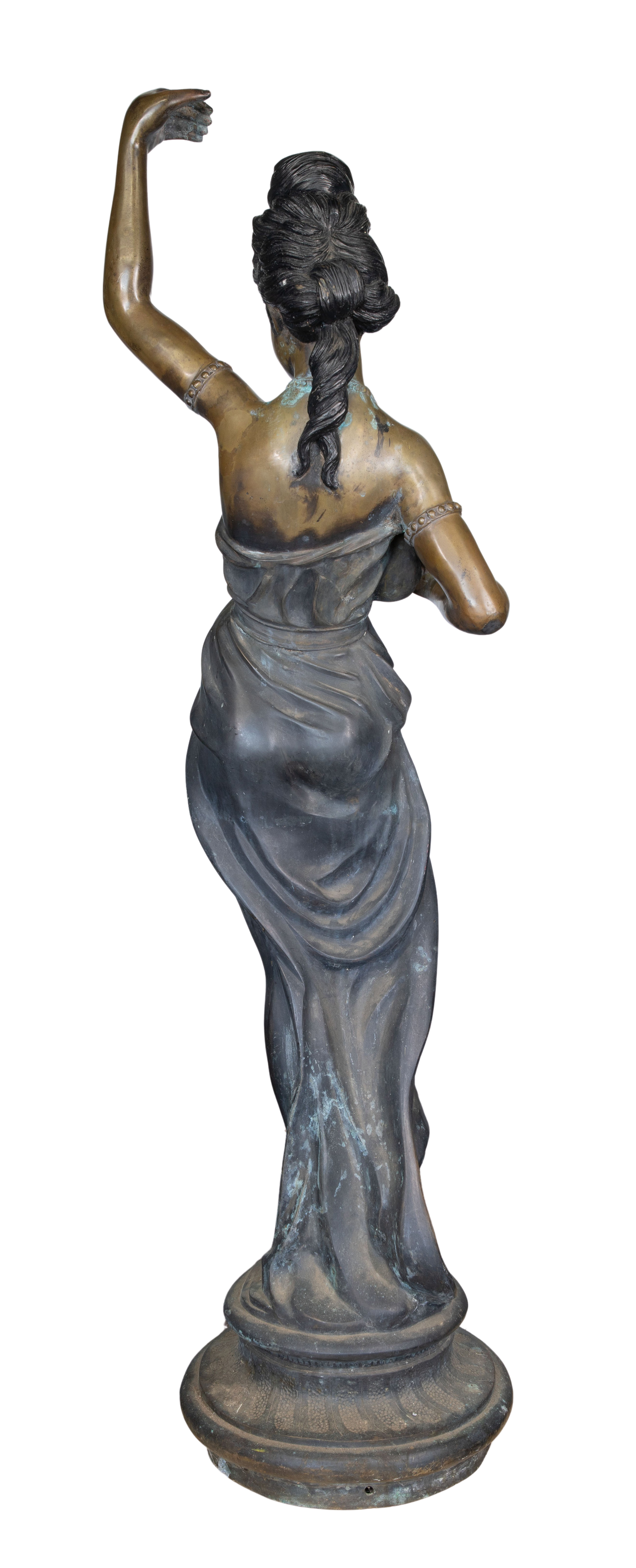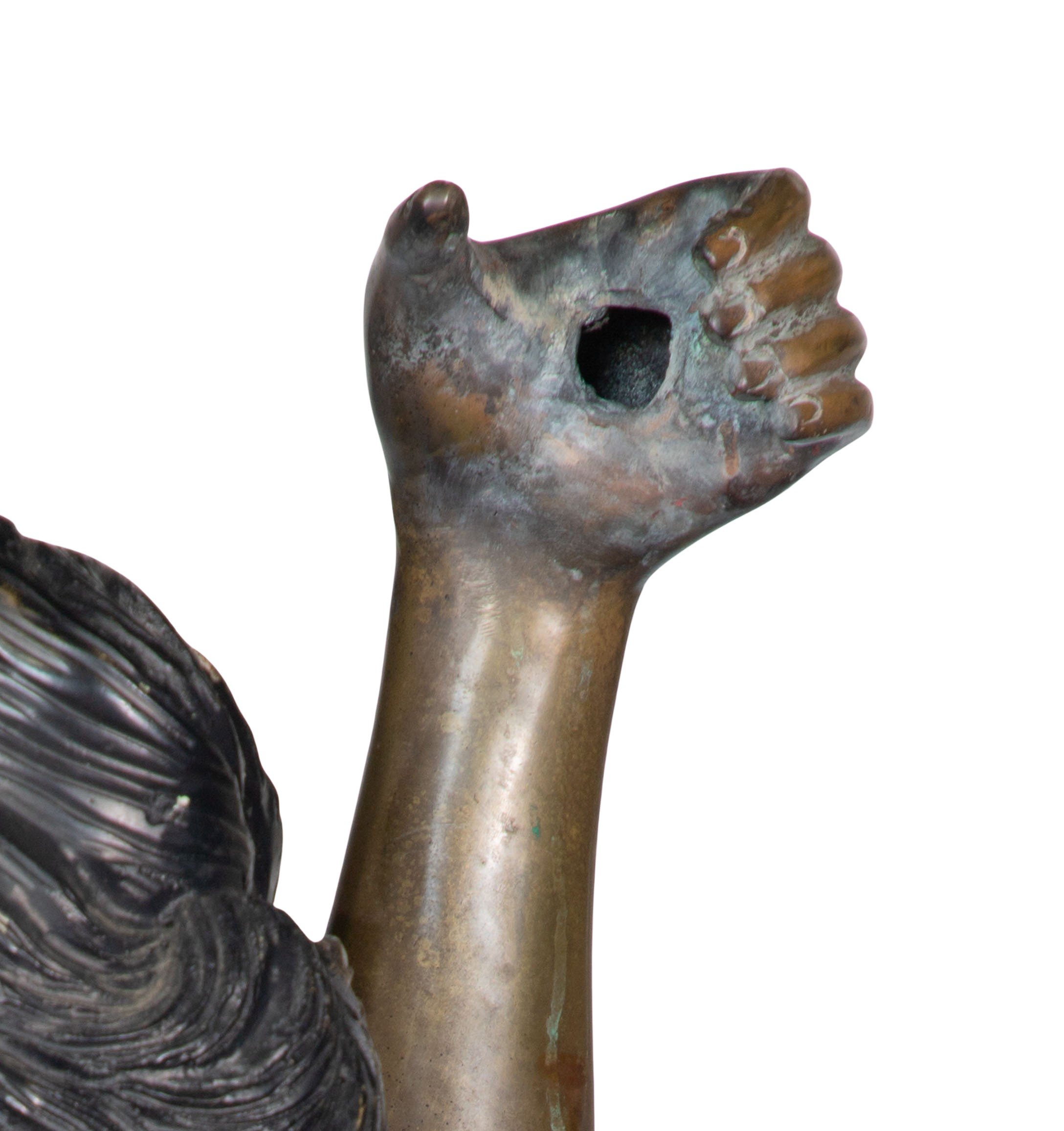 Condition: finish wear, scratches, paint splatter, verdigris, dirt accumulation, a hole in raised hand, appearing to have been a lamp