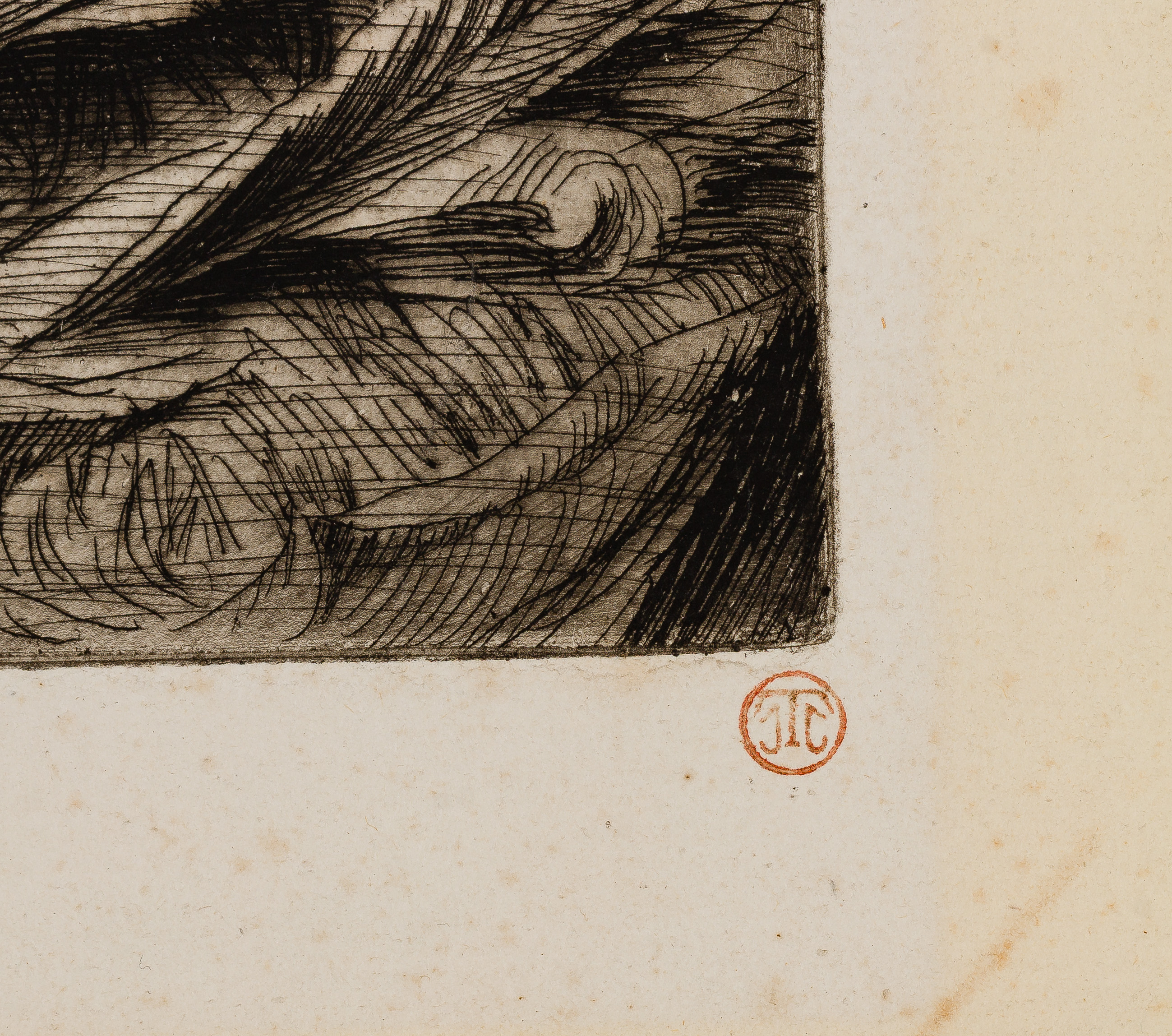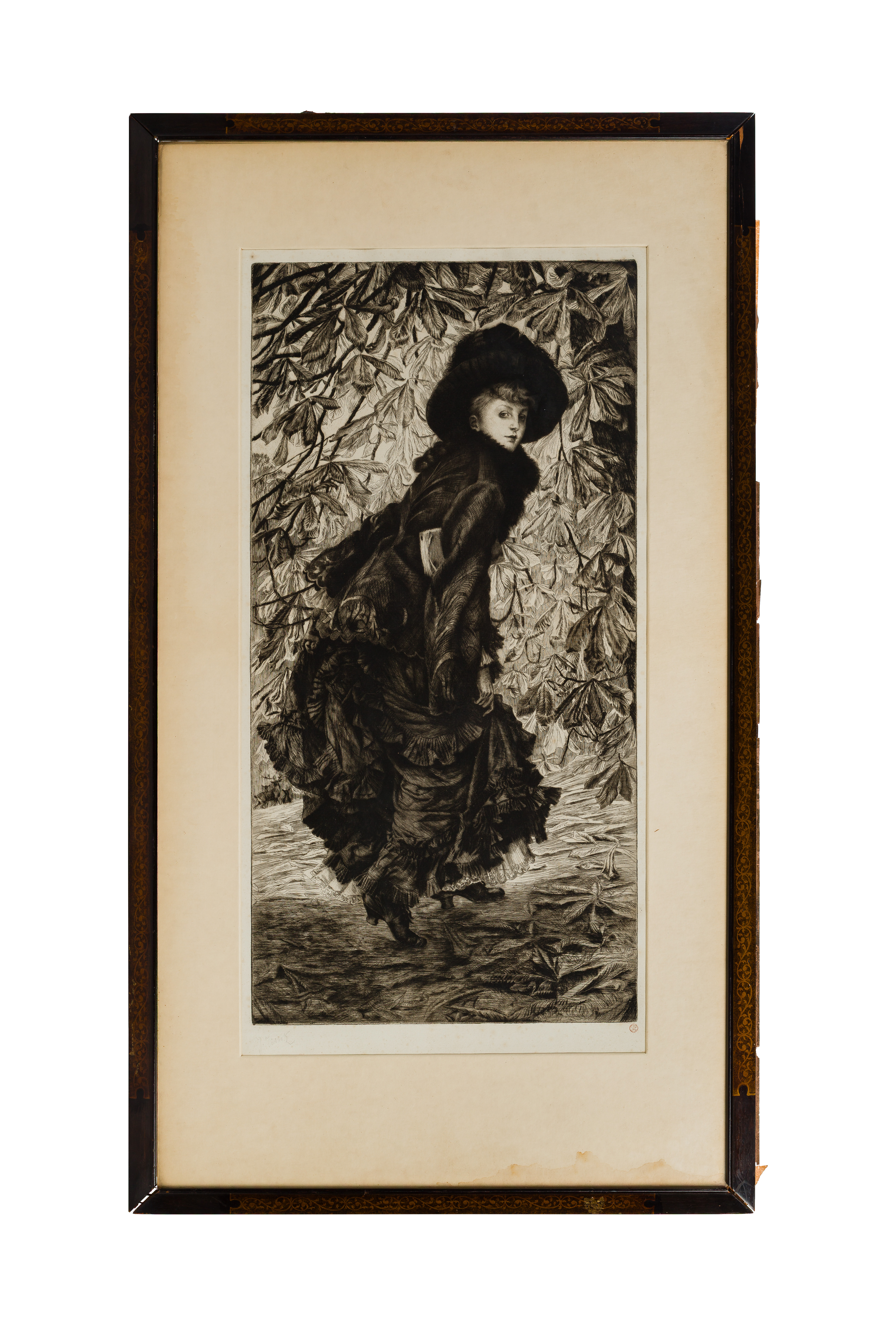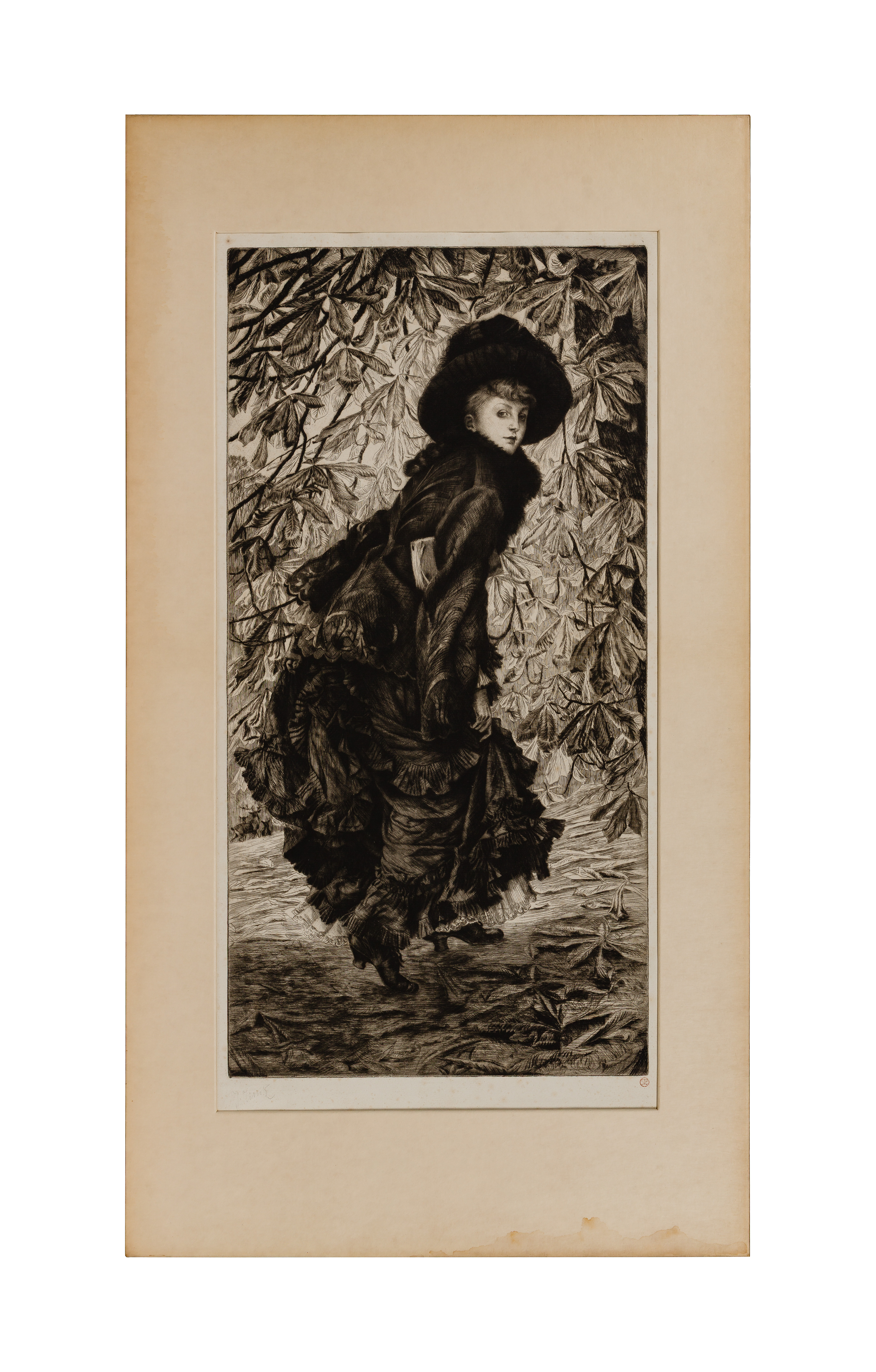 1878, pencil signed lower left, artist’s red ink stamp lower right, etching and drypoint on antique cream laid paper, depicting an elegantly dressed lady walking into a wooded area, matted under glass in a wood frame, illegible annotation verso having the date 1882