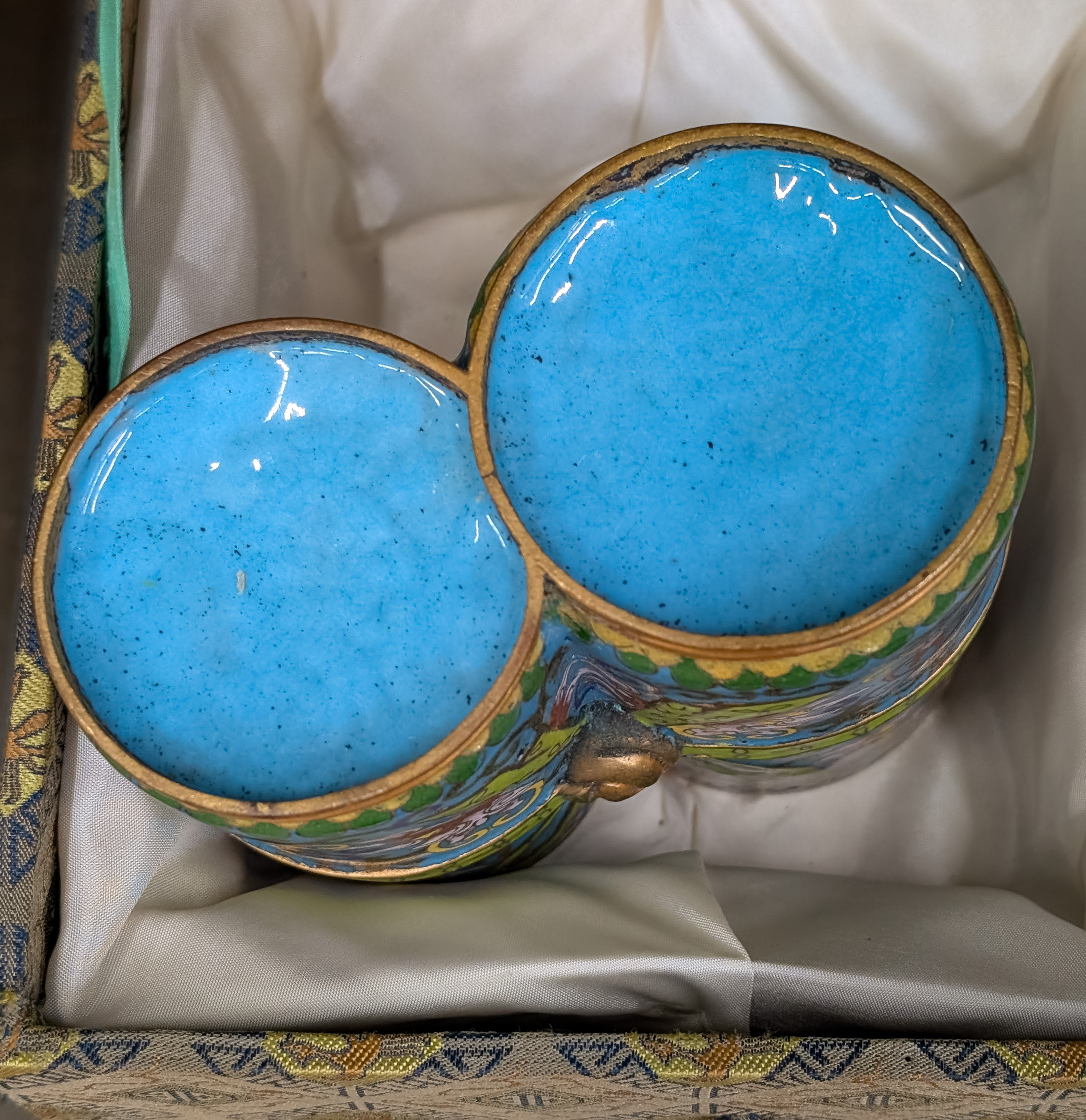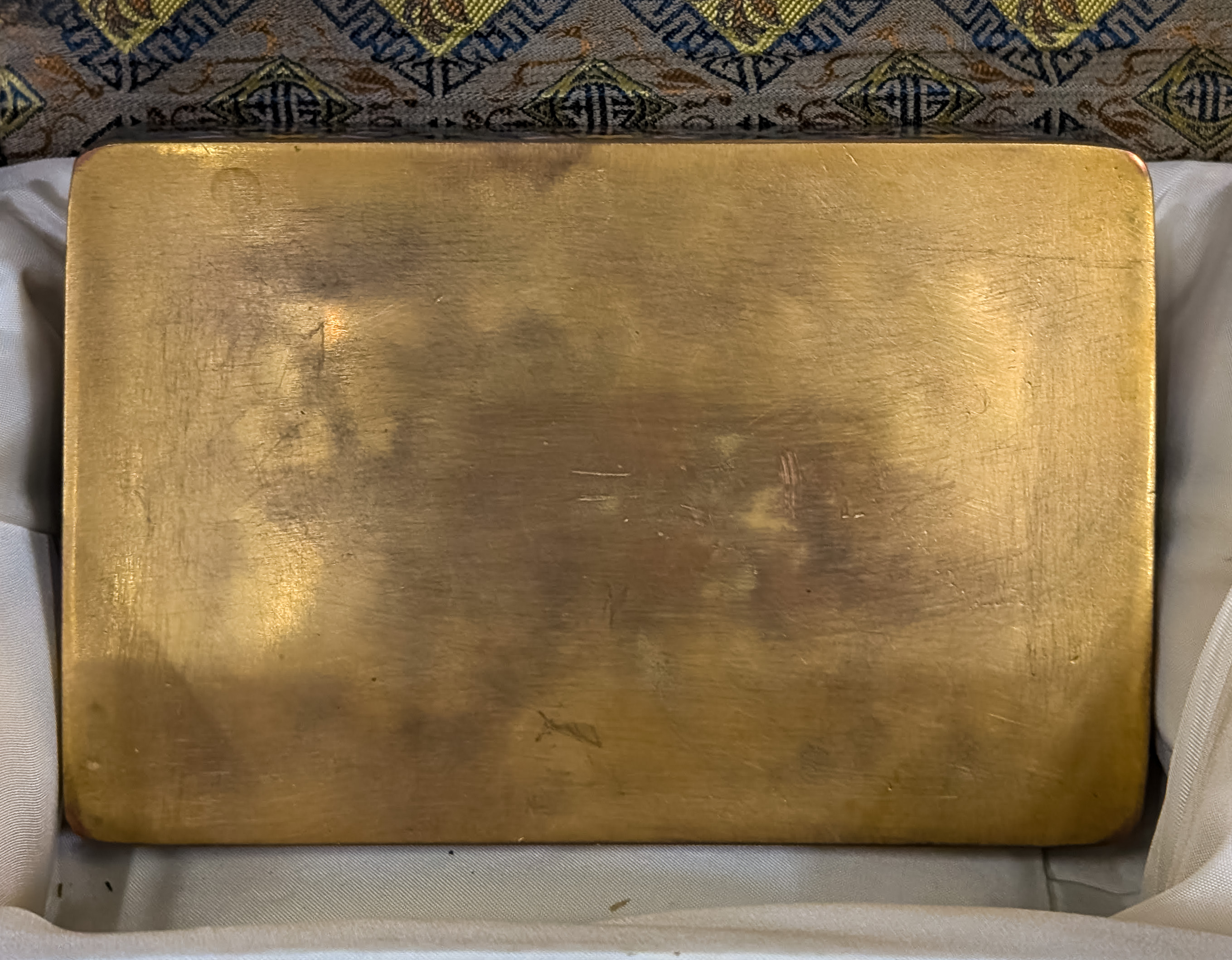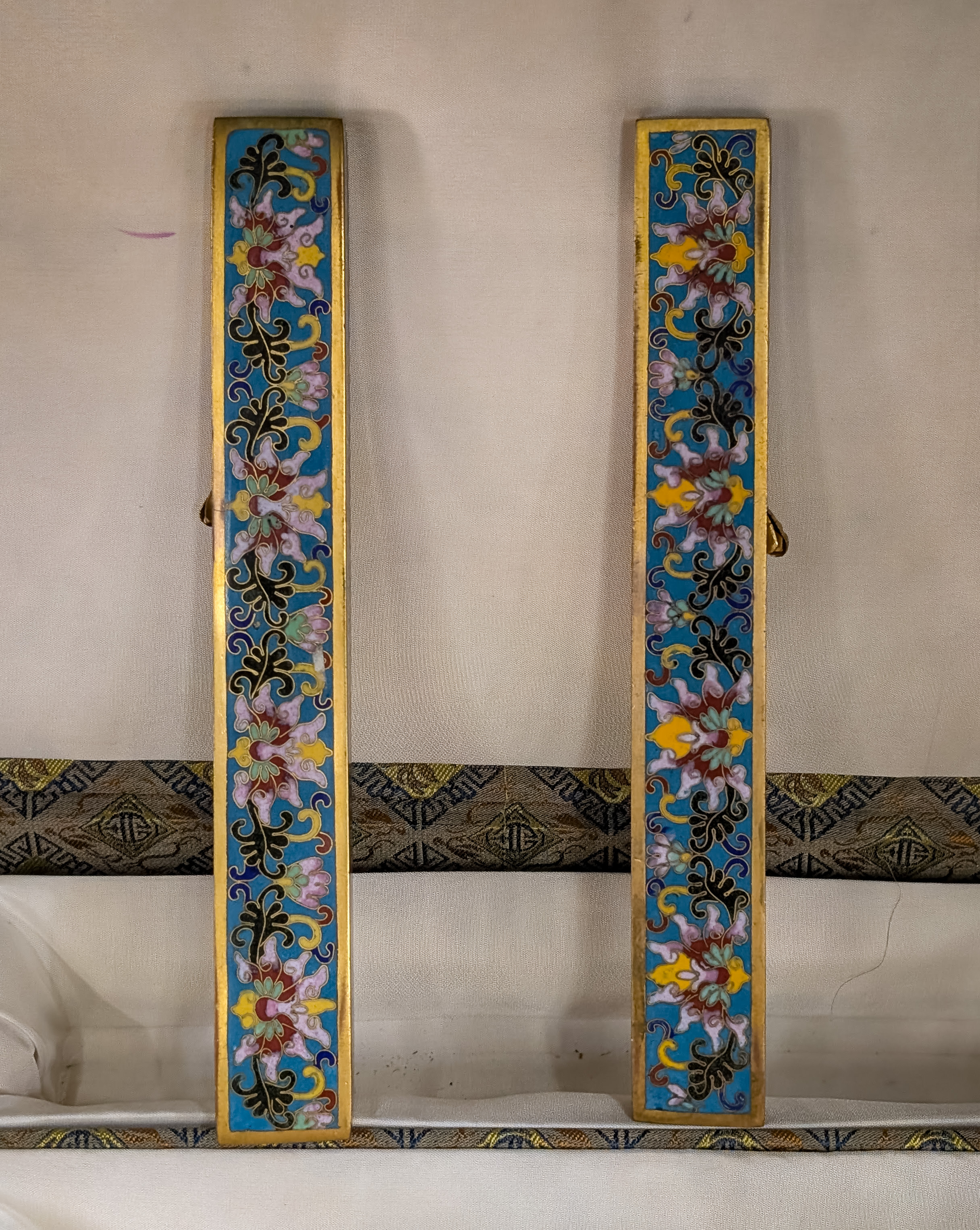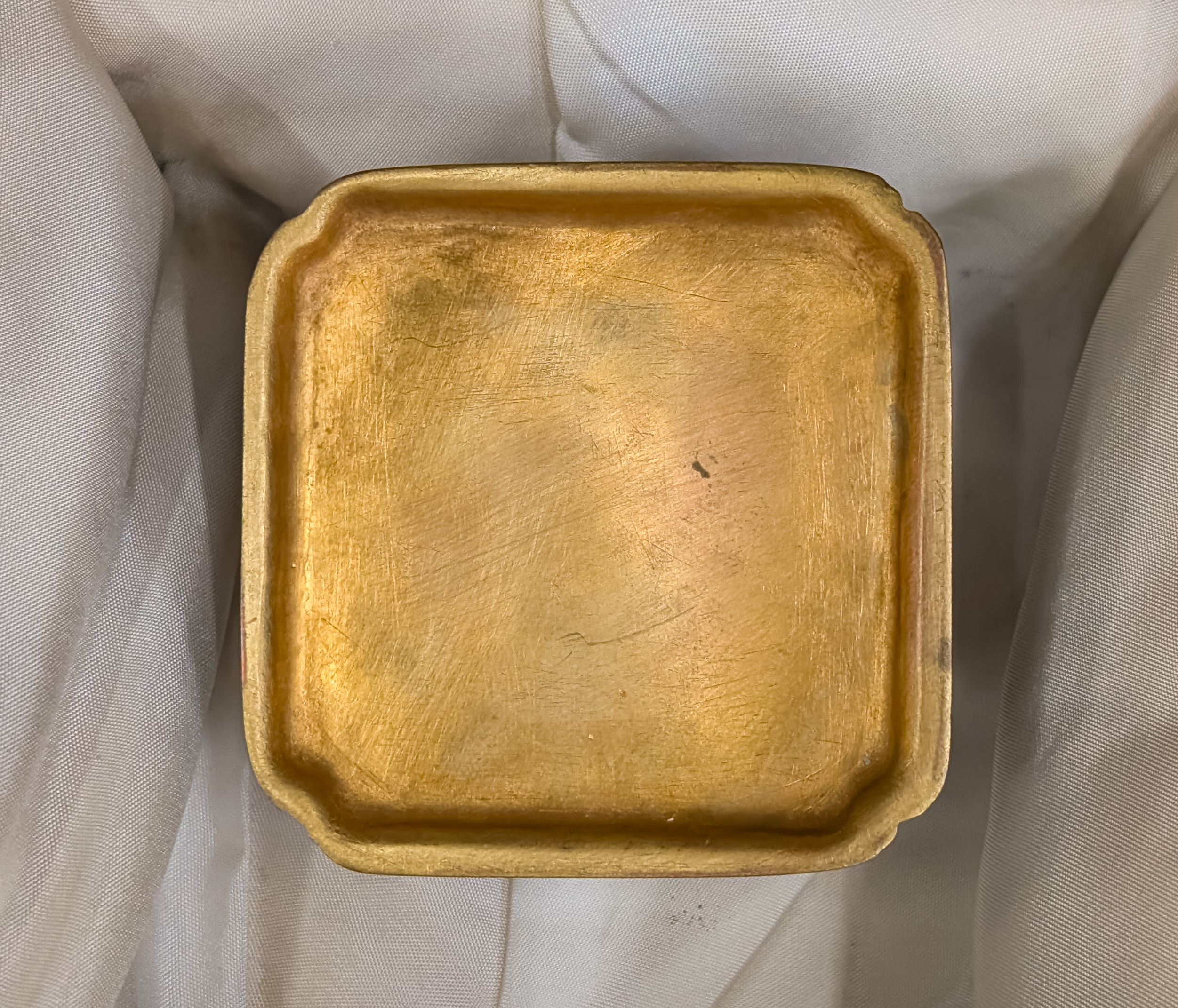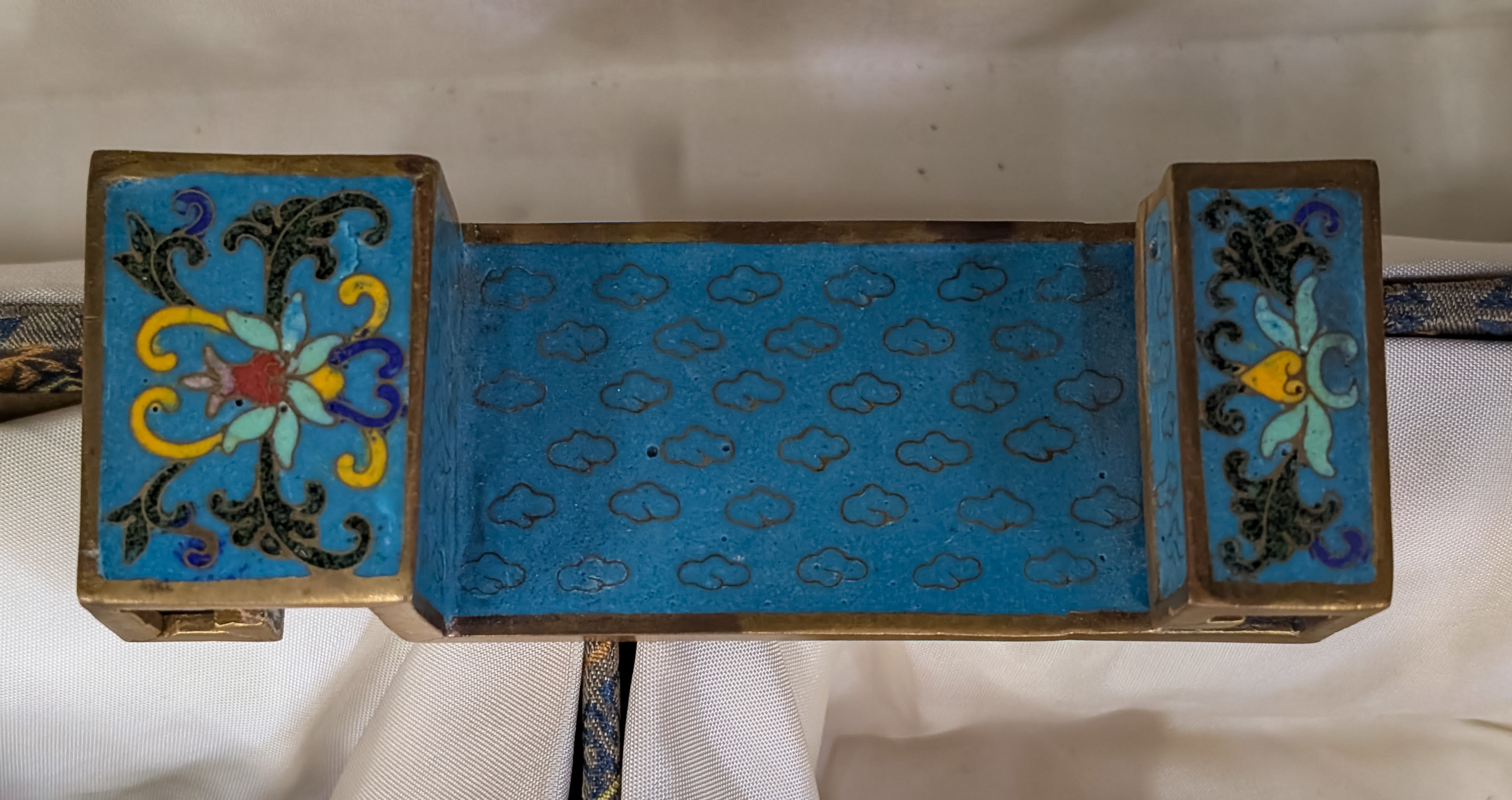 (8) items, many having gilt bronze dragon finial / attachments, including an ink stone box, a double brush pot, (2) scroll weights, a pen rest, a chop seal holder / box, a water dropper as well as a silk-covered and cloth-lined partitioned presentation / storage box