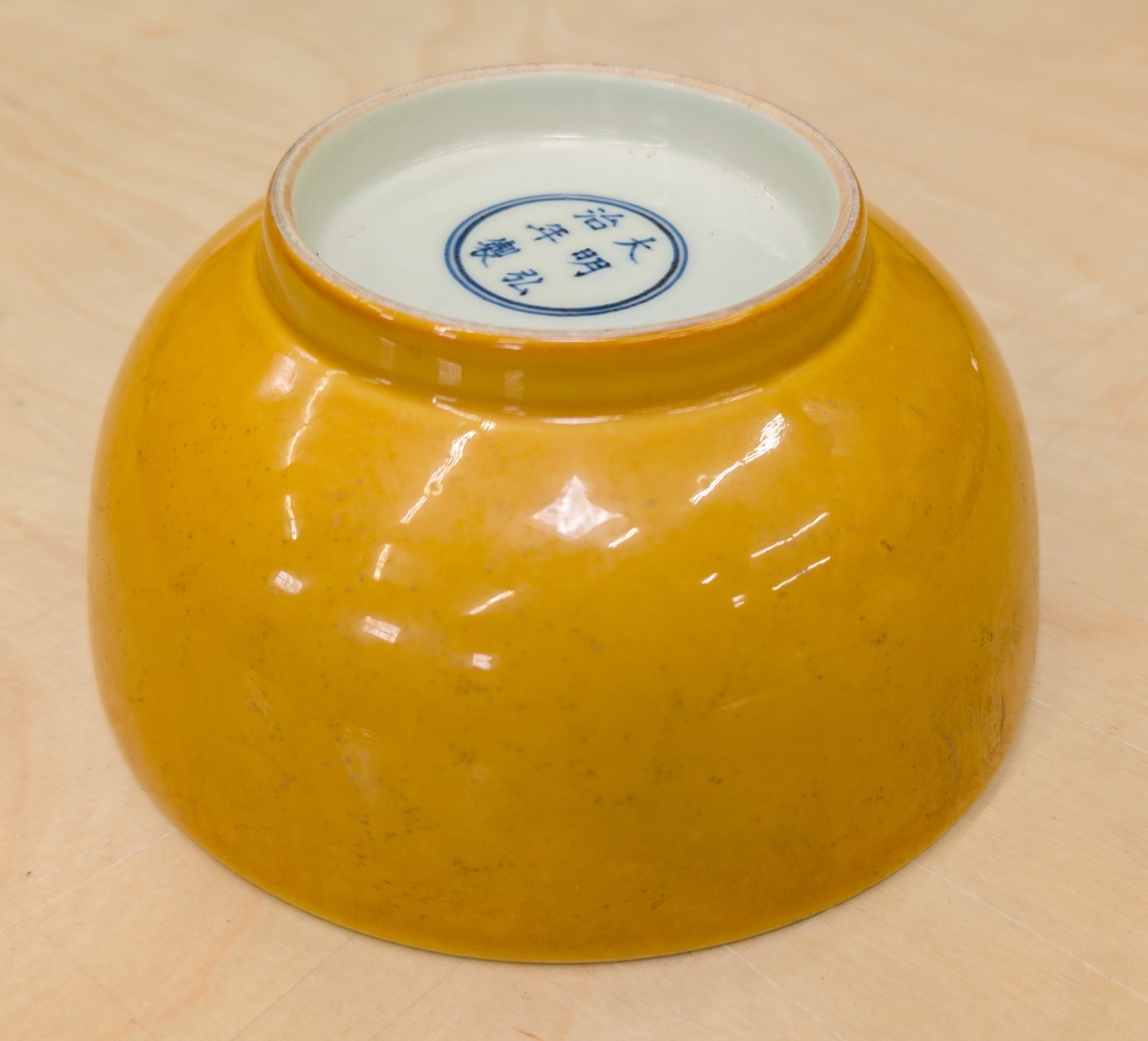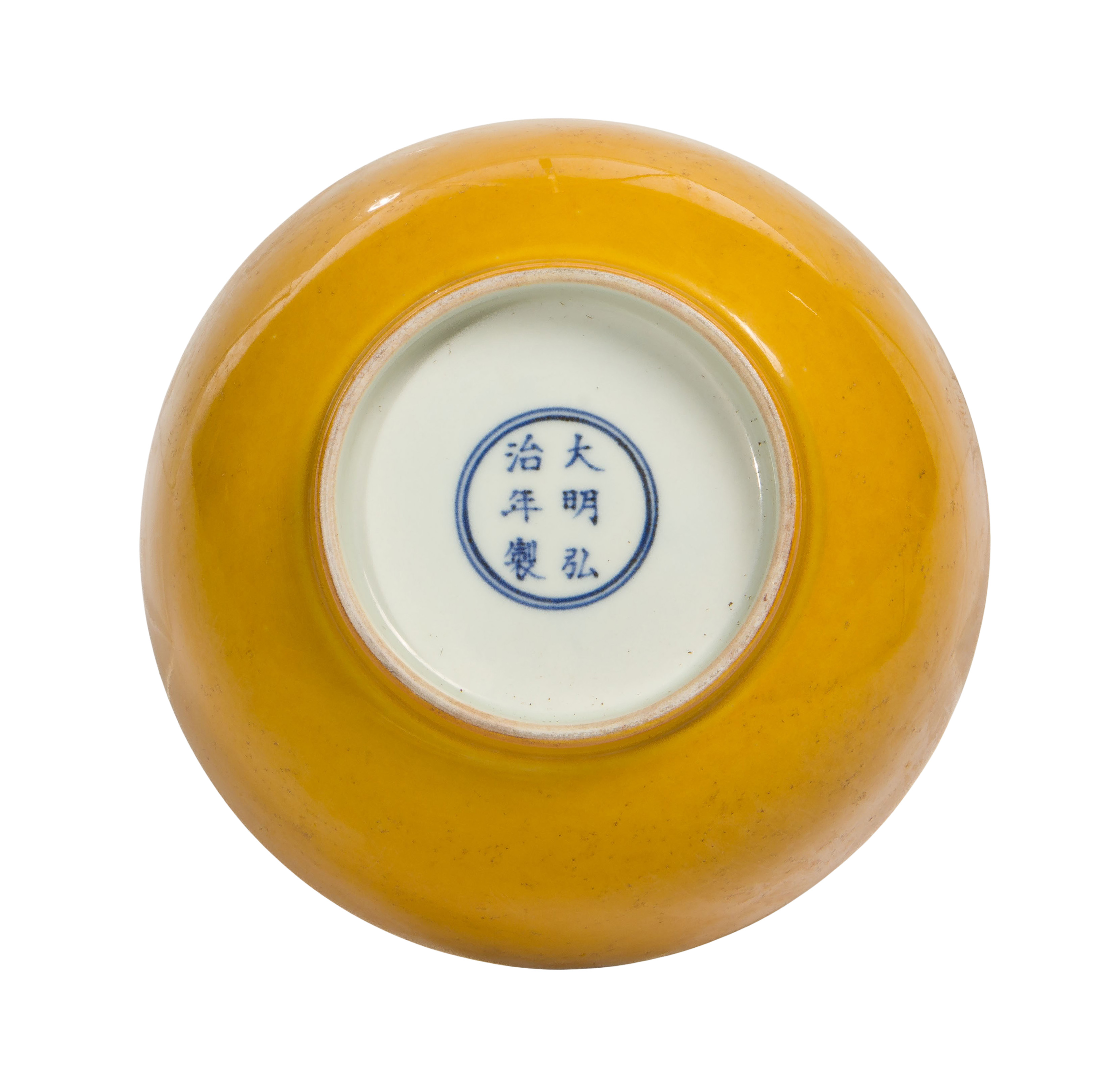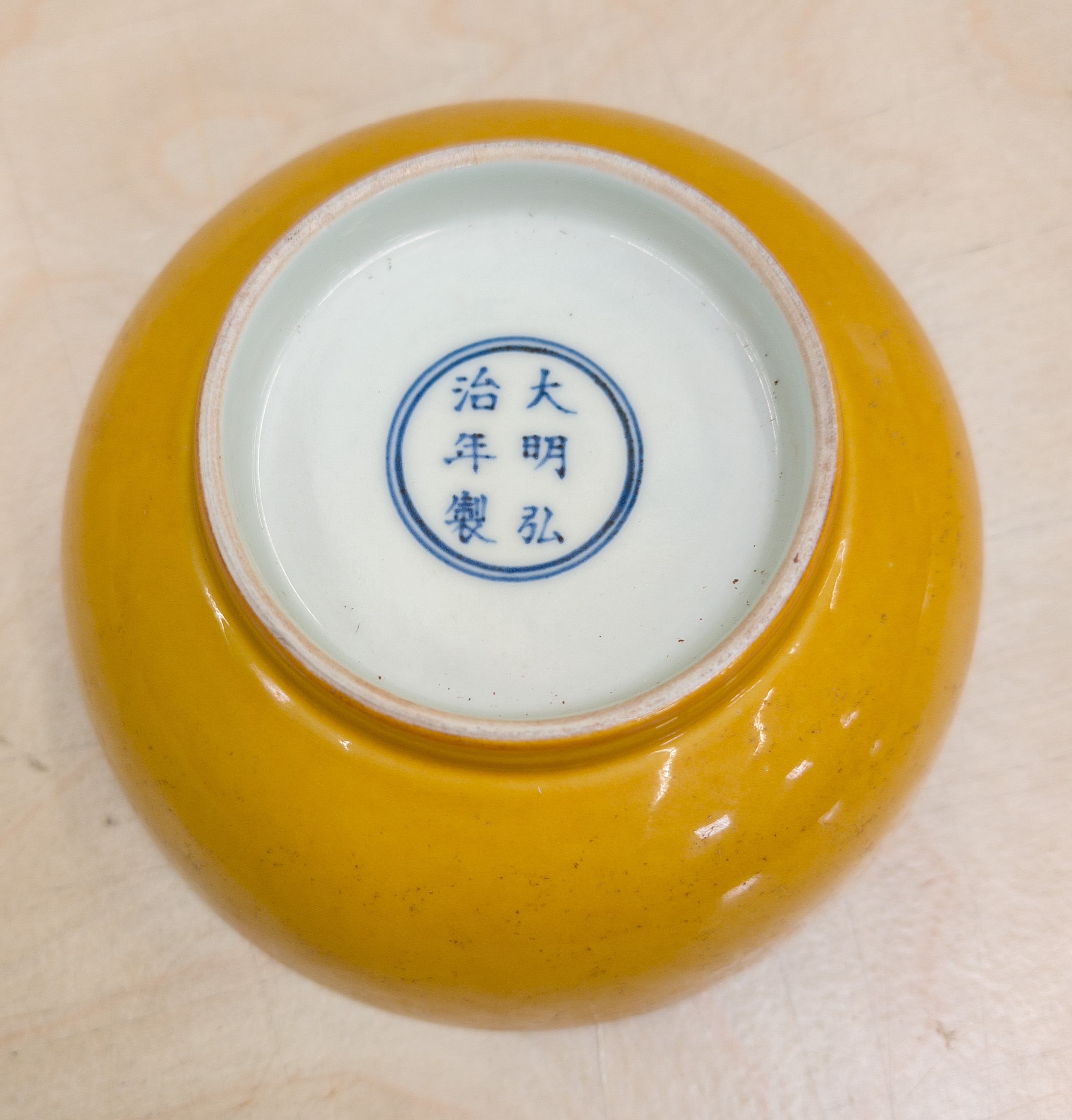 A bowl having an egg yolk colored glaze with a blue underglaze six-character mark within concentric circles on a white base translates to ‘Made during the Hongzhi reign of the great Ming Dynasty’