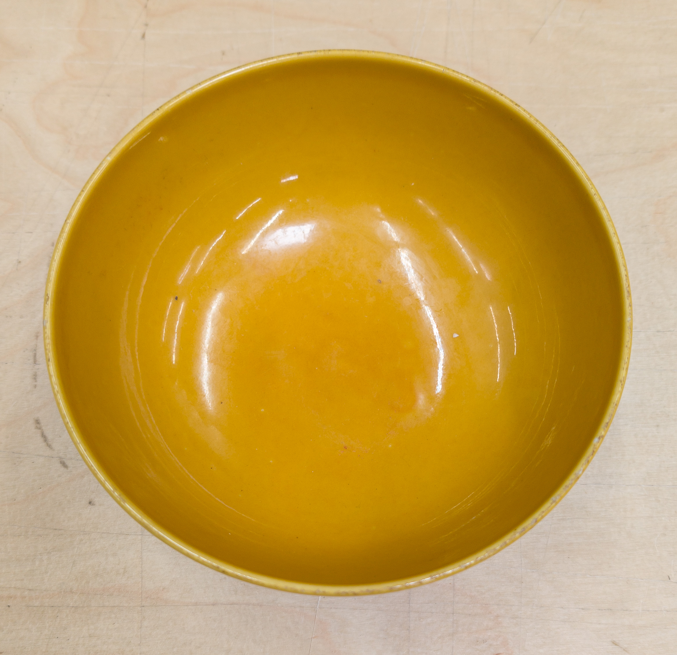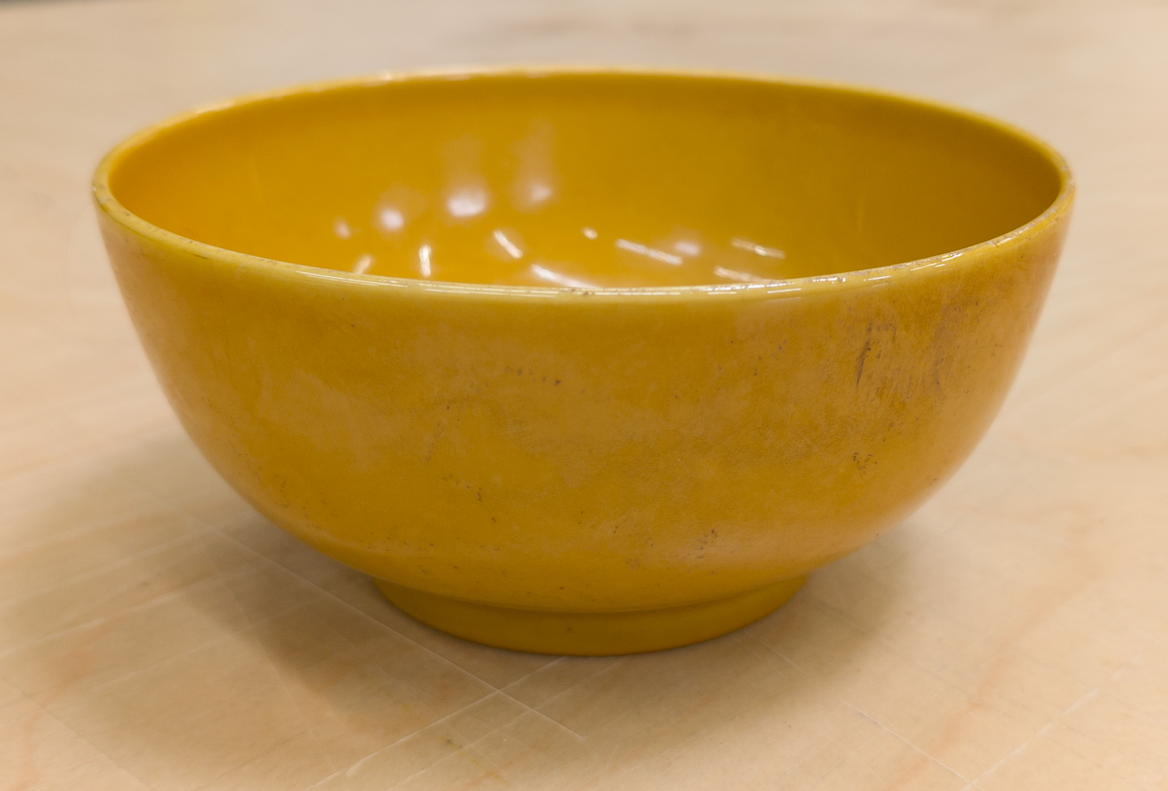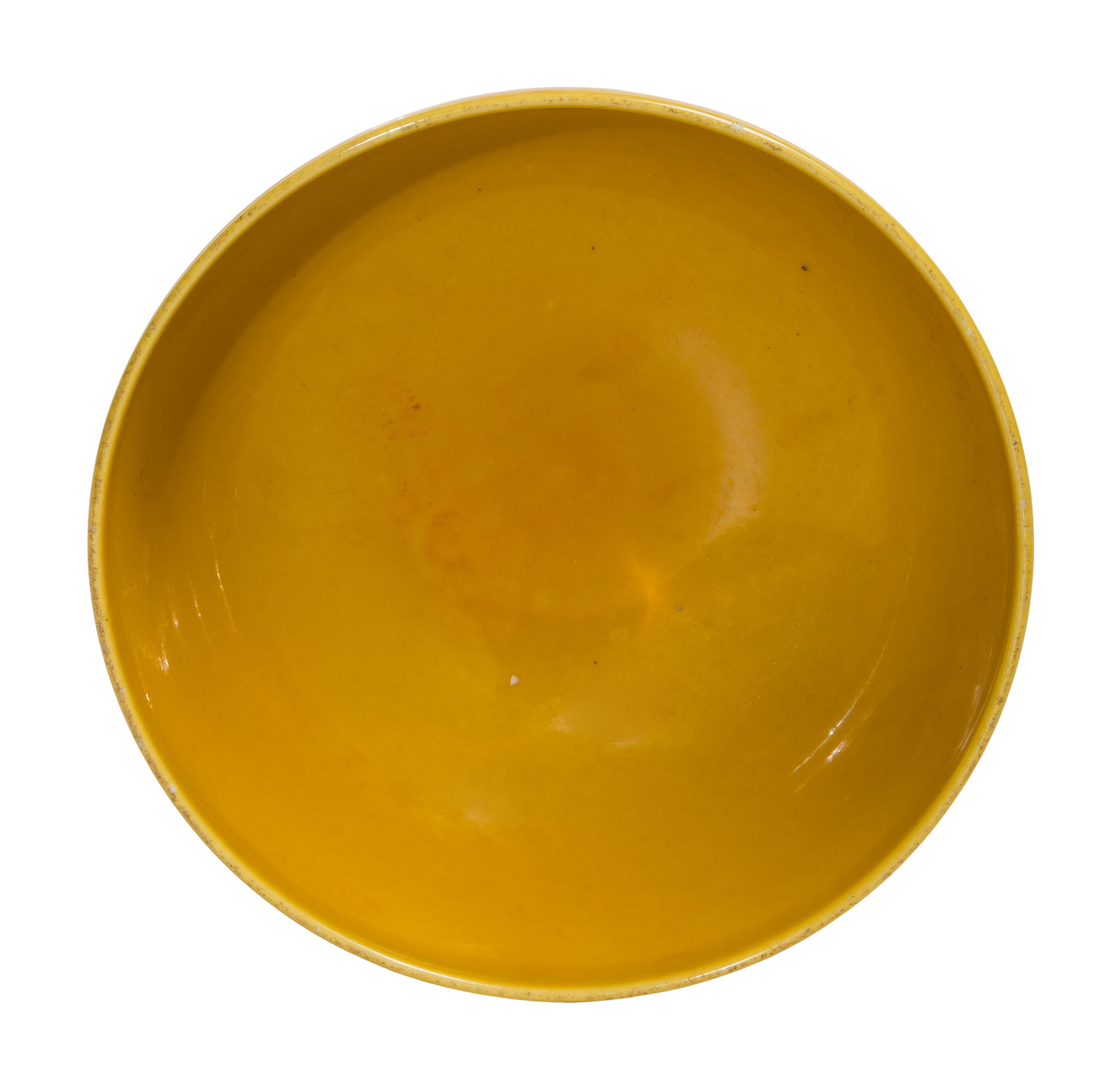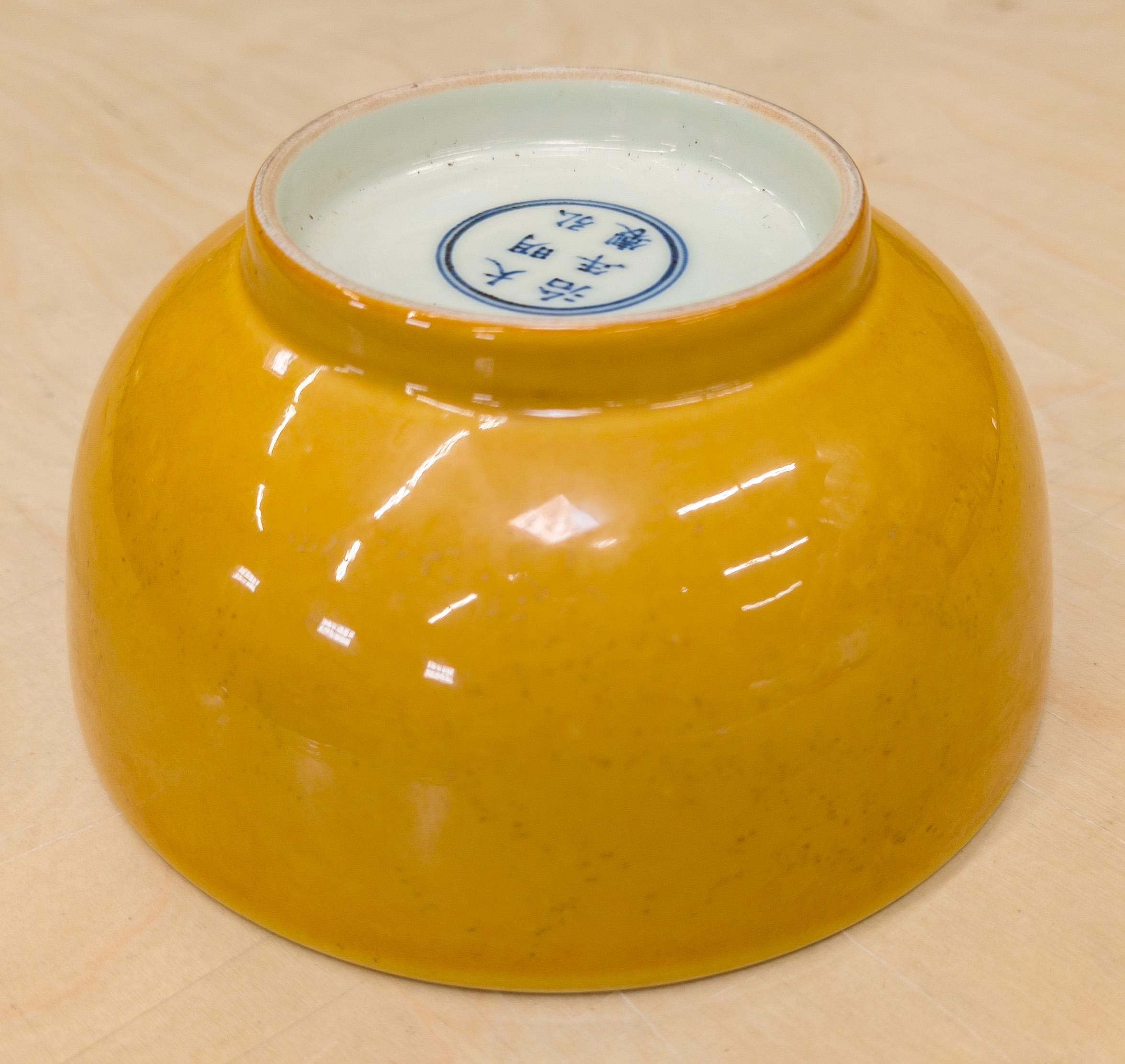 A bowl having an egg yolk colored glaze with a blue underglaze six-character mark within concentric circles on a white base translates to ‘Made during the Hongzhi reign of the great Ming Dynasty’